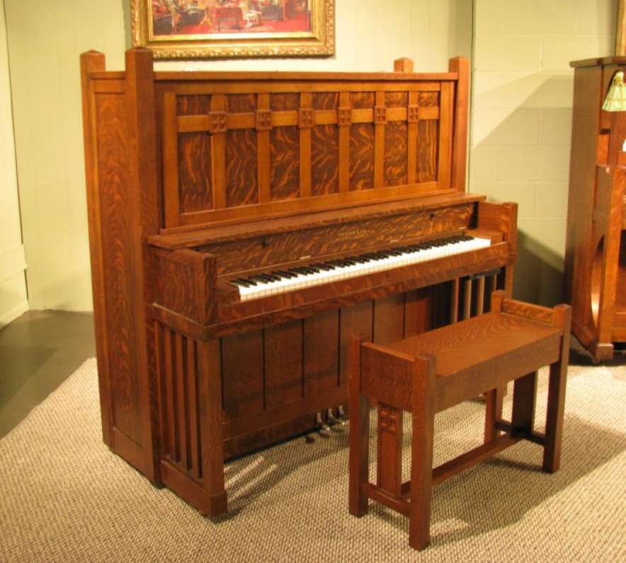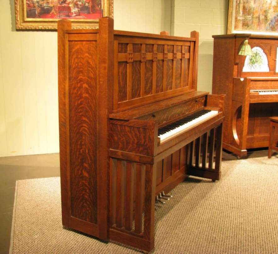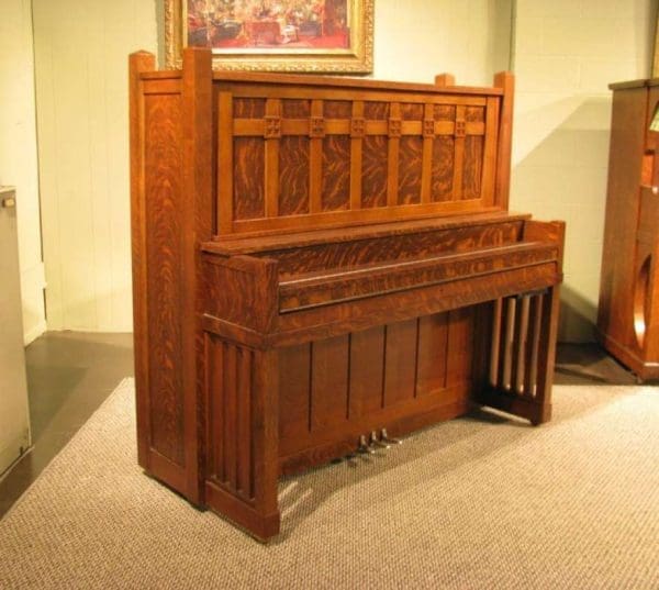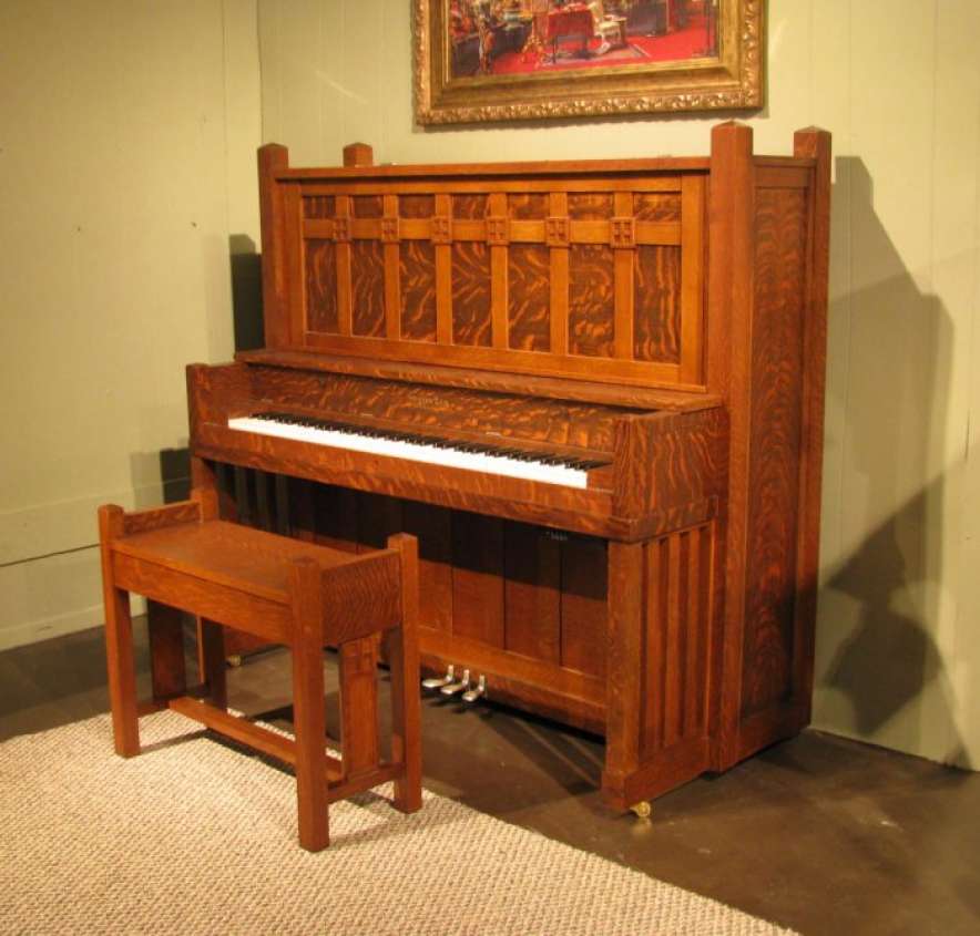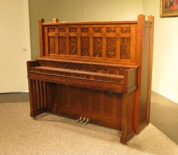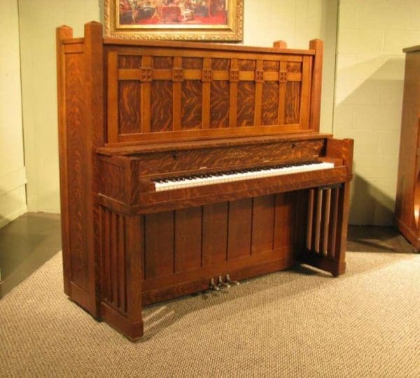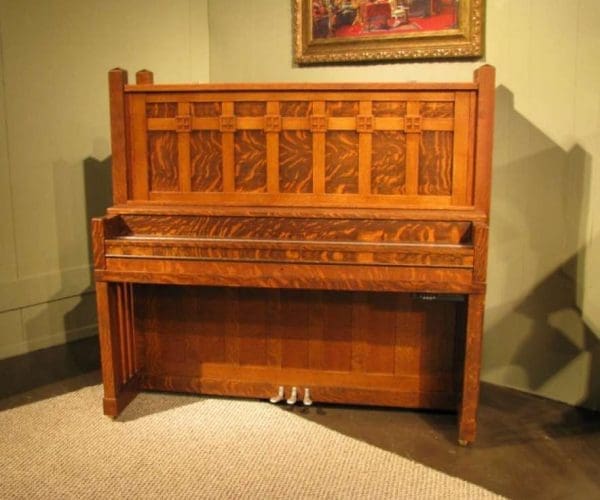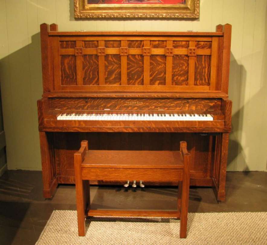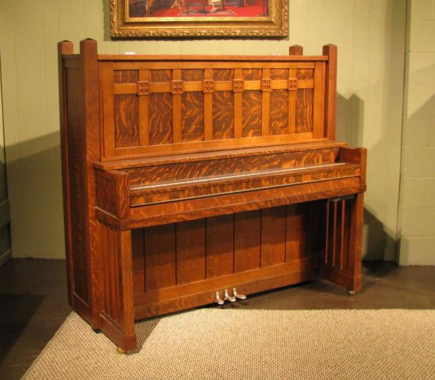 This is a very unique Foster Arts & Crafts upright piano in a stunning quartered oak Craftsman style cabinet.