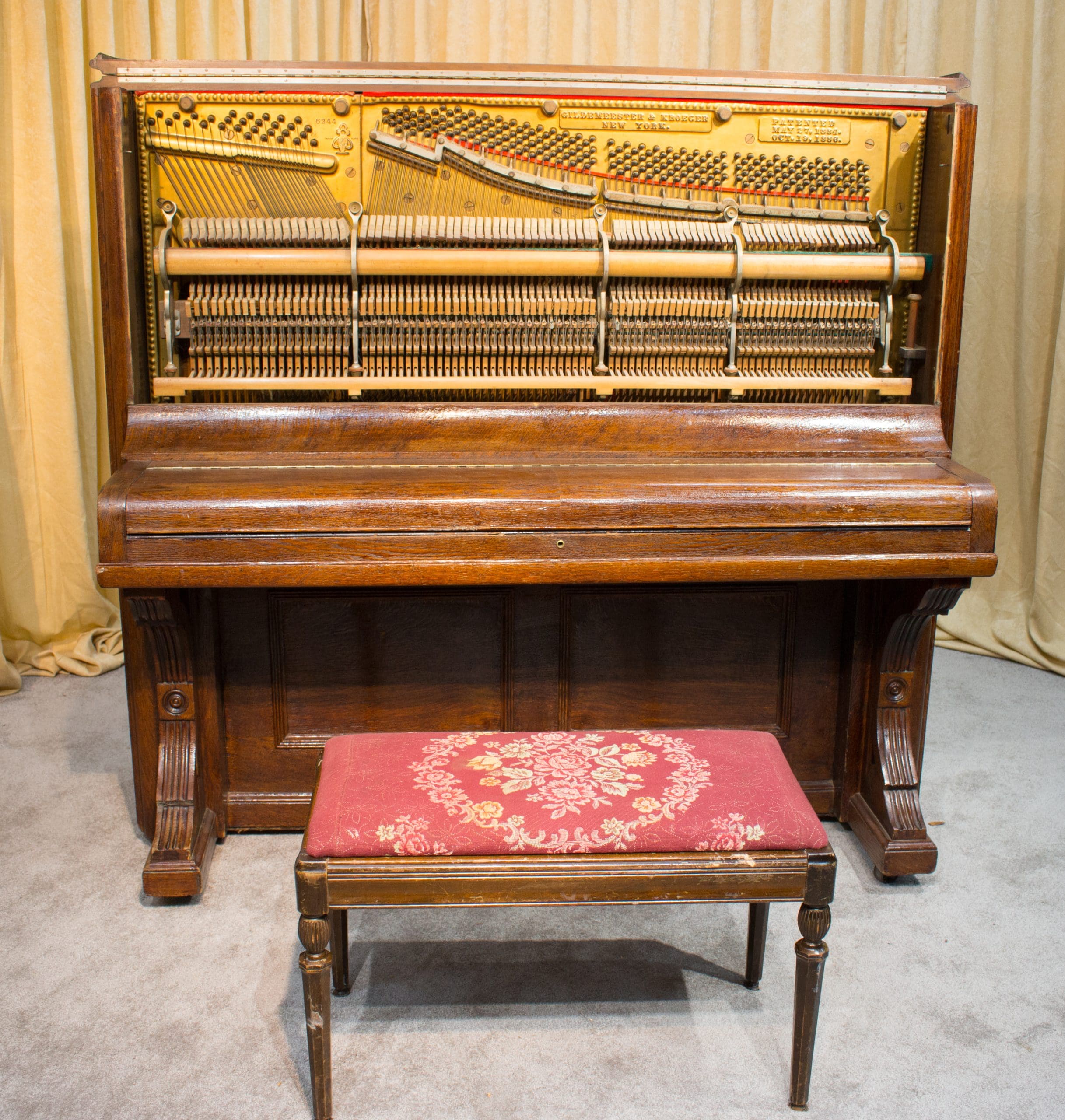 This piano will be restored to like-new condition, inside and out. It is a large, full size “upright grand” piano and will have the sound of a full grand piano after professional restoration. If desired, this piano can be equipped with the Pianomation player system which will allow the instrument play by itself by streaming music live on an iPod, computer, iPad, etc. Thousands of song titles are available.