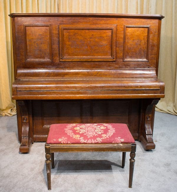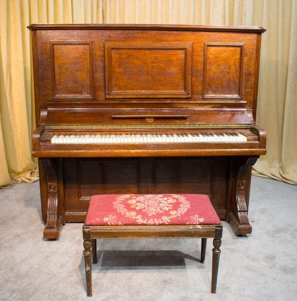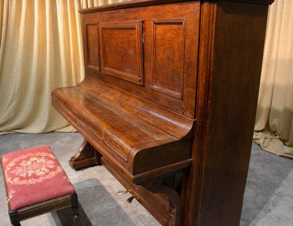 This piano is made of beautiful quarter sawn oak wood and is of the Eastlake Victorian style. Imported dark and exotic woods were much more popular in furniture and piano building during this era. Since oak was considered an inexpensive domestic wood, it was rarely used in high-end furniture and pianos during the Victorian period. Oak Victorian pianos like this were built in small numbers and are quite rare today. They are very desirable as a result.