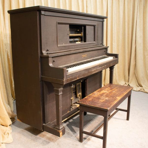 This piano is made of imported Honduran Mahogany wood under the old finish and is of the Colonial design. The instrument is a large, full-size “Upright Grand” with quite an impressive tone quality. While the piano was originally built to be pneumatically operated by manually pumping the foot pedals, it will be restored with the updated Pianomation player system which can stream over 10,000 songs from any smart device!