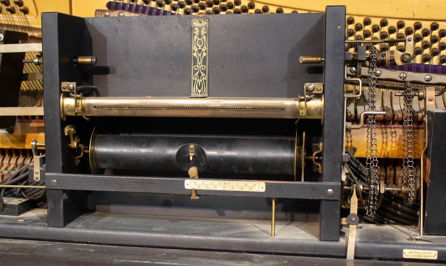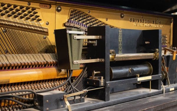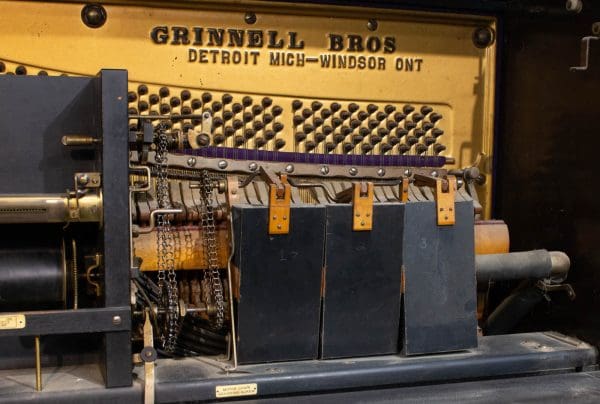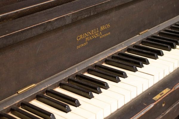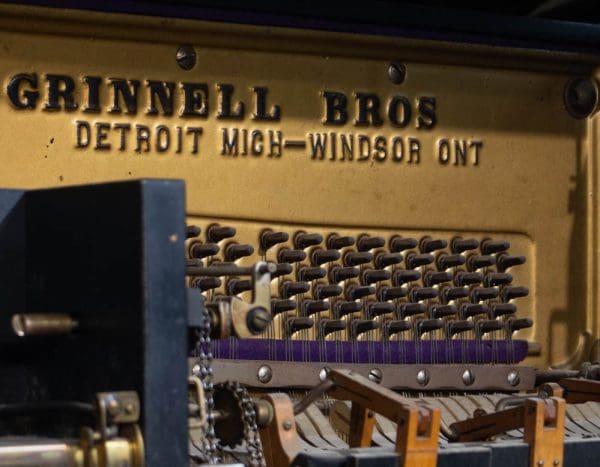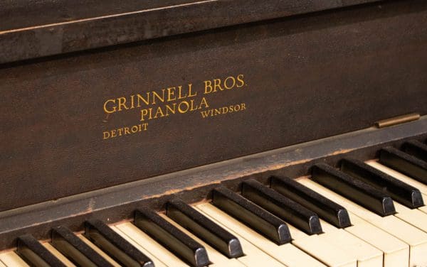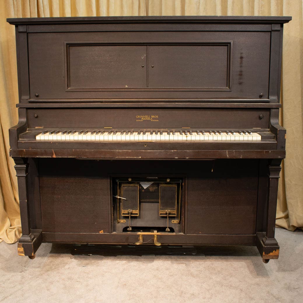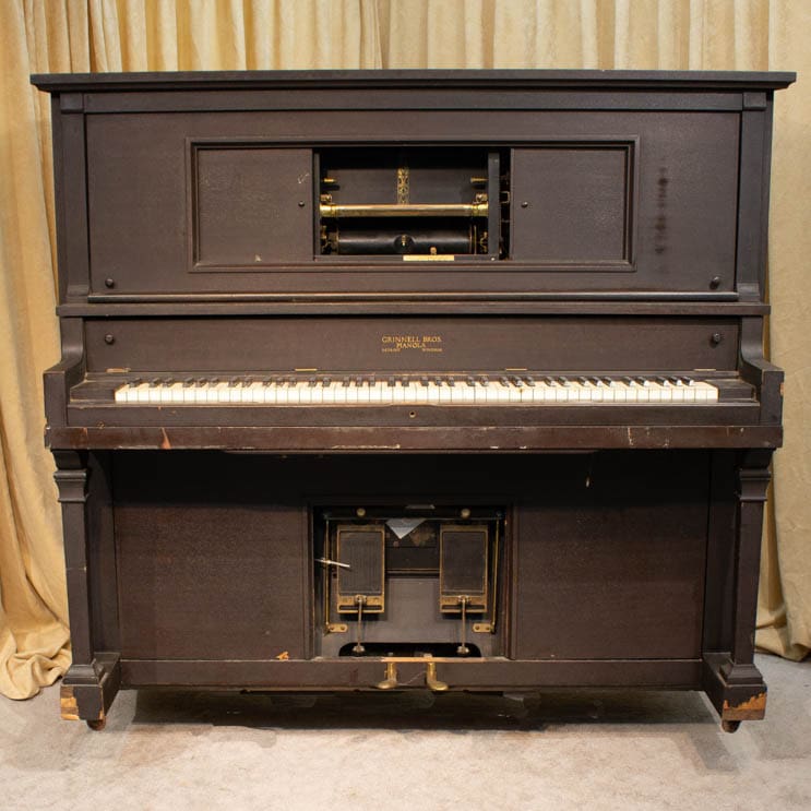 This is a classic full-size player piano built by Grinnell Brothers of Detroit, Michigan. Instruments by Grinnell Brothers were known to be of very high quality and craftsmanship. Grinnell Brothers was one of the few American piano manufacturers to survive the Great Depression without being absorbed into a larger conglomerate. The original firm built pianos until the 1960s.