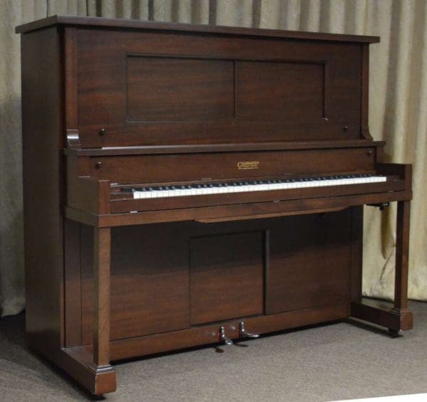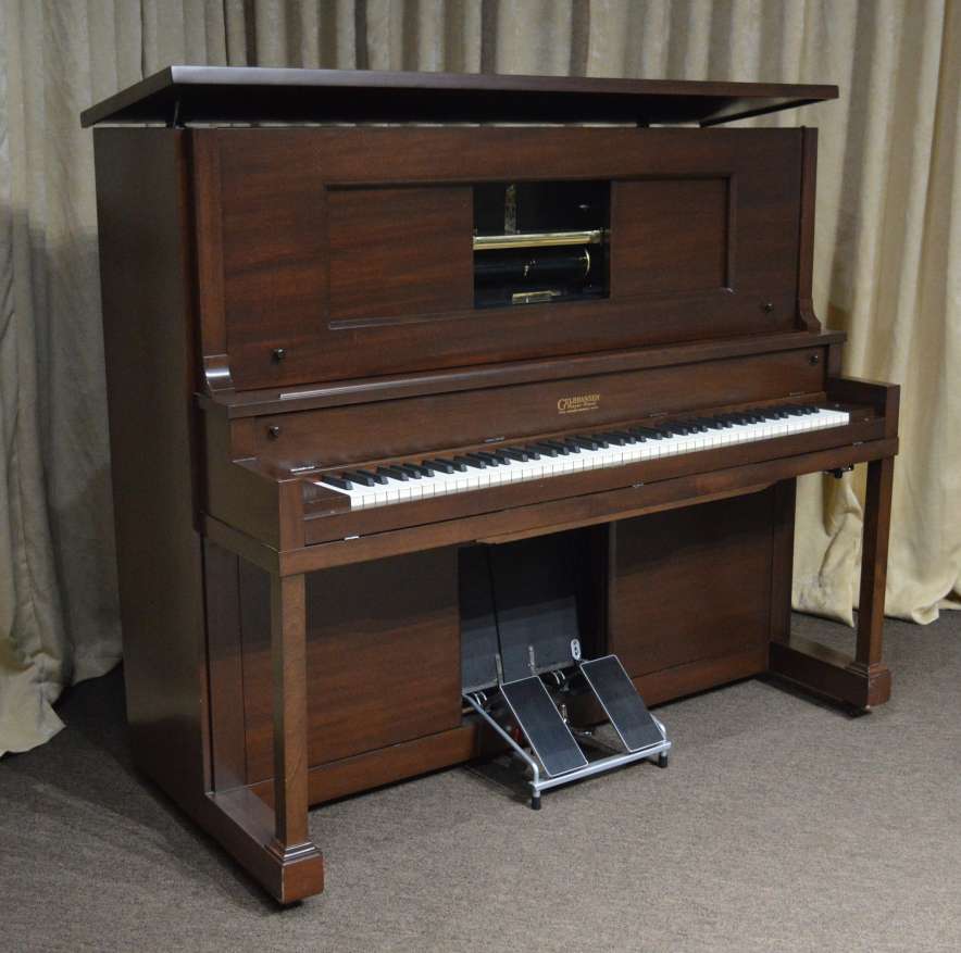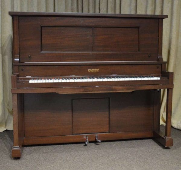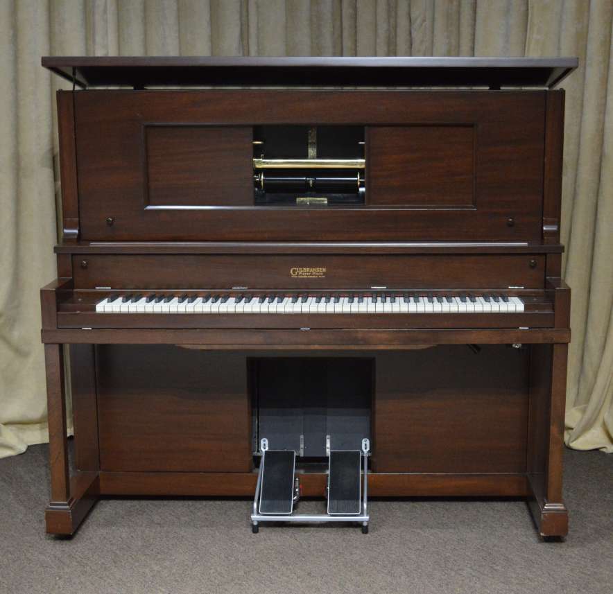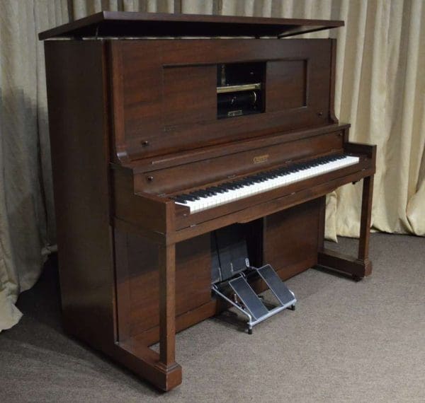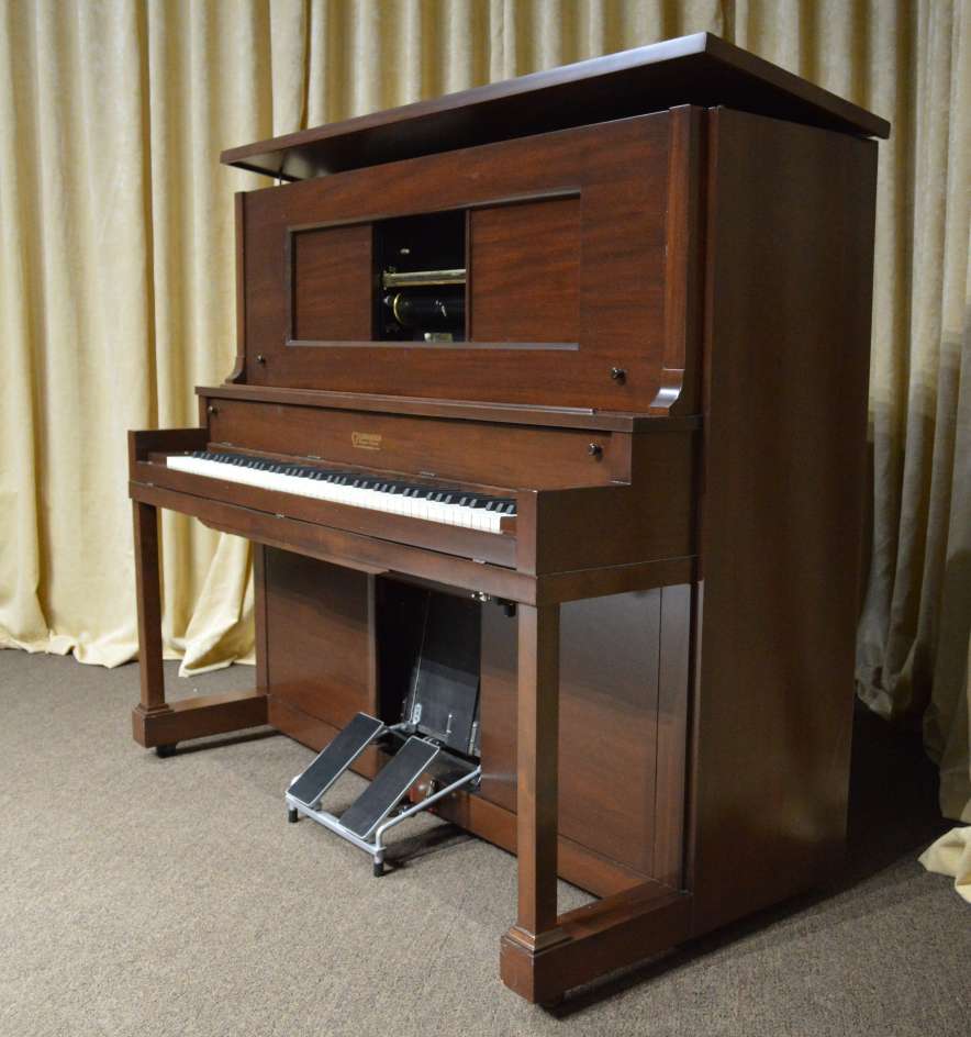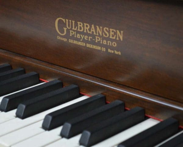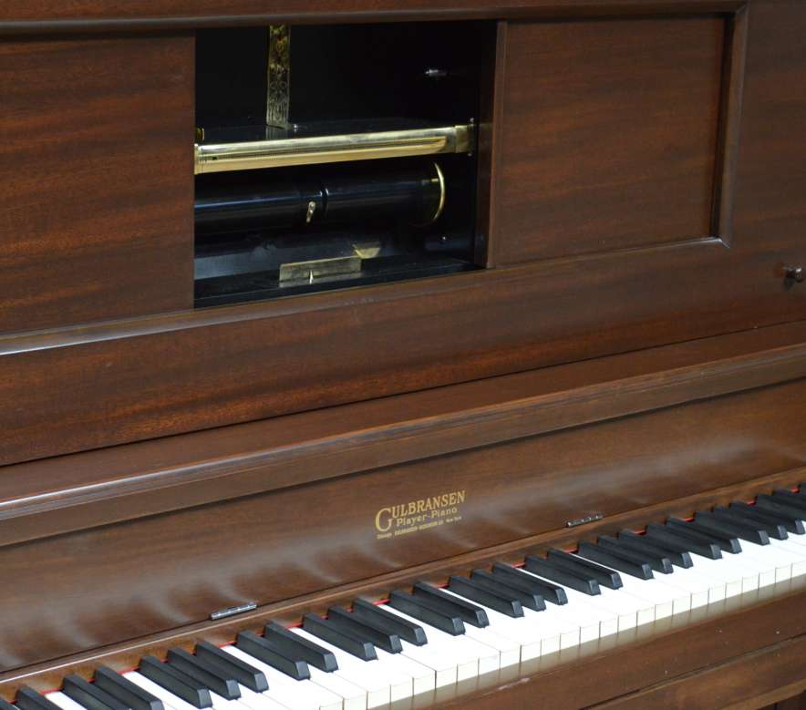 This Gulbransen player piano is a typical model from the 1920s era andis made of beautiful Honduran Mahogany wood. This piano has been restored inside and out, and now plays via electric motor rather than manual foot-pedal operation.
