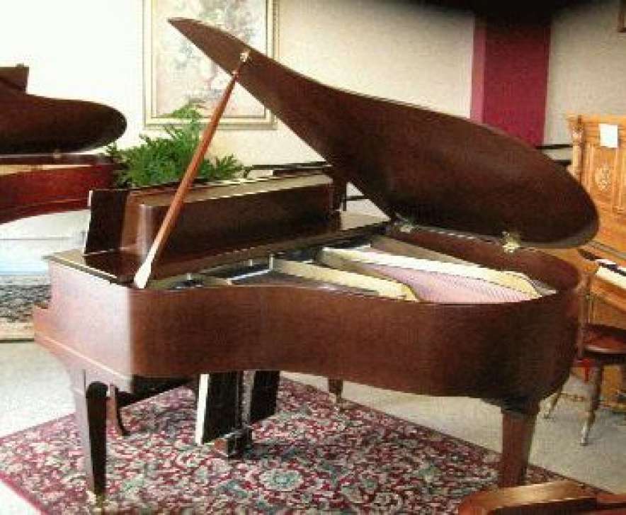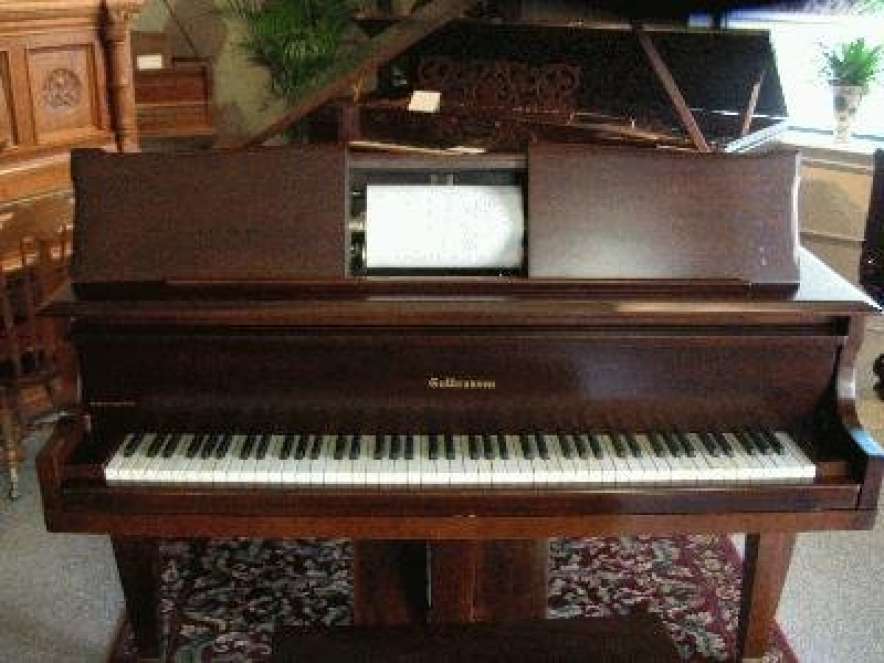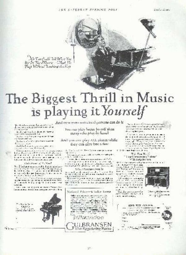 This piano was built by the famous Gulbransen Piano Company of Chicago in 1925, and is made of mahogany wood. When you sit at the piano, the music rack has doors that slide open to expose the music roll. The pumping pedals swing down from underneath the piano for playing the piano automatically. When not being used as a player piano, the player piano mechanisms can be stowed away and the piano used as a regular baby grand! Attached here is a vintage ad from Gulbransen showing this piano being sold in 1925 for $1,275, the cost of a small house! This piano will be restored to like new condition, and an original matching bench is included.