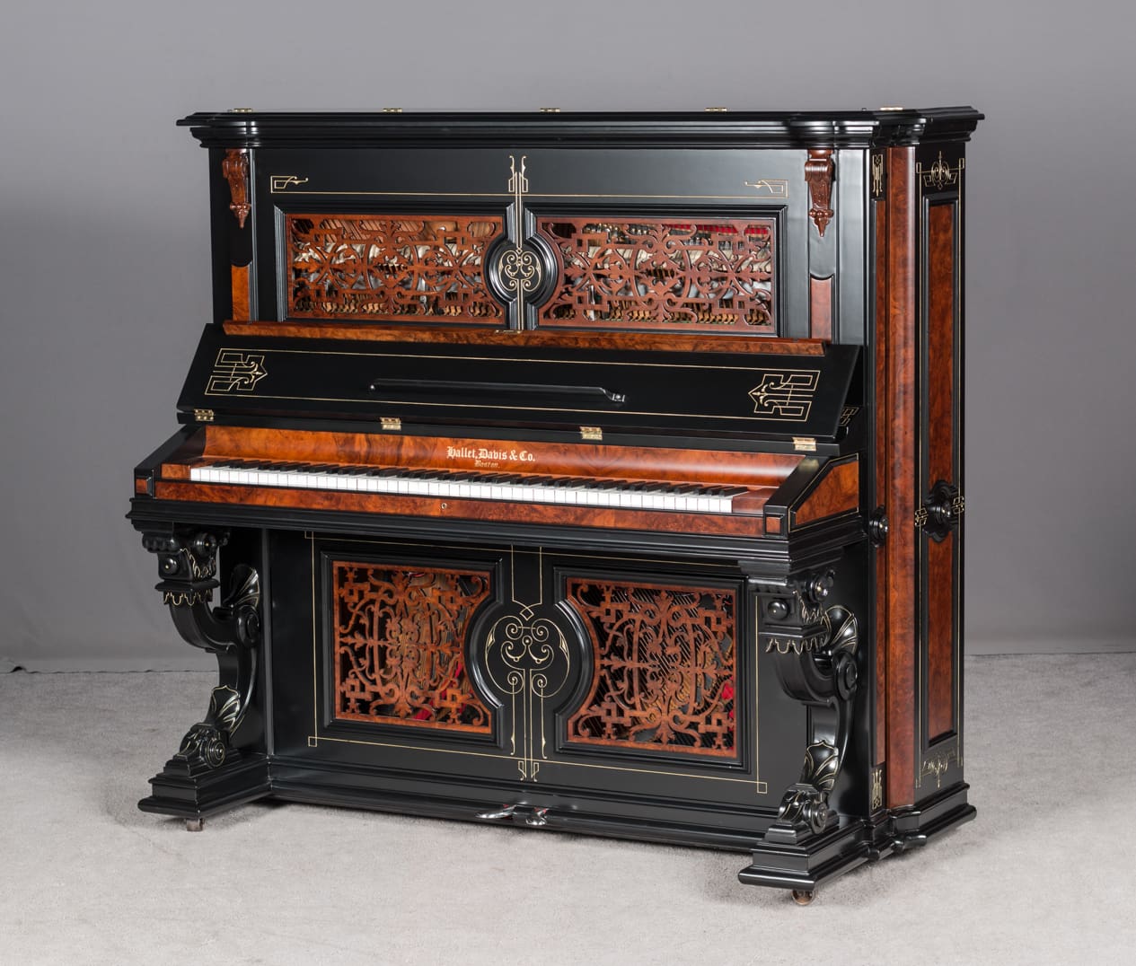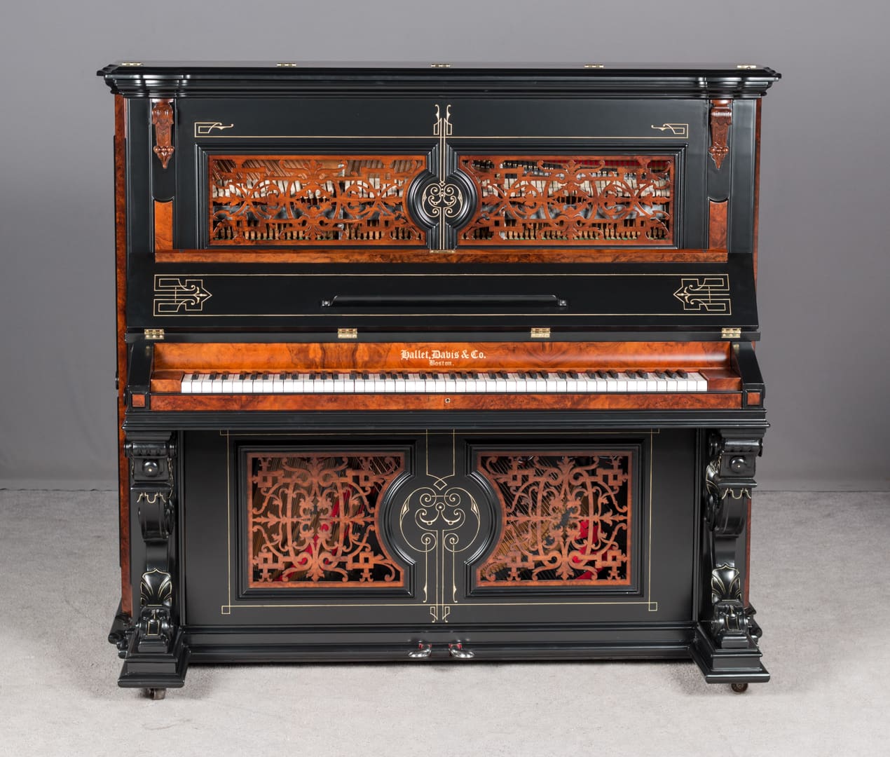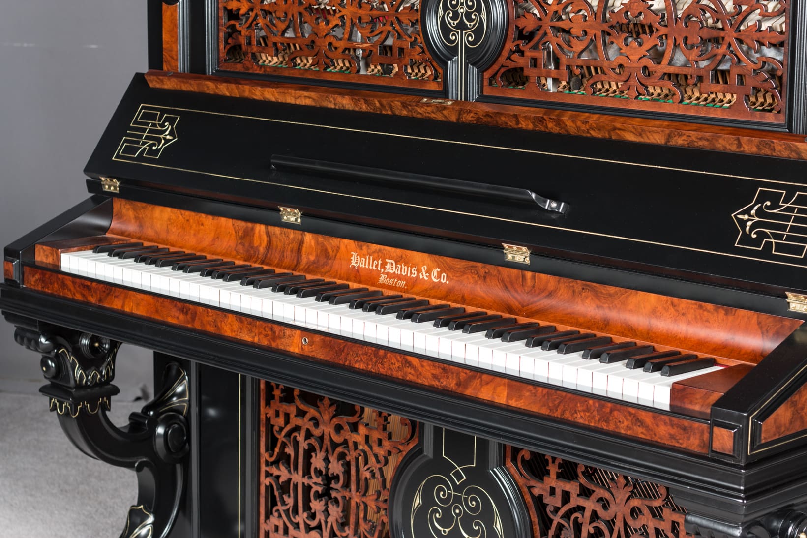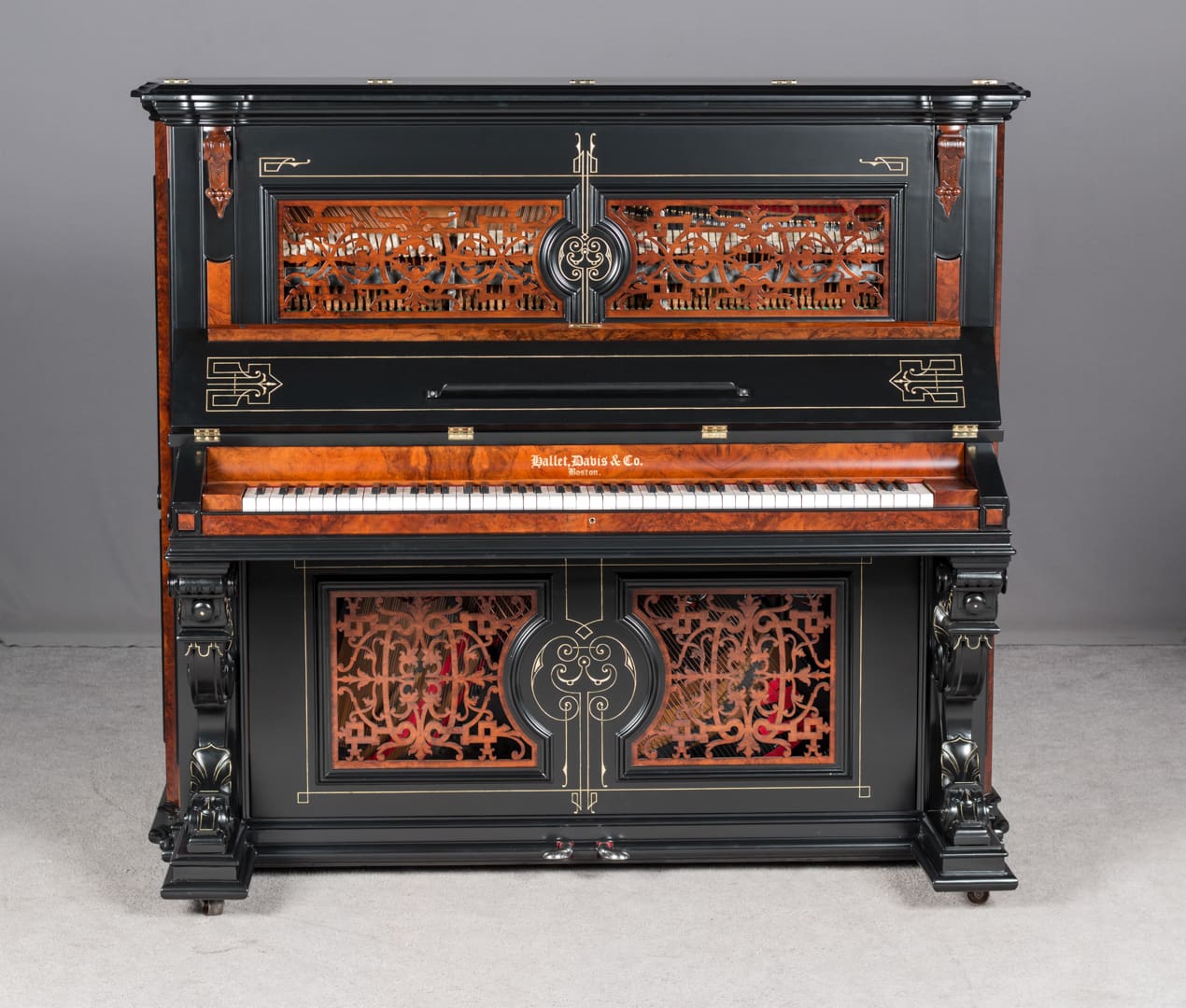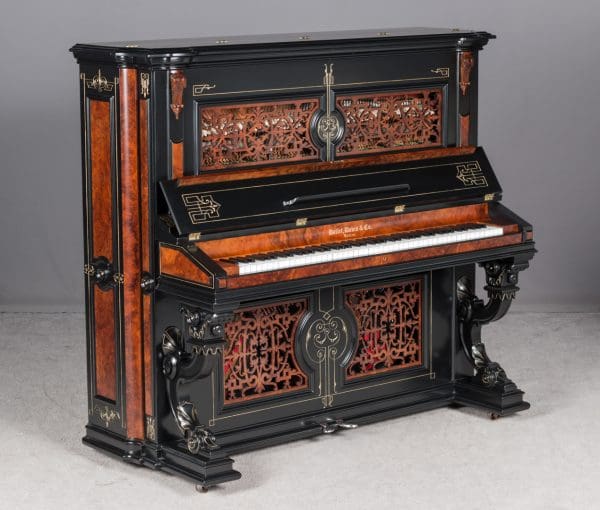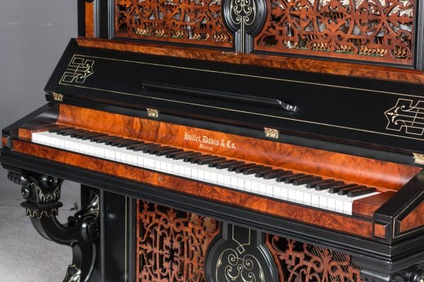 This beautiful piano was the highest-grade, most expensive upright piano in the Hallet & Davis Piano Company product line. Built in 1874, this instrument reflects the gilded Victorian Asge with its lavishly carved cabinet and overall stunning appearance. The instrument is finished in black satin lacquer with exotic Burlwood trim, all embellished with delicate gold leaf accents and trim.