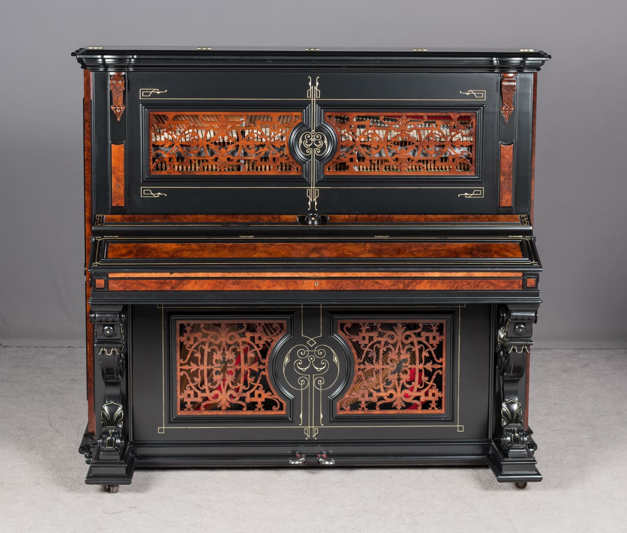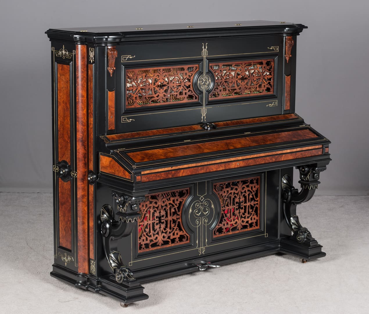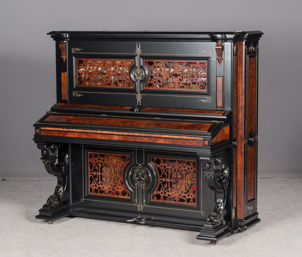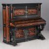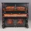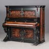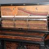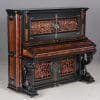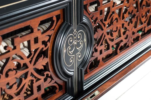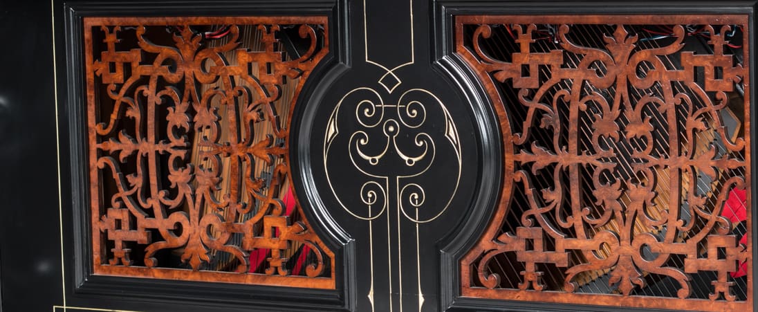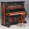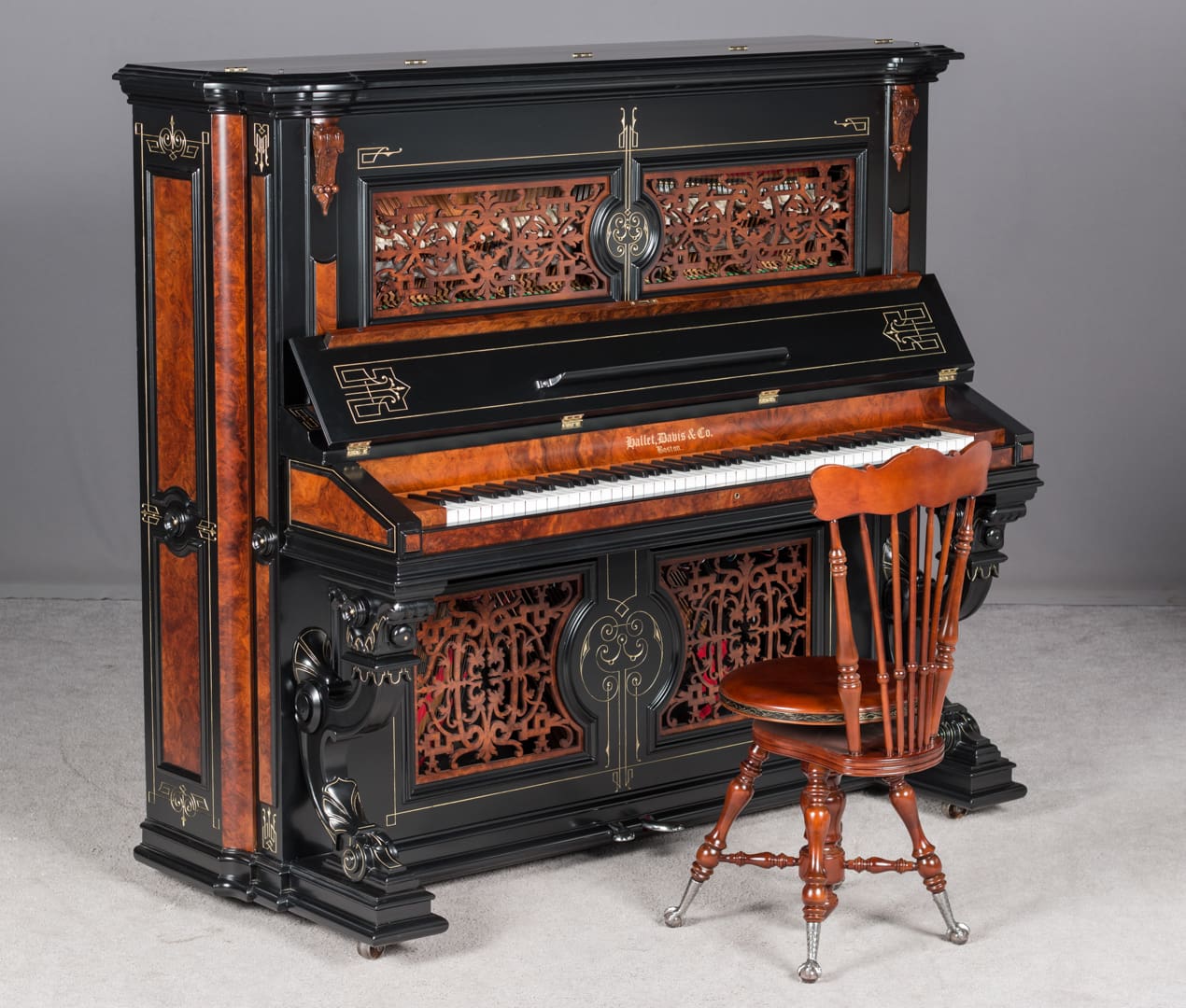 This beautiful piano was the highest-grade, most expensive upright piano in the Hallet & Davis Piano Company product line. Built in 1874, this instrument reflects the gilded Victorian Asge with its lavishly carved cabinet and overall stunning appearance. The instrument is finished in black satin lacquer with exotic Burlwood trim, all embellished with delicate gold leaf accents and trim.