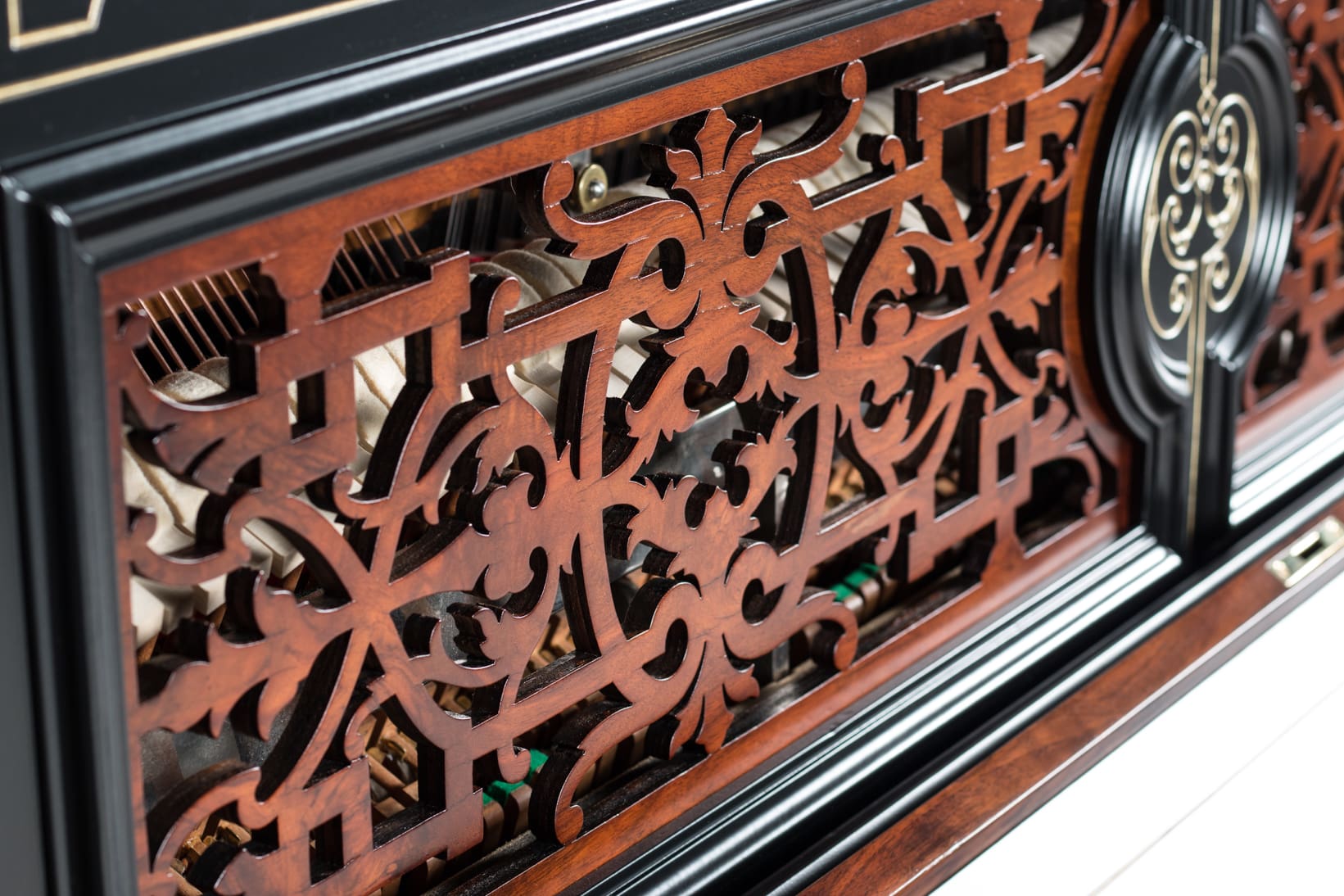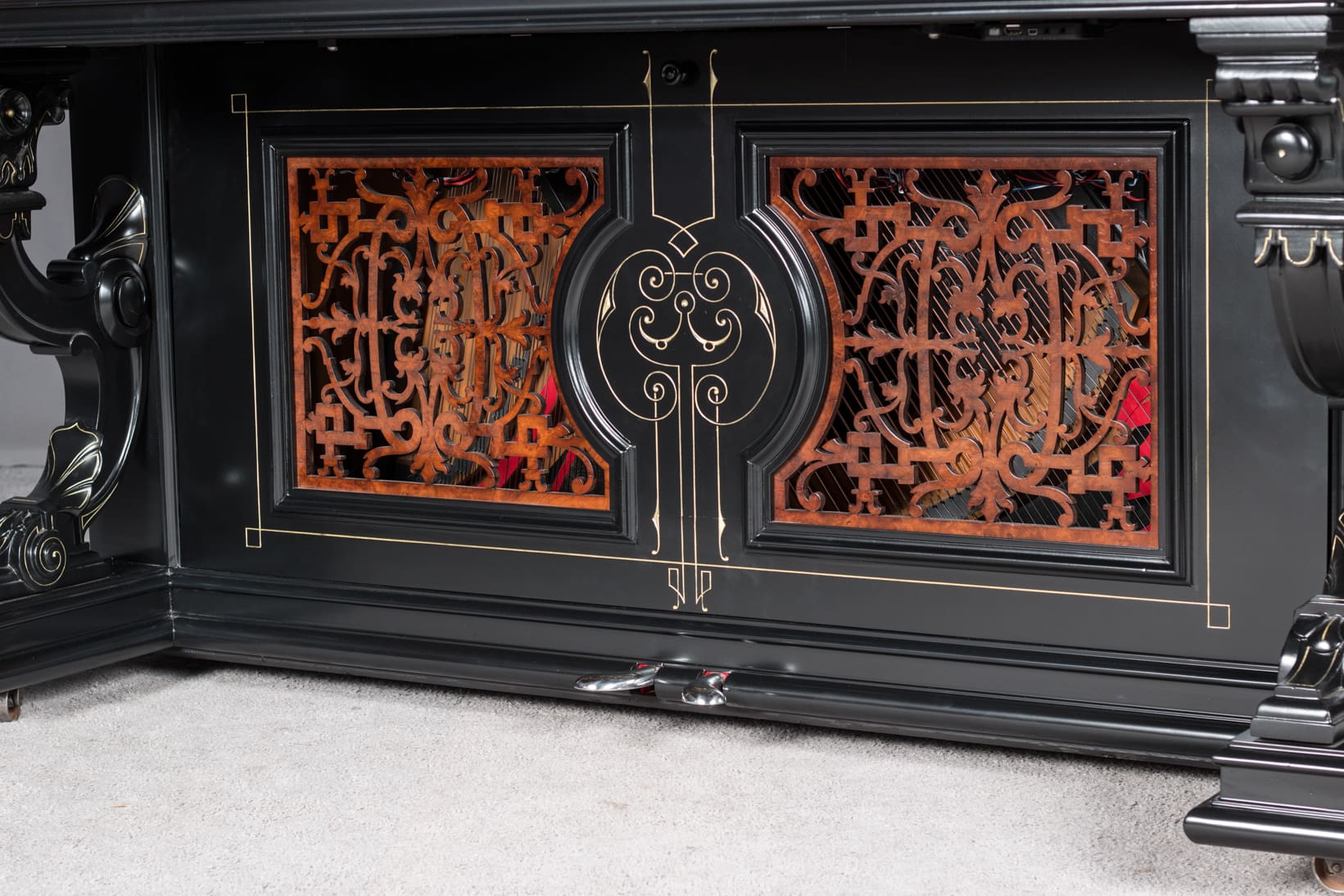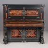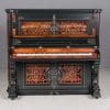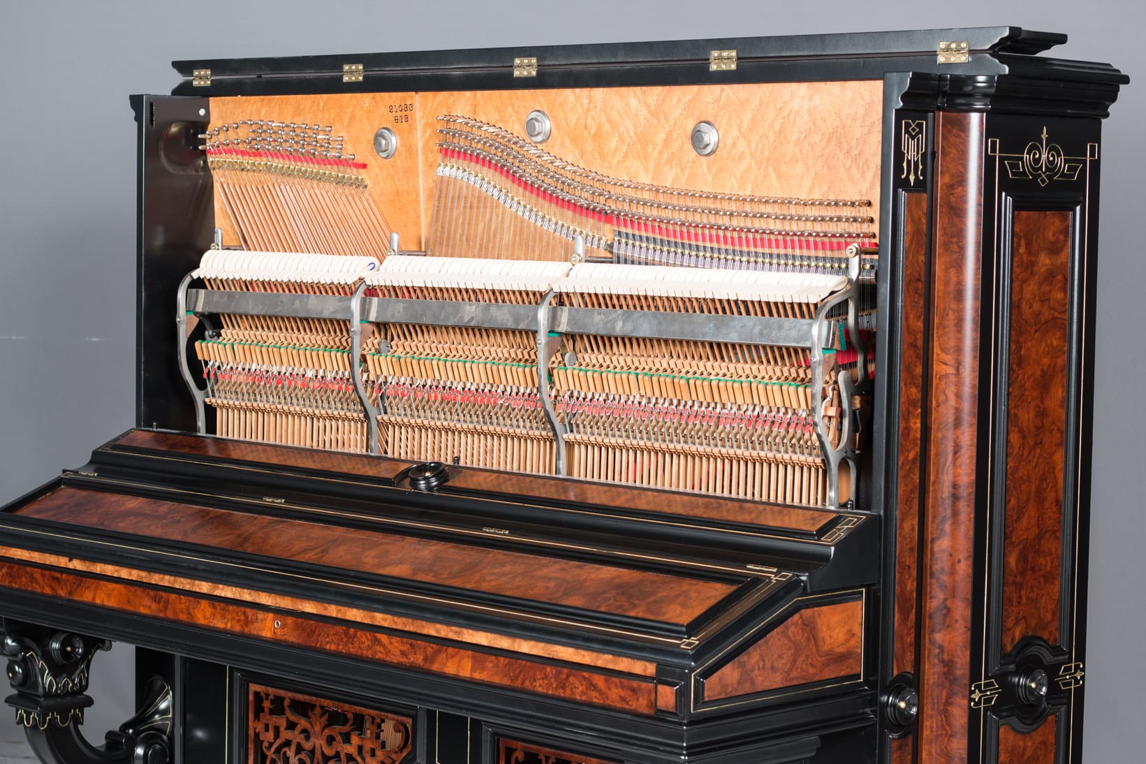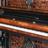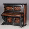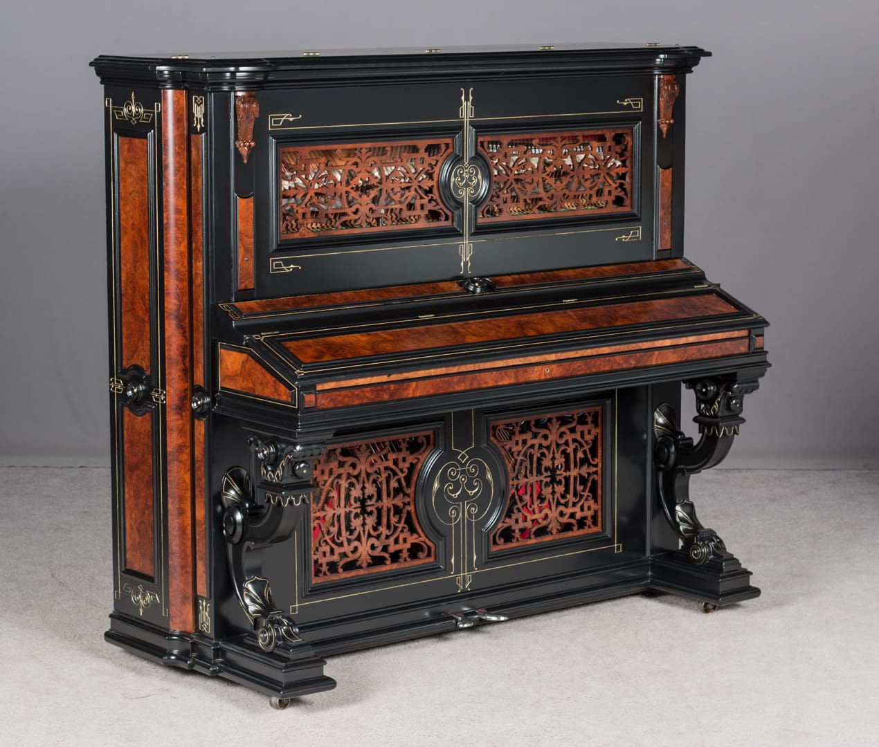 This beautiful piano was the highest-grade, most expensive upright piano in the Hallet & Davis Piano Company product line. Built in 1874, this instrument reflects the gilded Victorian Asge with its lavishly carved cabinet and overall stunning appearance. The instrument is finished in black satin lacquer with exotic Burlwood trim, all embellished with delicate gold leaf accents and trim.