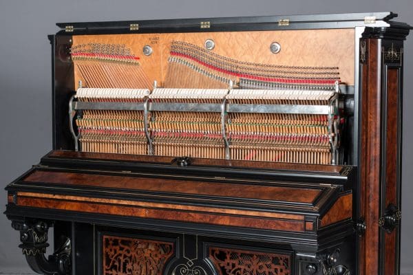 The instrument is being restored to like new condition, inside and out. This is a large, full-size upright piano with long strings and a very large soundboard. The sound quality of these full size upright pianos is better than most modern baby grand pianos! Pianos of this caliber would have cost several hundred dollars when new – the cost of a small house of the era. Because of their high cost, these instruments were built in small numbers and are quite rare today.