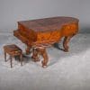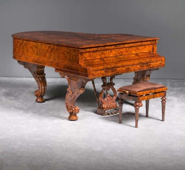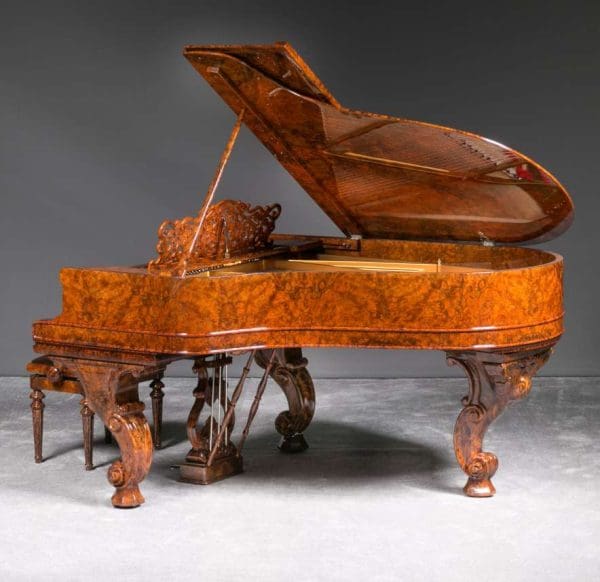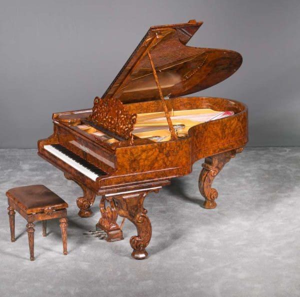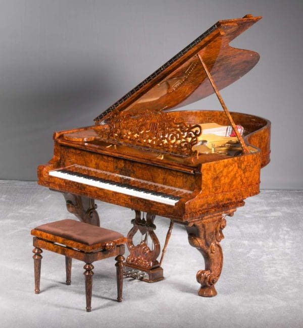 This lovely piano is a rare Hamburg Model carved Rococo style Model “A” Steinway in a custom exotic black walnut burl wood cabinet. Records show this piano left the Hamburg factory in 1907 and was originally delivered to a buyer in Rome, Italy, where it remained for most of its life.