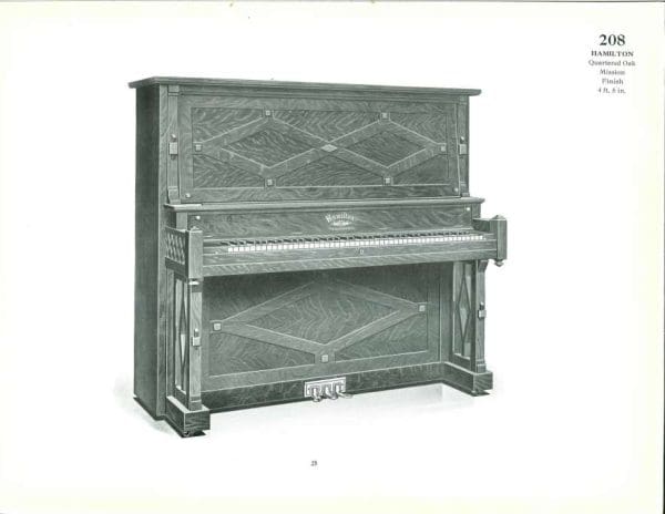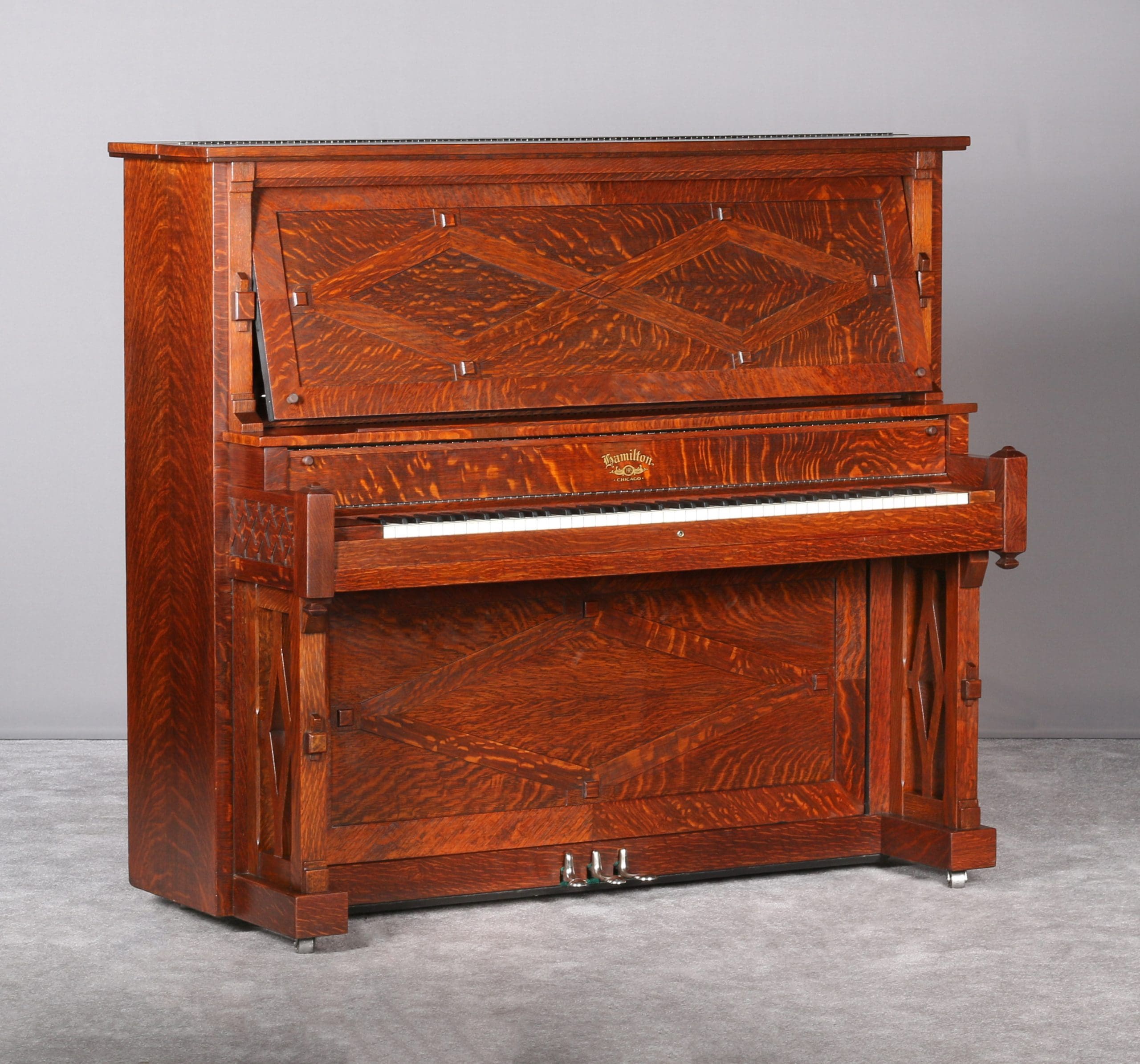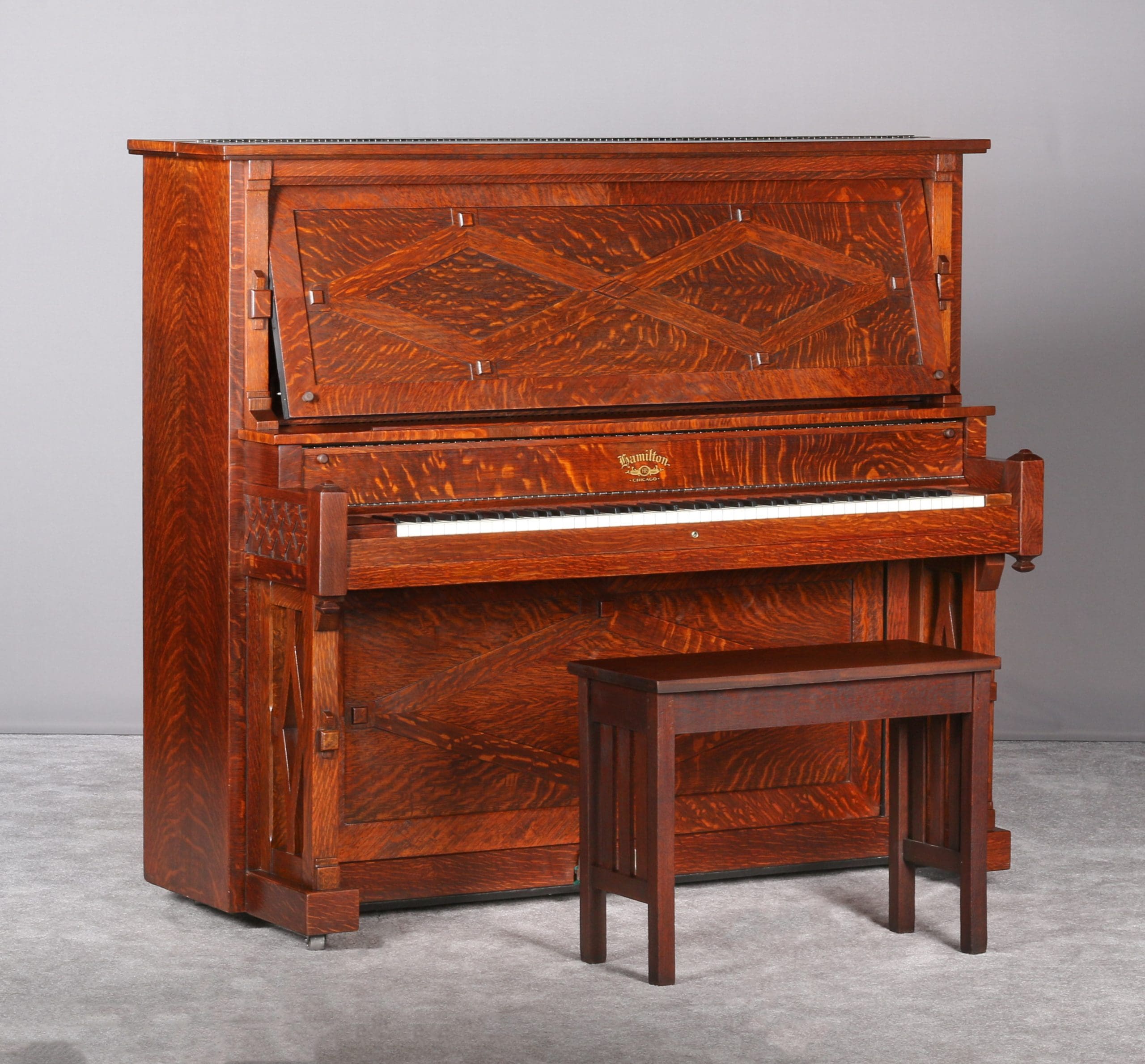 This lovely piano is a rare example of the “Model 208 Mission Oak” Craftsman Style upright piano offered by the large Hamilton Piano Company of Chicago. Dwight Hamilton Baldwin, founder of the world famous Baldwin Piano Company of Chicago, named the “Hamilton” line of pianos after his own name. Hamilton was proudly sold as one of Baldwin’s top brand names for over a century.