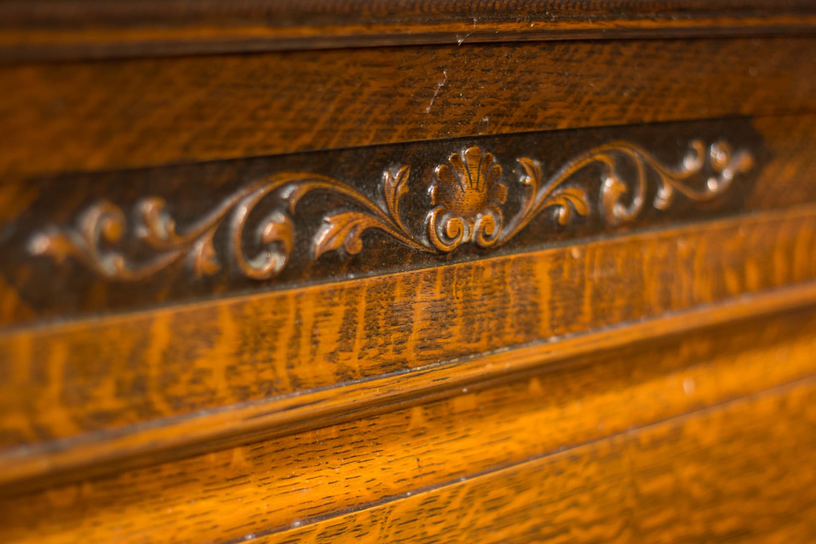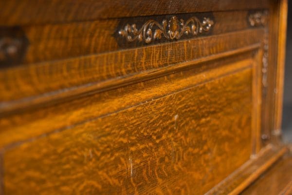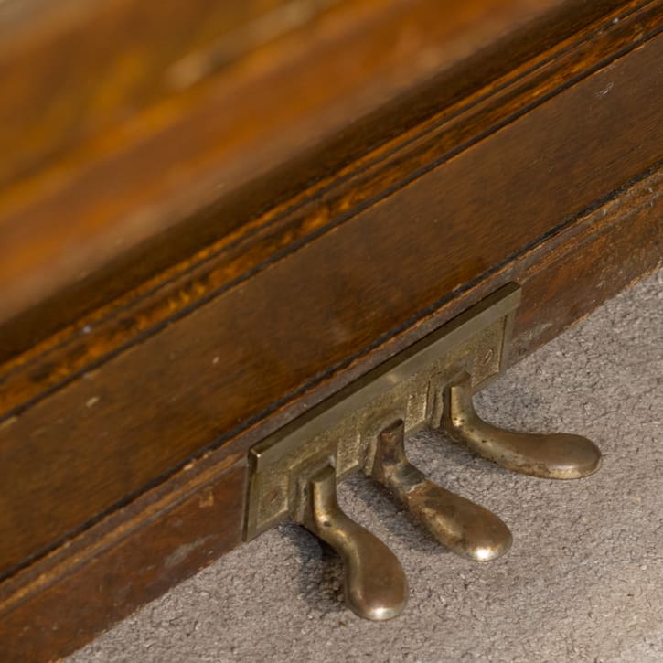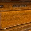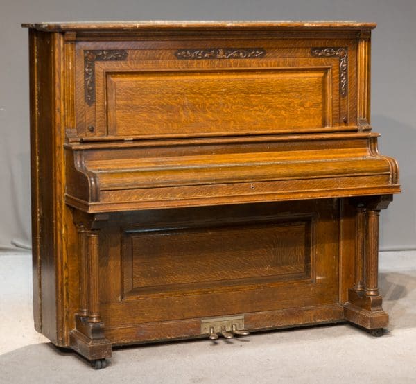 This lovely piano is built of quarter sawn oak wood and is of the carved Late Victorian style. Light oak pianos in the Victorian style are less common than the darker oak and mahogany models. The case is especially attractive because it is not “overdone”, and has a clean balance of elegance and simplicity.