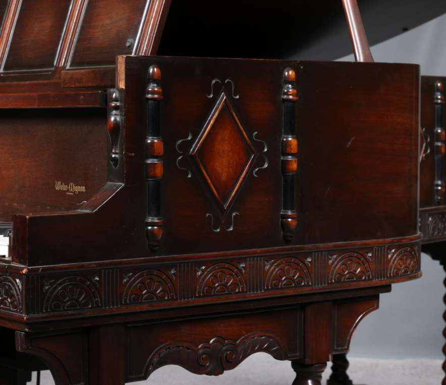 This piano was originally built as a “Welte-Mignon” reproducing player piano, but the original pneumatic player mechanisms were removed from the instrument many years ago. The fact that this was originally a player piano makes no difference whatsoever in the manual playability of the piano. These reproducing player grand pianos were some of the finest and most expensive pianos money could buy, and the “Welte-Mignon” player system was generally installed in the finest instruments.