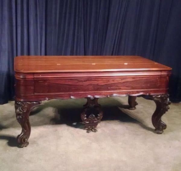 Henry F. Miller was once one of the most successful piano manufacturers in Boston. This is a relatively late model, built circa 1884, making it a large and evolved instrument with a full 88 note ivory keyboard. Henry F. Miller was one of the finest of the old Boston manufacturers, and their square pianos are made of superb quality and craftsmanship. This piano is made of a lighter shade of Brazilian Rosewood and is of the Rococo Victorian style. It is a large, resonate instrument with a delightful tone quality.