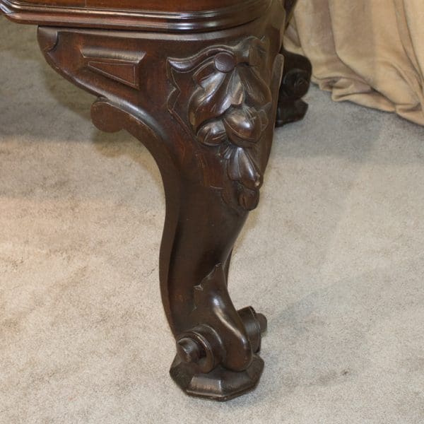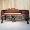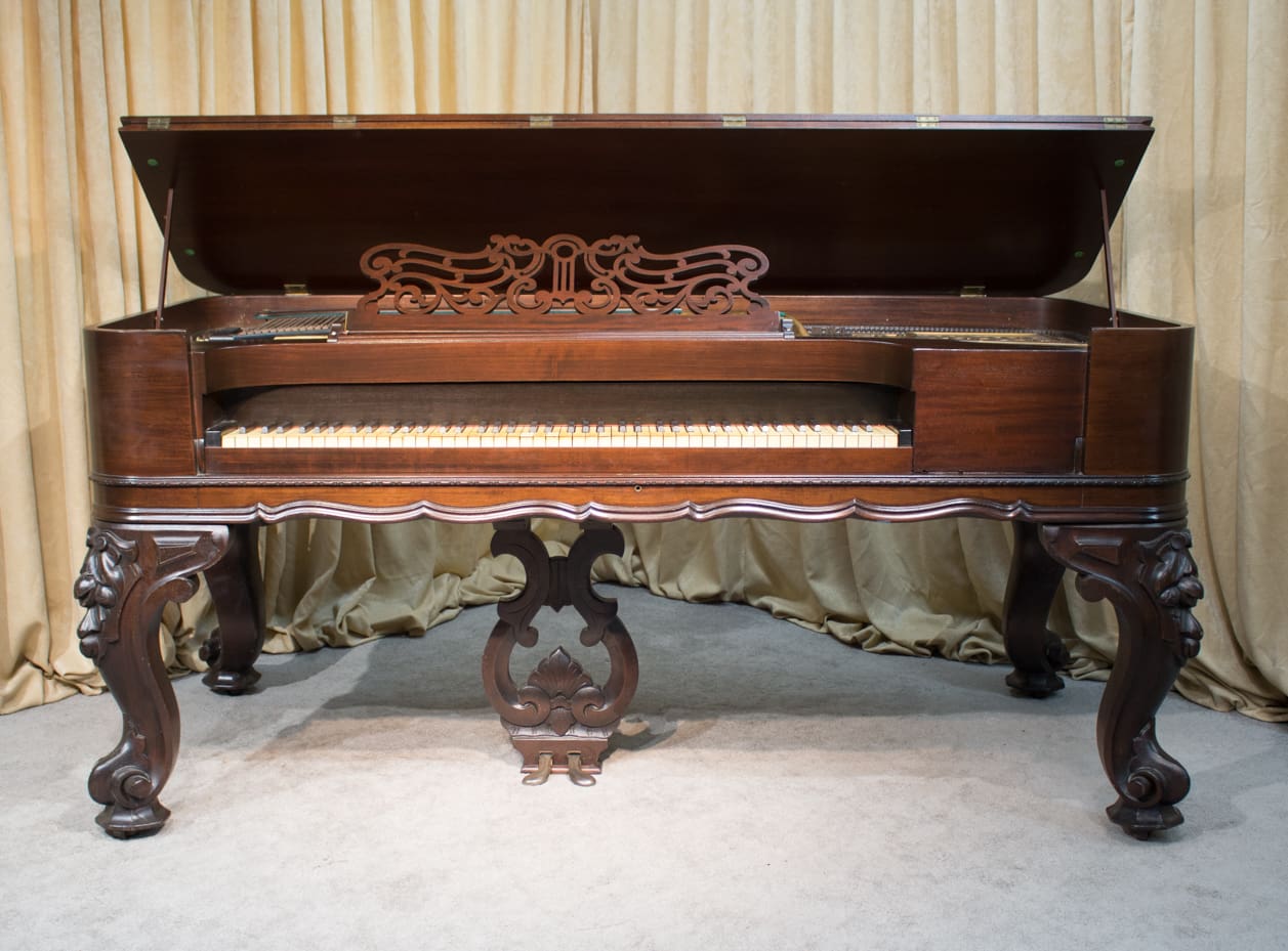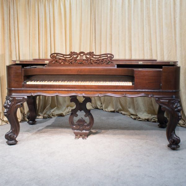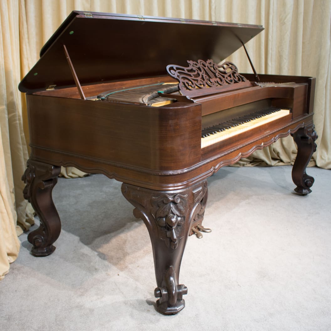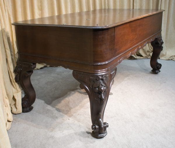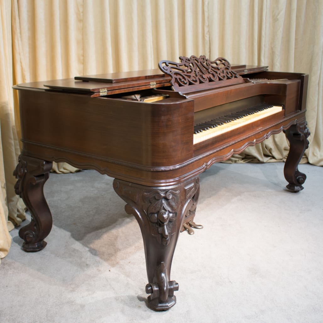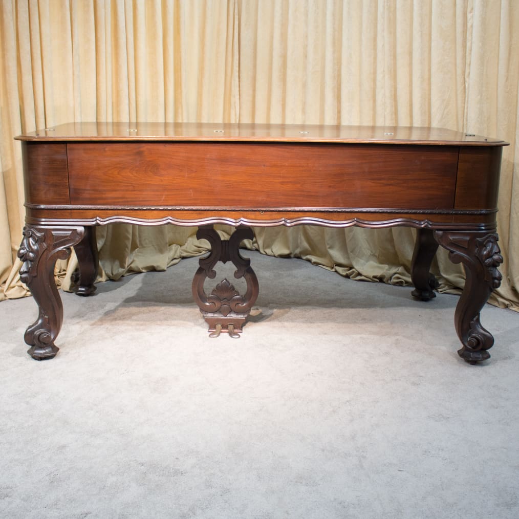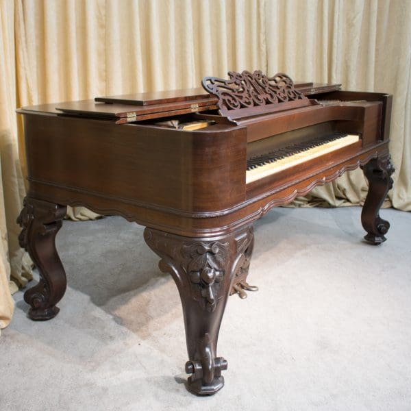 The cabinet is made of beautifully carved Brazilian Rosewood and is of the Rococo Victorian style. This piano was one of the larger, higher grade square piano models offered by Ivers & Pond. It features a full 88-note keyboard when most square pianos were built with 85 notes. The back of the piano is also built to be finished like the front of the piano which allows the instrument to sit in the middle of a room rather than against a wall, if desired.