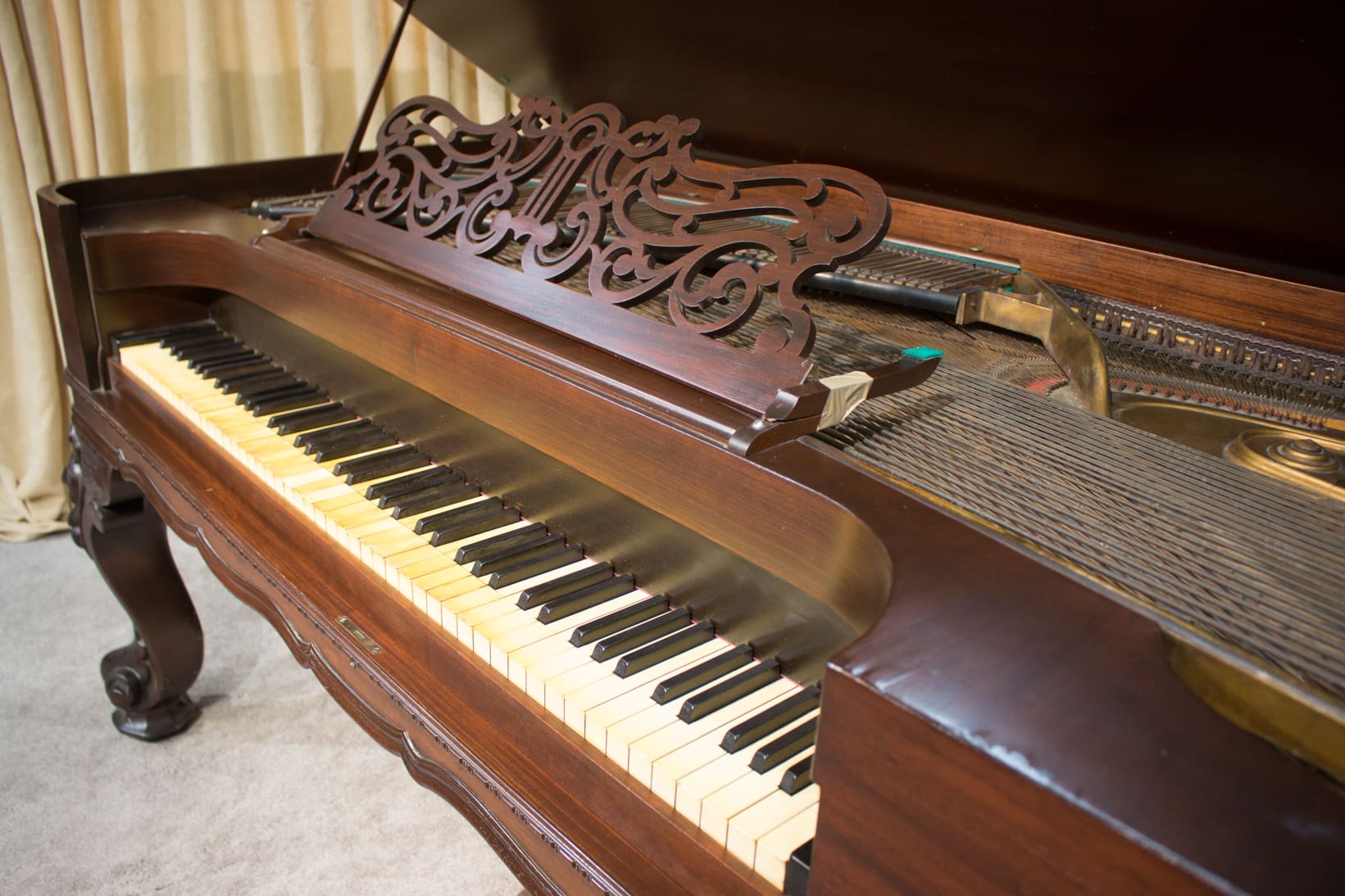 DEPOSITS: The restoration of this instrument has not been completed. A 30% deposit is required on instruments pending restoration. This deposit holds the instrument and keeps it from being offered to other clients, and it also makes that piano’s restoration a priority. Once we complete the restoration, we invite the client to visit our shop to see and hear the piano. If the client is unable to visit our shop, we will send professional photos and videos of the piano for review. The client then has the option of paying the balance and purchasing the piano, transferring their balance to another piano in our shop, or getting a full refund for their deposit. The client is never at risk.