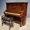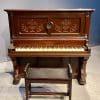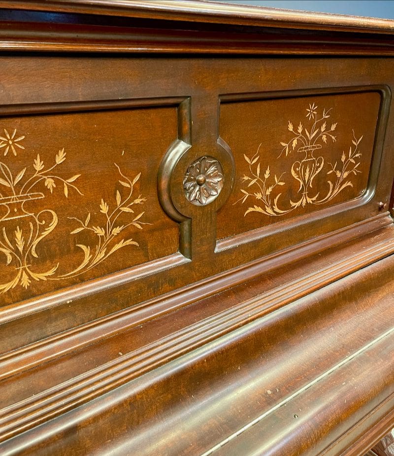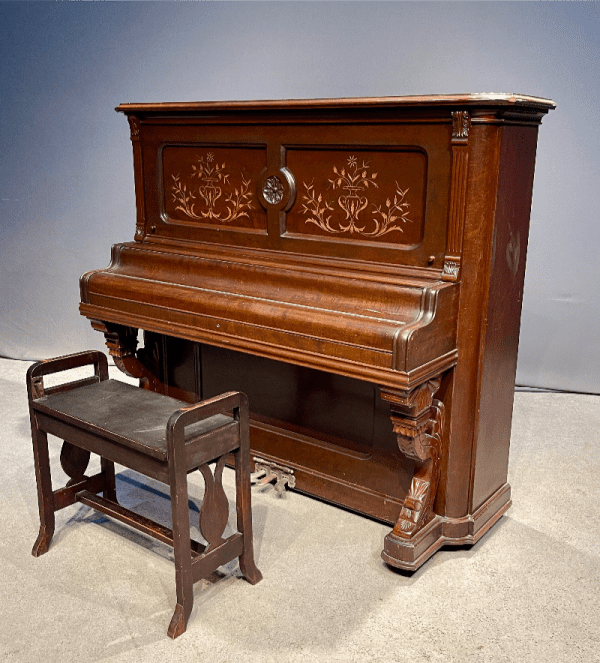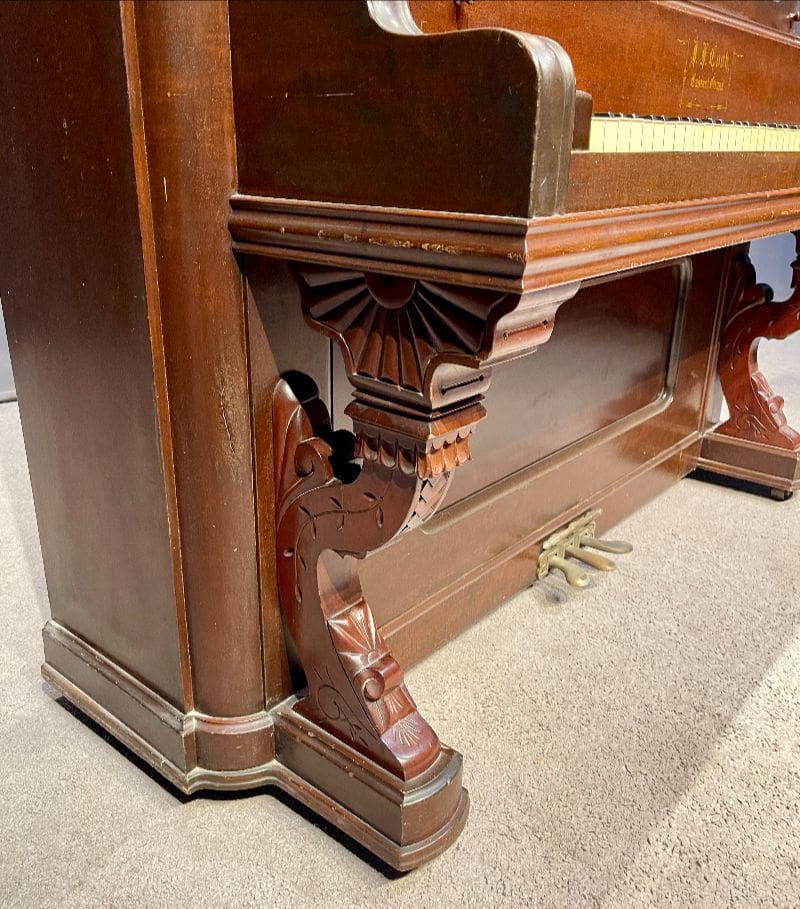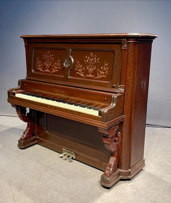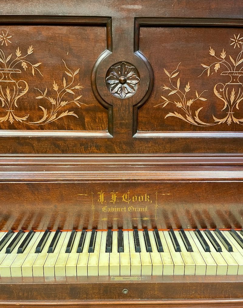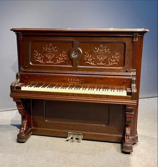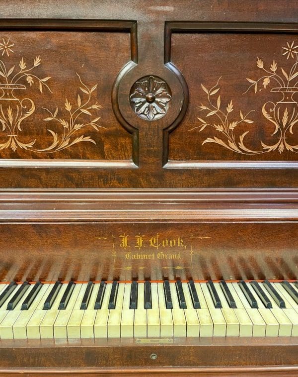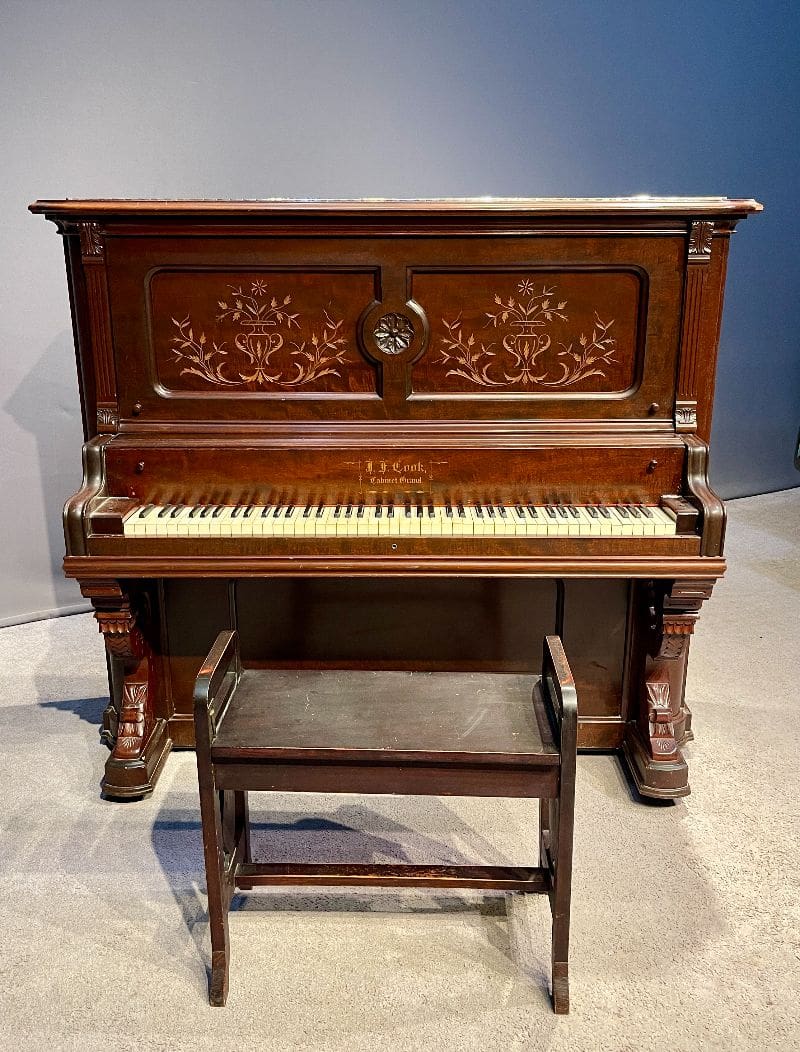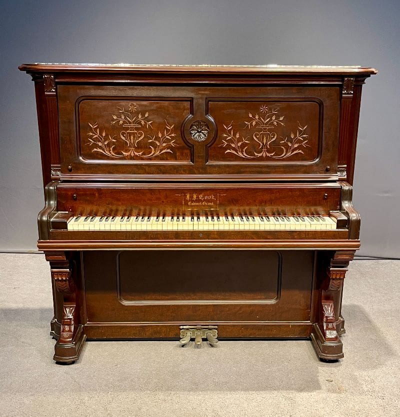 Beautifully carved upright piano by J. F. Cook Piano Company.