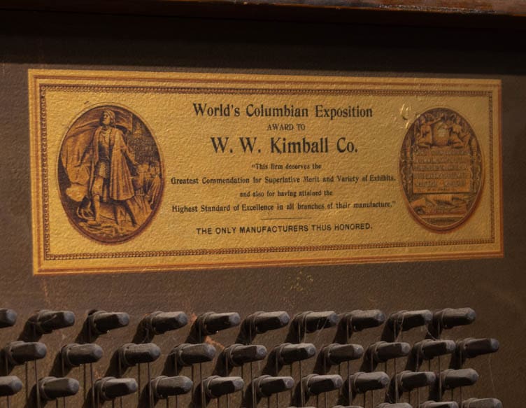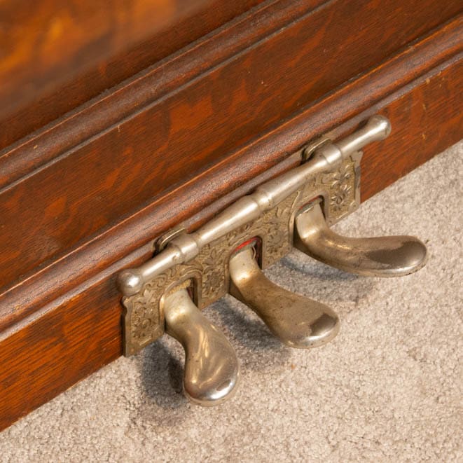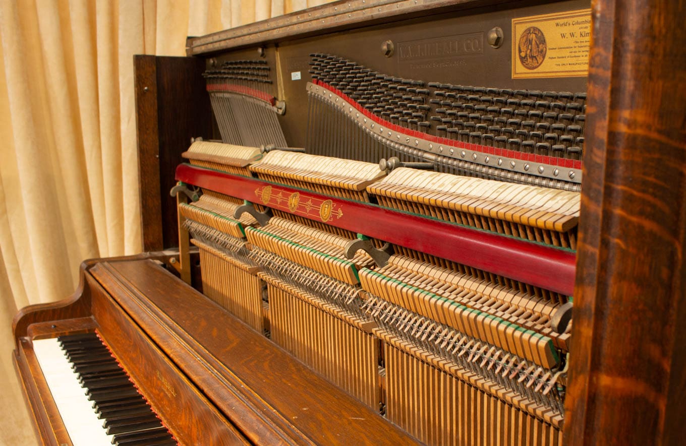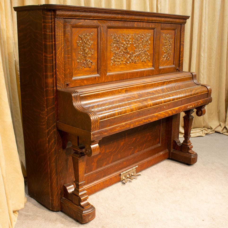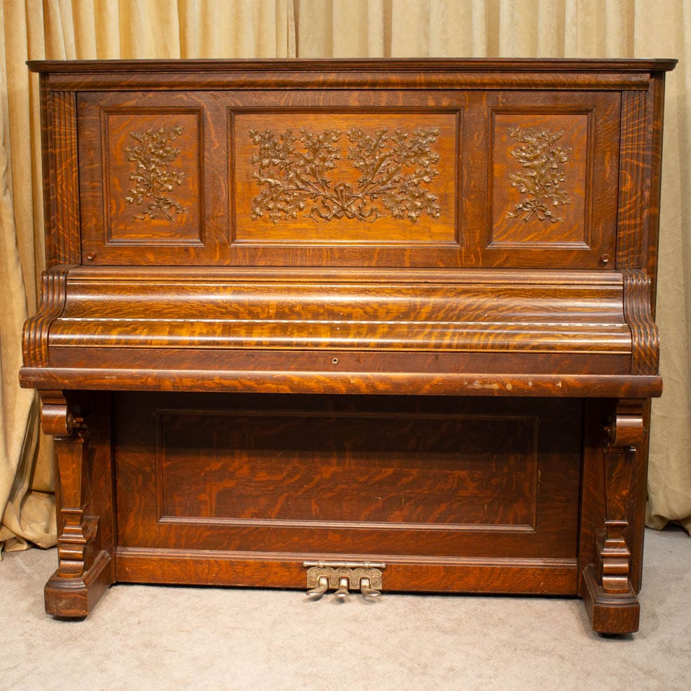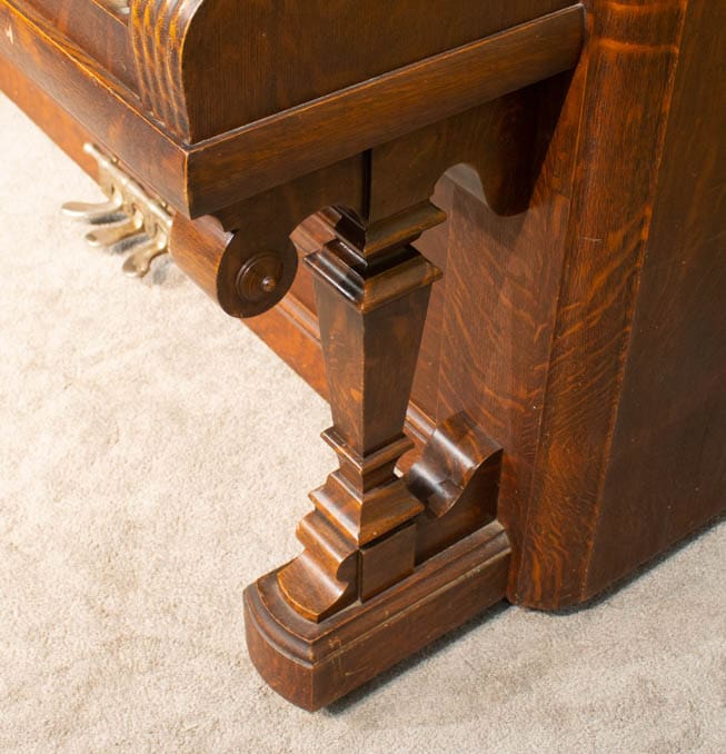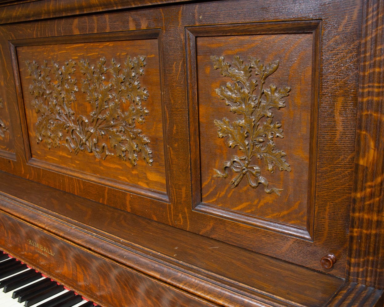 This lovely piano was built by the famous W.W. Kimball Piano Company of Chicago in 1902. According to the original sales catalog (see photos), this piano was sold as the “Style 8” in quarter sawn oak wood. Note the beautifully carved leaves and acorns that adorn the front panel; quarter sawn oak Victorian pianos are less common than mahogany or rosewood because the darker finishes were more popular at the time. Since oak was a common domestic wood, it was not considered to be exotic and was rarely used for piano cabinets, making it rare and desirable today.