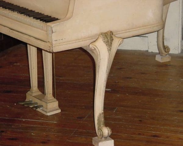 This piano was purchased from an estate in New Orleans where the French influence is very popular. It was built by the famous Wm. Knabe Piano Company of Baltimore in 1928, and has a distressed white/ivory finish with gold trim. The French-Style legs add a great deal of elegance to the instrument, and it has beautiful, clean lines. It is being restored to like new condition, and the customer has the option of having it refinished in original ivory white w/ gold trim, natural mahogany, or black lacquer. It comes with an authentic French style bench, and it can be equipped with a computerized player mechanism if desired.