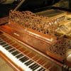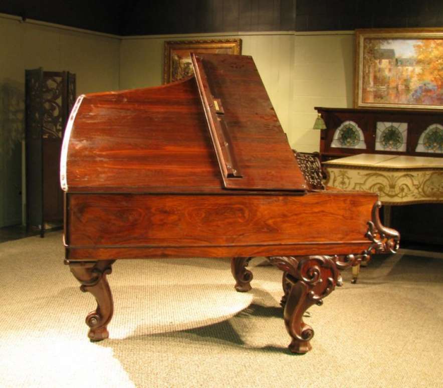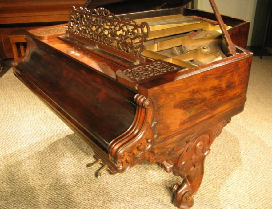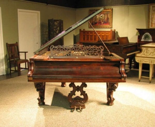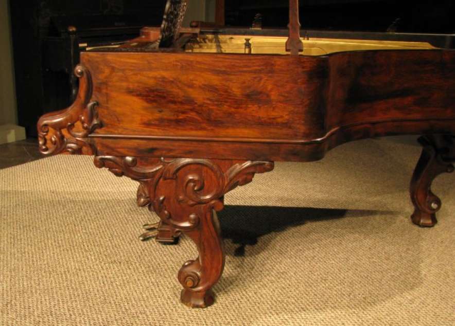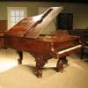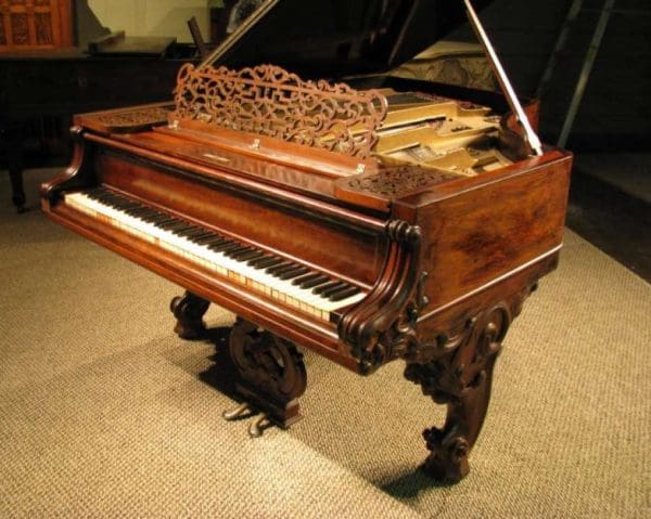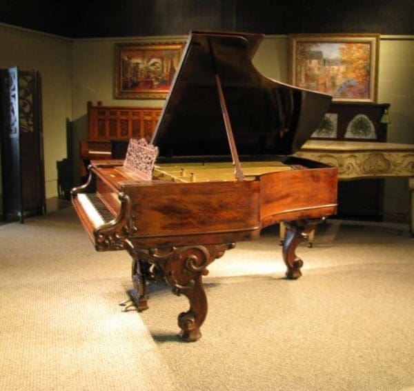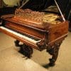 This piano is a prime example of the beautiful craftsmanship that was produced by the renowned Knabe Piano Company during the 19th Century. It is made of beautifully carved Brazilian Rosewood, and has heavily carved Rococo Style cabriole legs and carved pedal lyre. This piano was built in 1873, but was sent back to the Knabe factory in 1903 and the action was converted from the traditional Victorian style grand action to a modern 20th Century grand action! The overall appearance of this piano is just stunning, and the tone quality and touch is amazing. It is an ideal piano for someone with a period home who wants a quality instrument. Notice the beautiful cut work around the music desk and music rack. The tone of this piano is unmatched by today’s instruments, and it is about half the price of a new piano of similar size. It comes with an original matching stool, and can be equipped with a computerized player mechanism if desired.