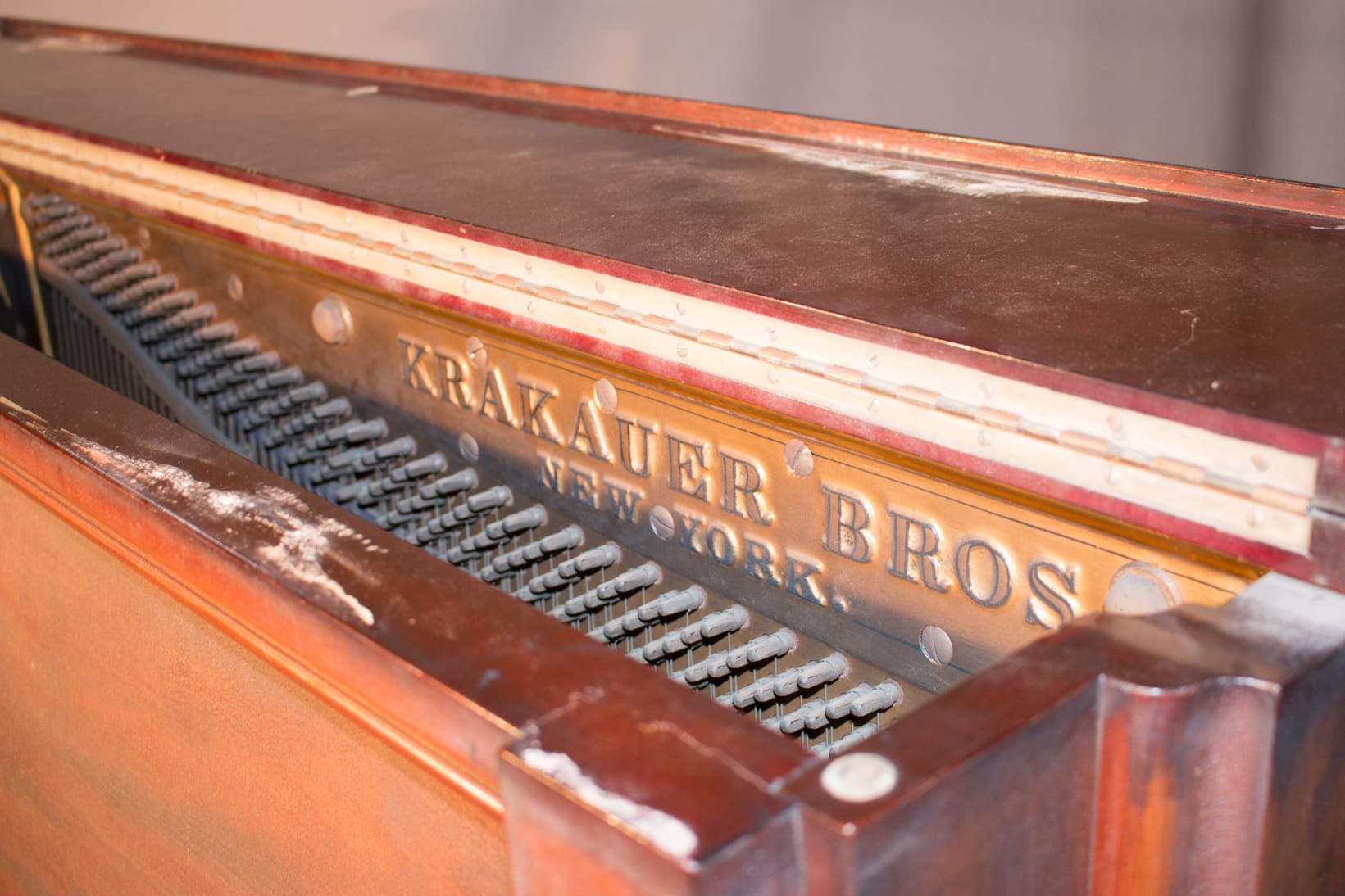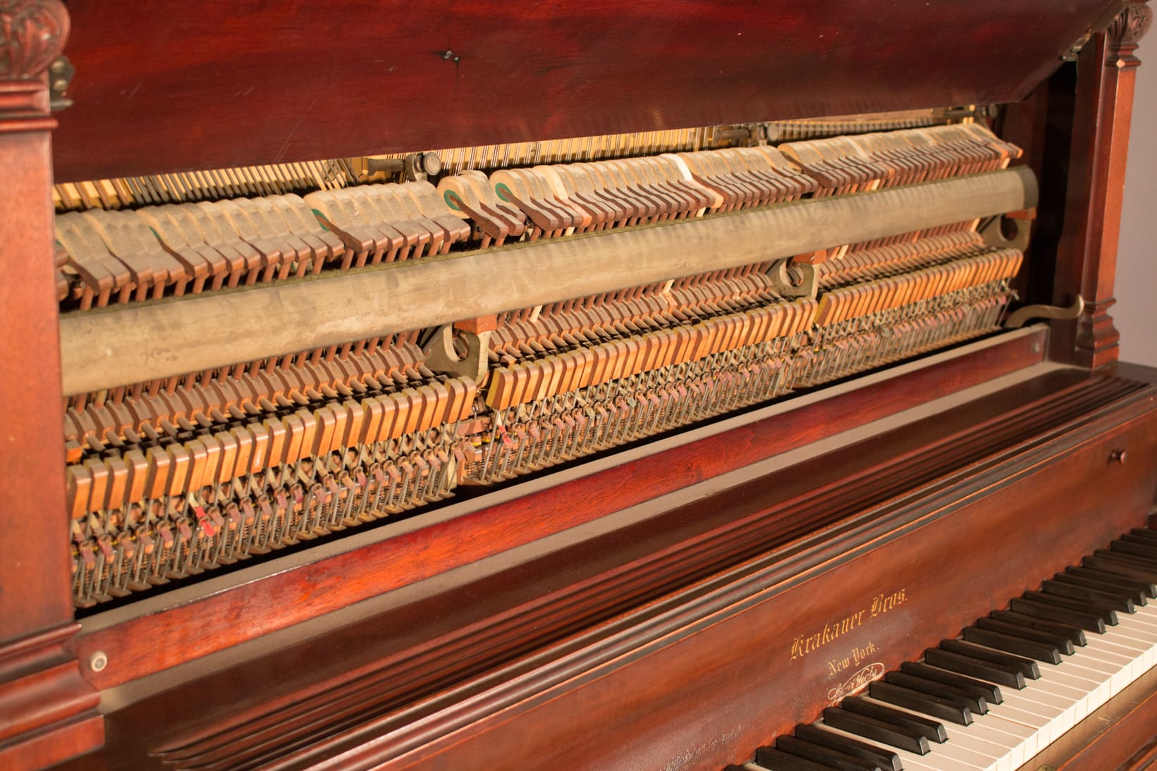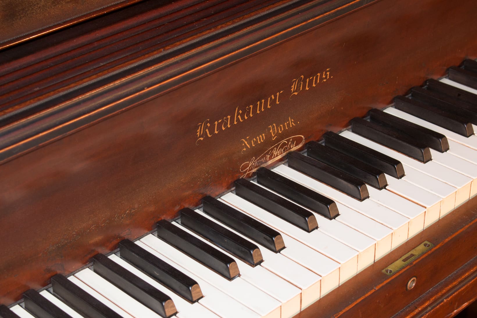 This piano is made of beautiful imported Honduran Mahogany wood and is made in the simple and elegant Greek Revival style. These old finishes chemically break down and turn very dark over the years. The piano will be quite beautiful after professional restoration. Even now prior to restoration, the piano has a large, full sound one would expect from a well-made Krakauer piano. You simply can’t get craftsmanship like this in pianos built today!