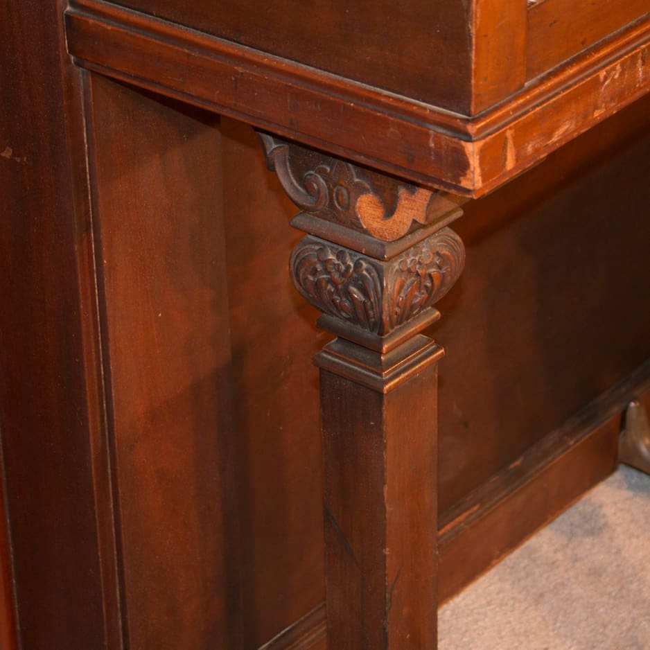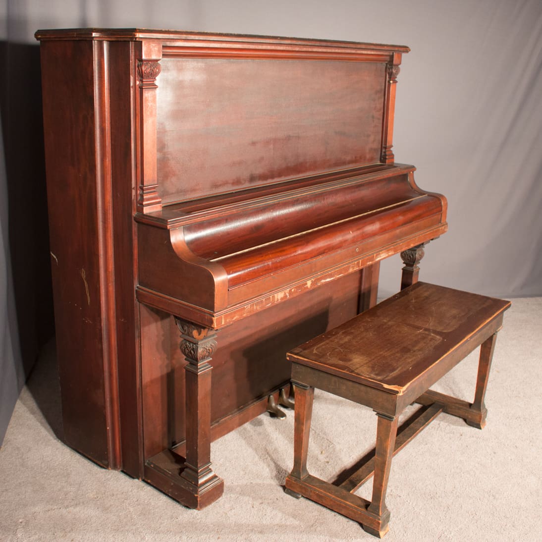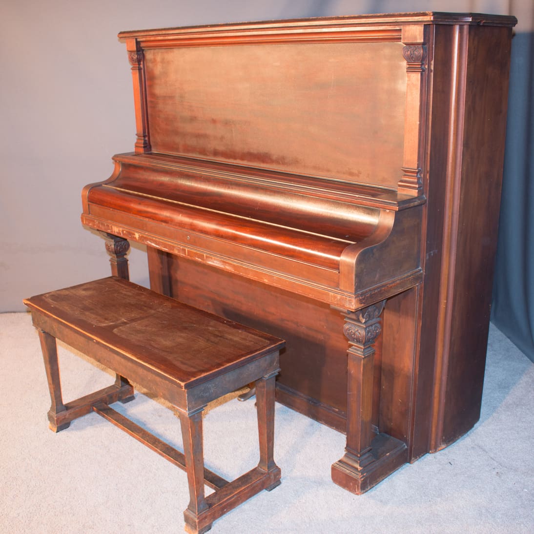This piano is made of beautiful imported Honduran Mahogany wood and is made in the simple and elegant Greek Revival style. These old finishes chemically break down and turn very dark over the years. The piano will be quite beautiful after professional restoration. Even now prior to restoration, the piano has a large, full sound one would expect from a well-made Krakauer piano. You simply can’t get craftsmanship like this in pianos built today!