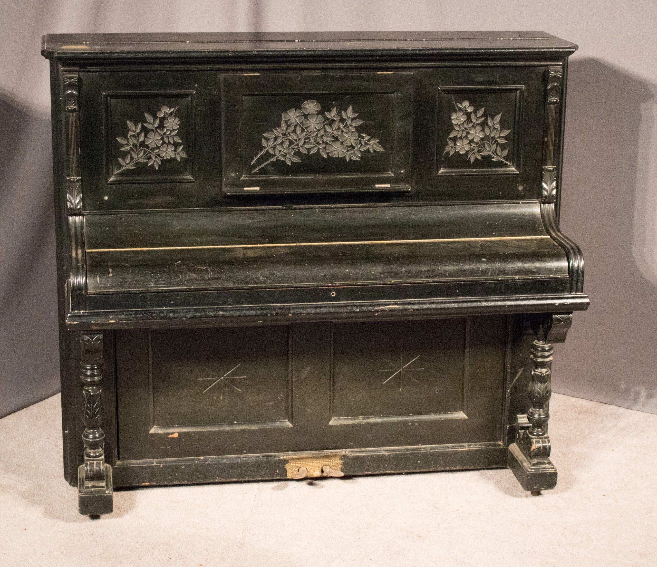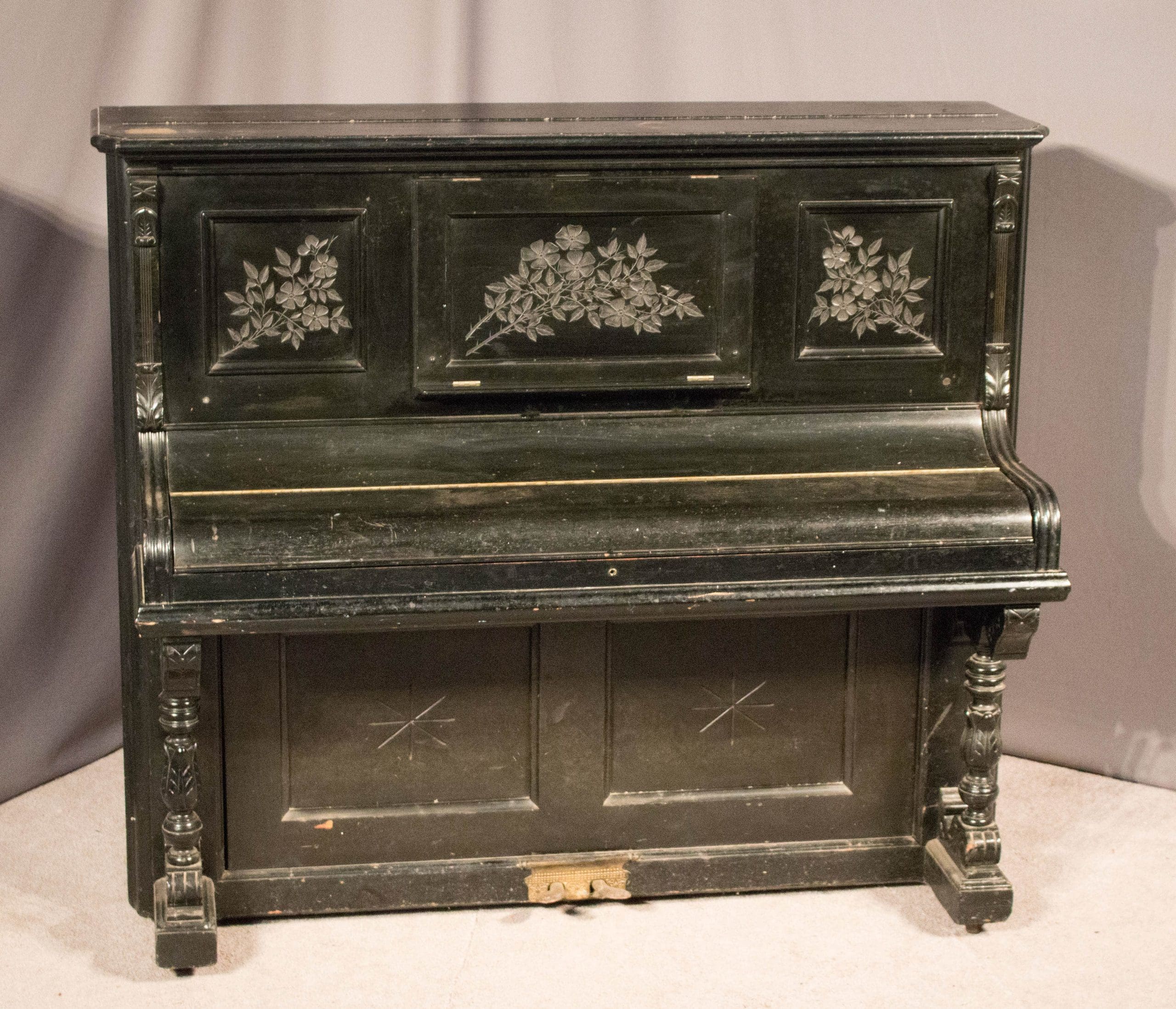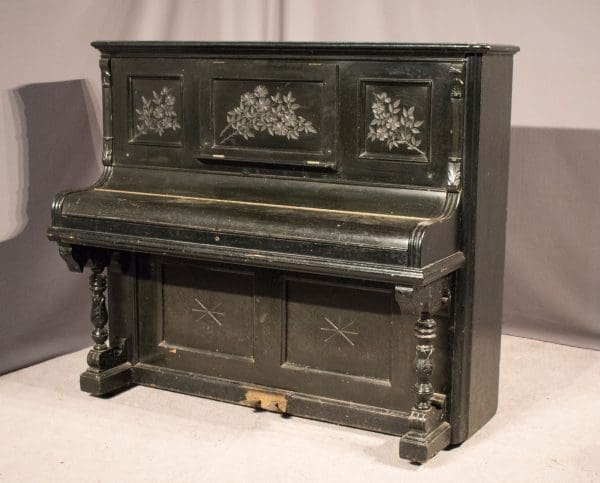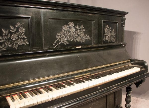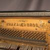 This piano is done in an original black lacquer finish and is of the elegant Eastlake Victorian style. Note the delicately embossed etchings and carved moldings which come together in simple elegance. Even now prior to restoration, the piano has a large, full sound one would expect from a well-made Krakauer piano. You simply can’t get craftsmanship like this in pianos built today!