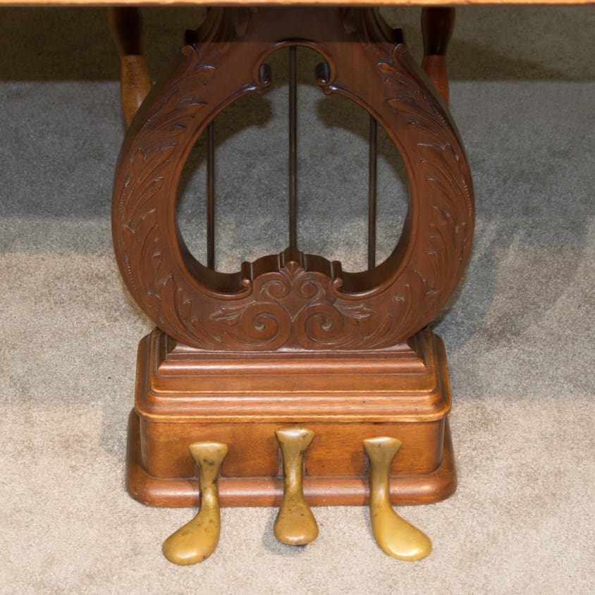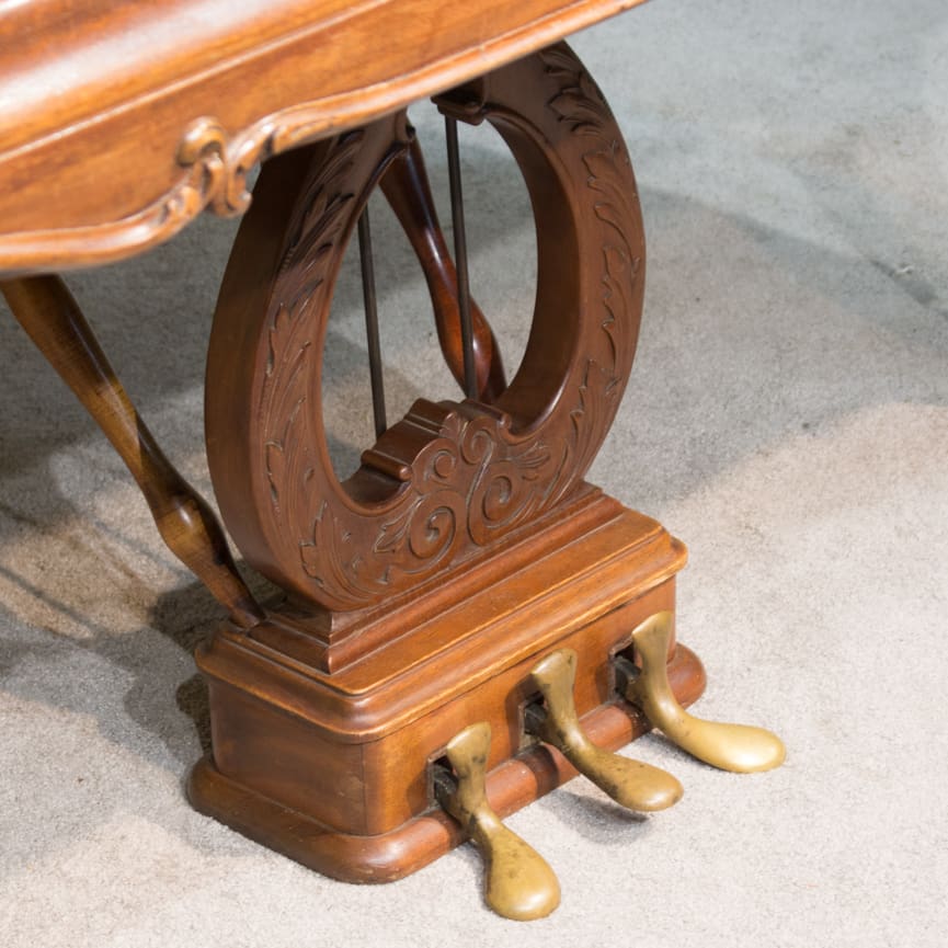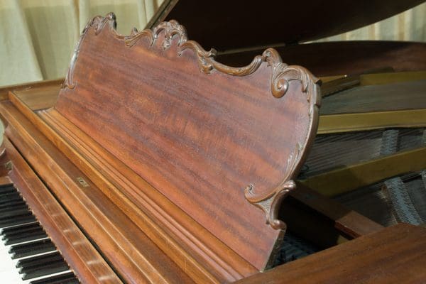 This piano is made of beautiful imported Honduran Mahogany wood which gives this instrument a formal yet traditional appearance overall. The instrument boasts beautifully carved legs and scalloping along the entire case which gives an overall formal and elegant look while maintaining a delicate balance of simplicity and grace.