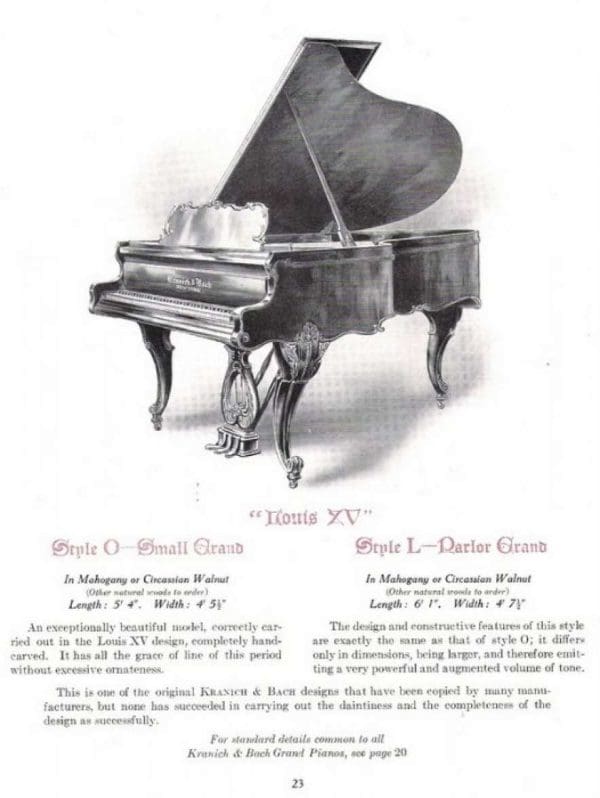 TECHNICAL NOTE: It is true that Kranich & Bach had a unique patented action design during the early 20th Century which is obsolete today. Most conventional piano tuners do not know how to properly adjust these unique piano actions, and their parts are difficult to find. Sadly, some piano tuners will scare a would be buyer away from investing in a beautiful Kranich & Bach piano. These pianos are of amazing quality and tone and are terribly misunderstood by most conventional piano tuners.