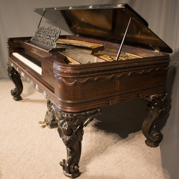 This piano is made of Brazilian Rosewood and is of the carved Rococo Victorian style. This piano was one of their “top of the line” models which boasts a full 88-note keyboard and models extensive carvings around the cabinet. The instrument will be restored to like-new condition, inside and out. This piano has a sweet, harp like tone quality that is very pleasant to hear!