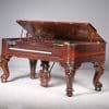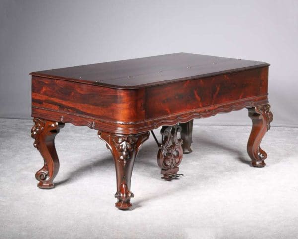 This piano has been internally restored and refinished to like new condition. Note the elaborate carvings on the legs and music rack, as well as the ornate casting in the metal harp inside. The delicate “harp like” tone of these square pianos is a bit different from the way modern pianos sound – the videos shown here will allow the listener to better understand how lovely these pianos really do sound after professional restoration.