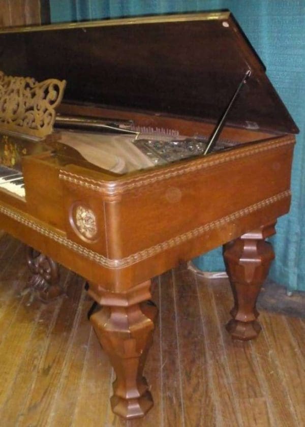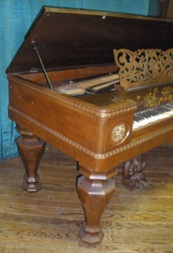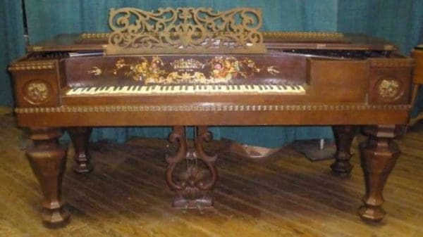 This piano is made of beautifully carved Rosewood, and is in the Empire Revival style. Note the lovely mother of pearl inlay across the front panel. The square pianos with this level of ornamentation were among the most expensive, highest grand pianos available at that time often selling for as much as a small house! This piano is truly stunning, and is an important part of America’s musical history. This piano is being restored to like-new condition.
