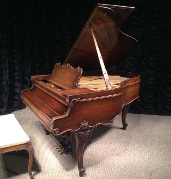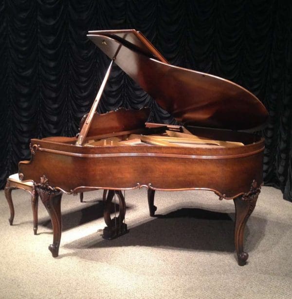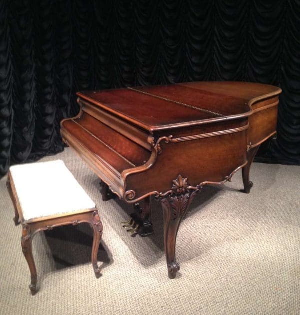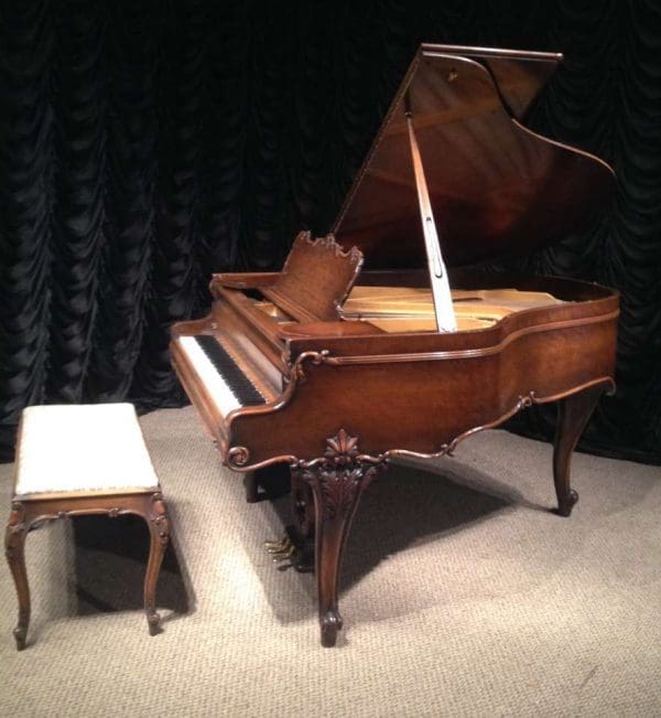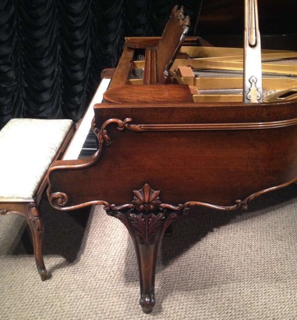 This Louis XV carved style is one of the most popular classic designs in history. A lovely example of the elaborate Louis XV style, this beautiful piano was built in 1927 by Kranich & Bach during the “Golden Age” of piano building in America. This piano is made of Honduras Mahogany wood which was originally finished in a distressed antique brown finish. The cabinet boasts beautifully carved legs and scalloping along the entire case. Although the original color was done in a brown color, the cabinet can be refinished in either reddish or brownish mahogany.This piano is being restored to like new condition, and the tone is magnificent. Even prior to restoration, it plays and sounds awesome. This is truly a very special piano from a special time in America’s piano building history.The original matching carved bench is included. If desired, this piano can be equipped with the Pianomation player system, and can play by itself by streaming music live on an iPod, computer, iPad, etc.TECHNICAL NOTE: It is true that Kranich & Bach had a unique patented action design during the early 20th Century which is obsolete today. Most conventional piano tuners do not know how to properly adjust these unique piano actions, and their parts are difficult to find. Sadly, some piano tuners will scare a would be buyer away from investing in a beautiful Kranich & Bach piano. These pianos are of amazing quality and tone and are terribly misunderstood by most conventional piano tuners. Restoration will include installing a modern-style traditional action so anyone can service it.