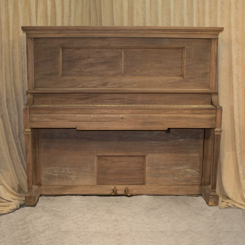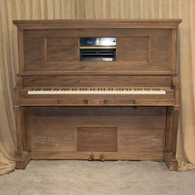 This piano was originally built as a pneumatically operated player piano which uses a perforated paper roll. The original paper roll system is driven by large foot-pumping pedals that can be accessed below the keyboard. This piano will be restored to like-new condition, inside and out, with a historical perspective in mind.