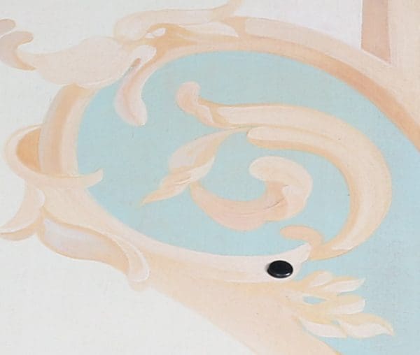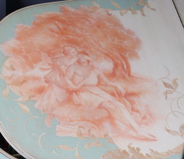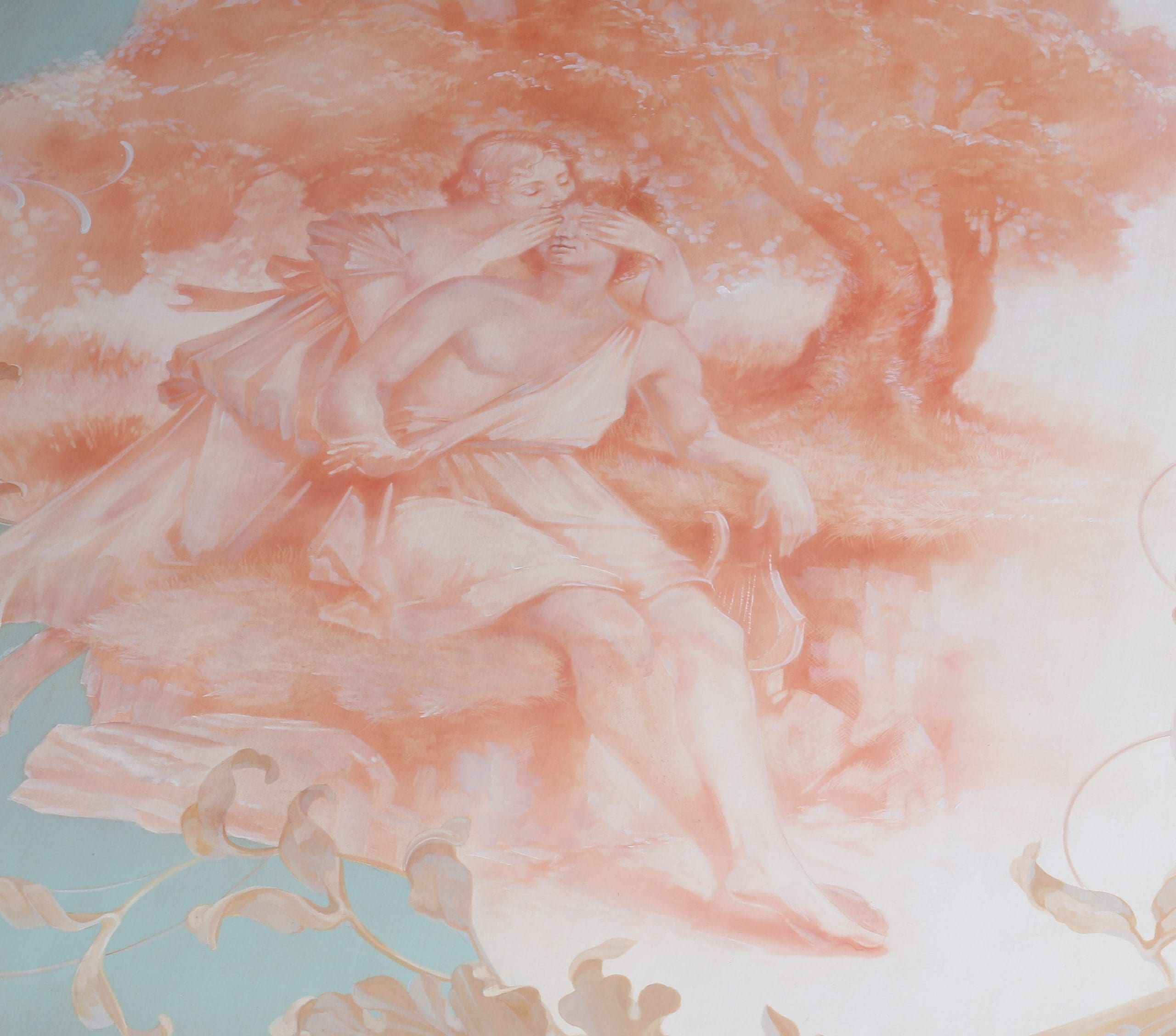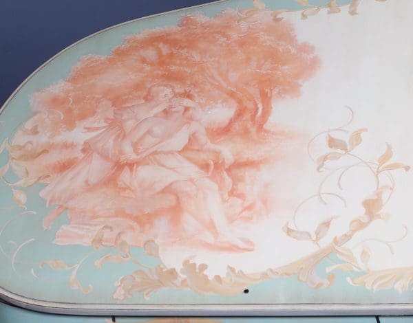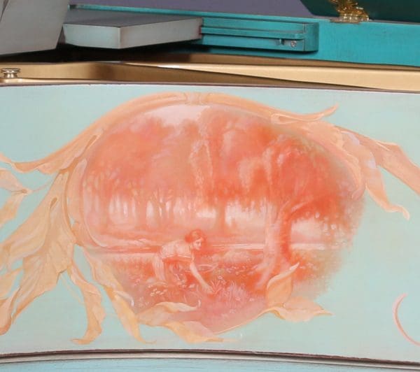 Any other mortal would have died, but Orpheus, protected by the gods and armed with his own musical virtuosity, charmed all of the underworld’s guardians and obstacles set against him. His music softened the hearts of Hades and Persephone, who agreed to allow Eurydice to return with him to earth on one condition: he should walk in front of her and not look back until they both had reached the upper world. This condition is foreshadowed by the outstanding scene depicted in the piano’s lid, the tender illustration of Eurydice playfully covering the eyes of Orpheus surprised mid song.