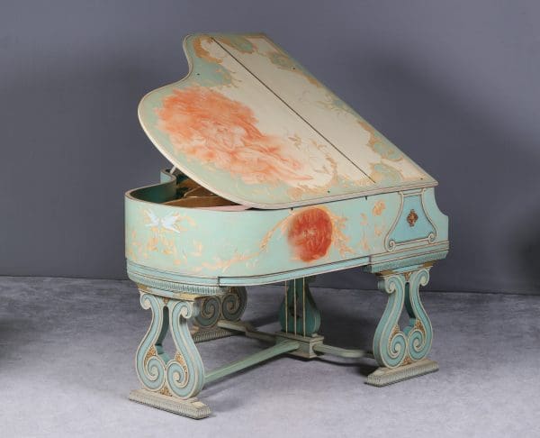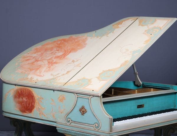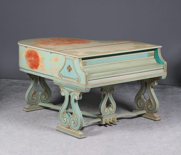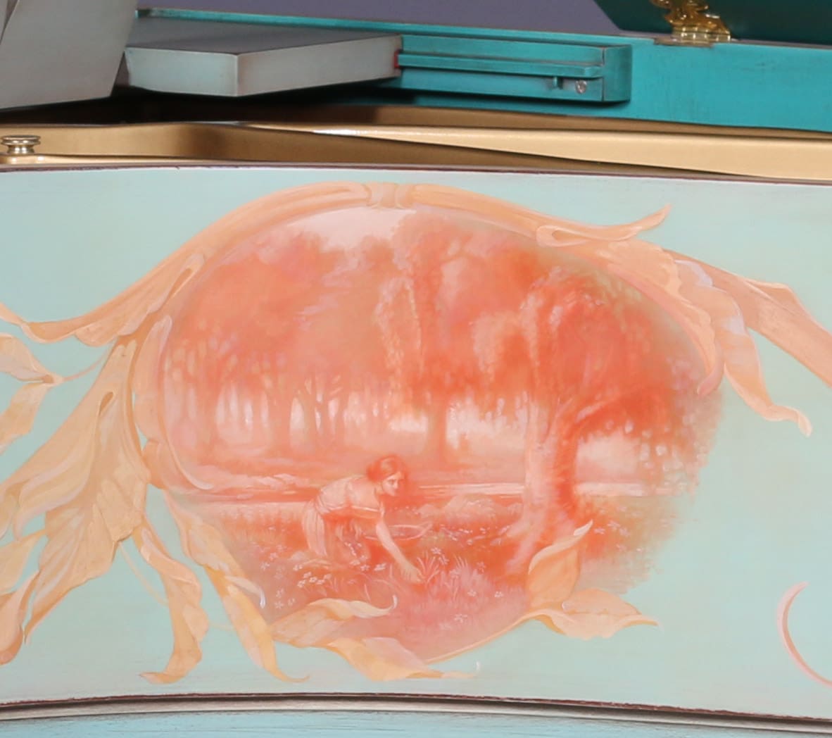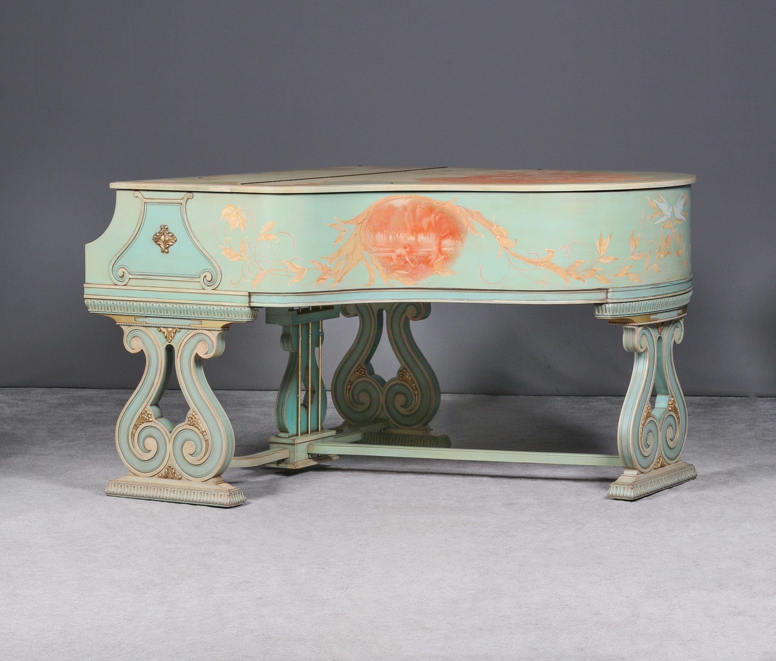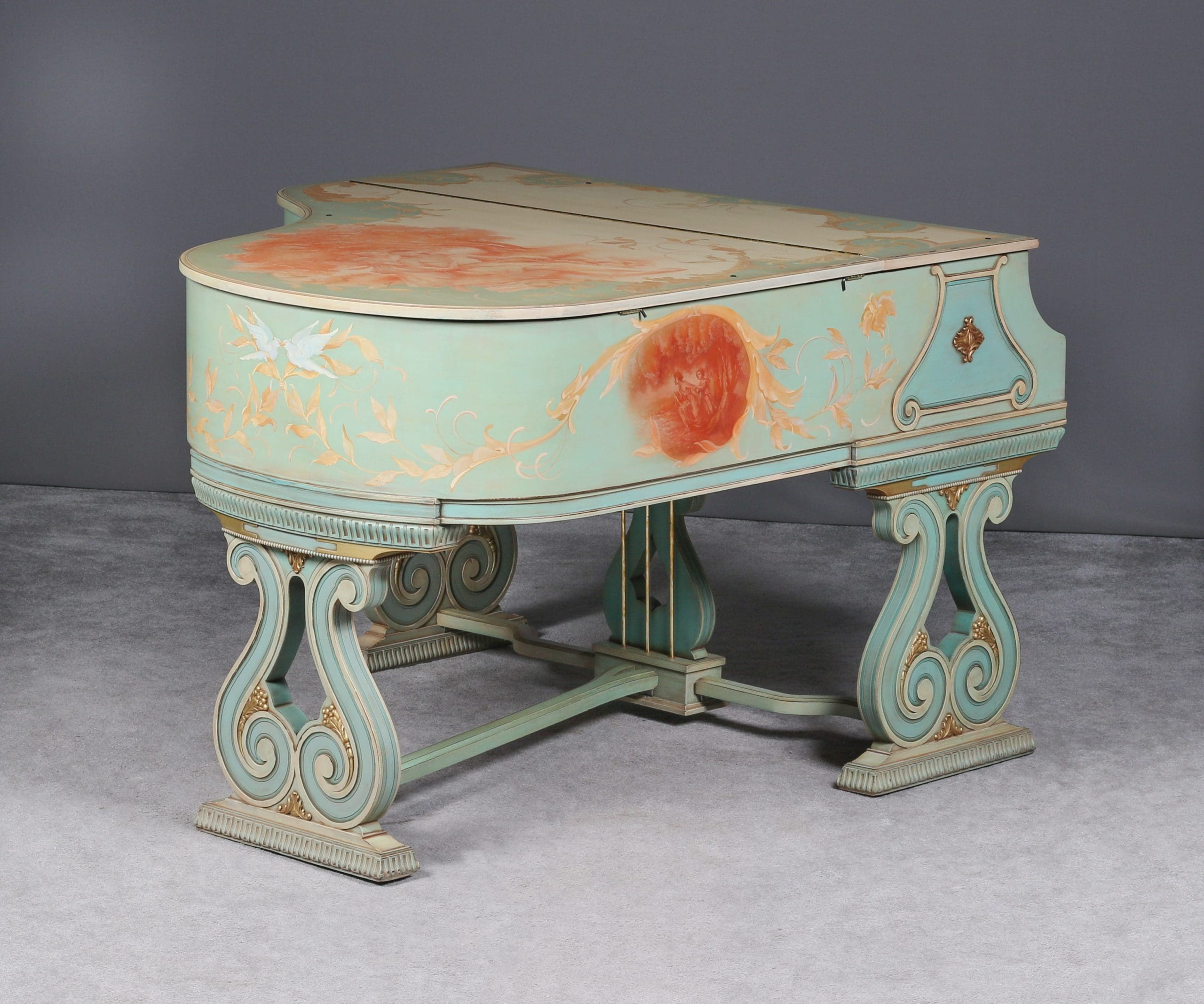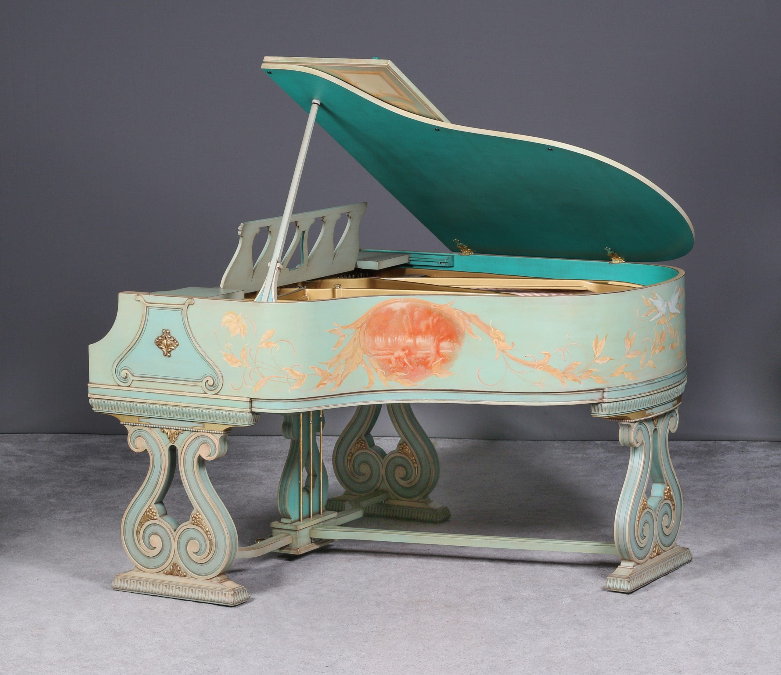 This beautiful Marshall & Wendell grand was built in 1927, a period of great opulence in America. The piano is hand-painted in the Neoclassical style and is adorned with detailed with exquisite scenery. The instrument is finished with a hand-painted Celadon and pink color tone, pulled together with antique gold accents.