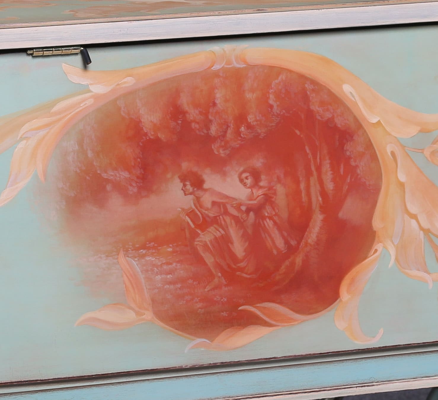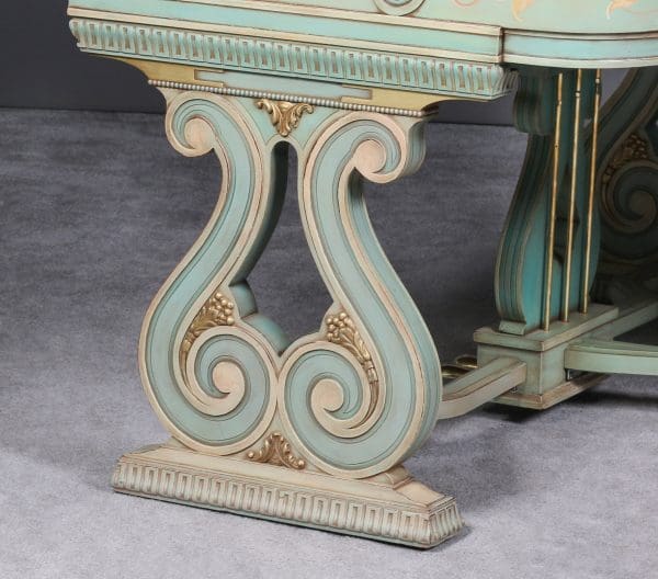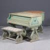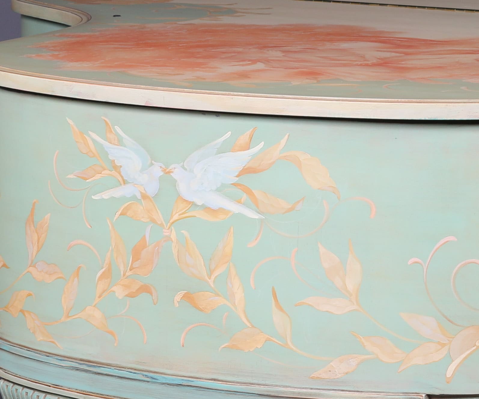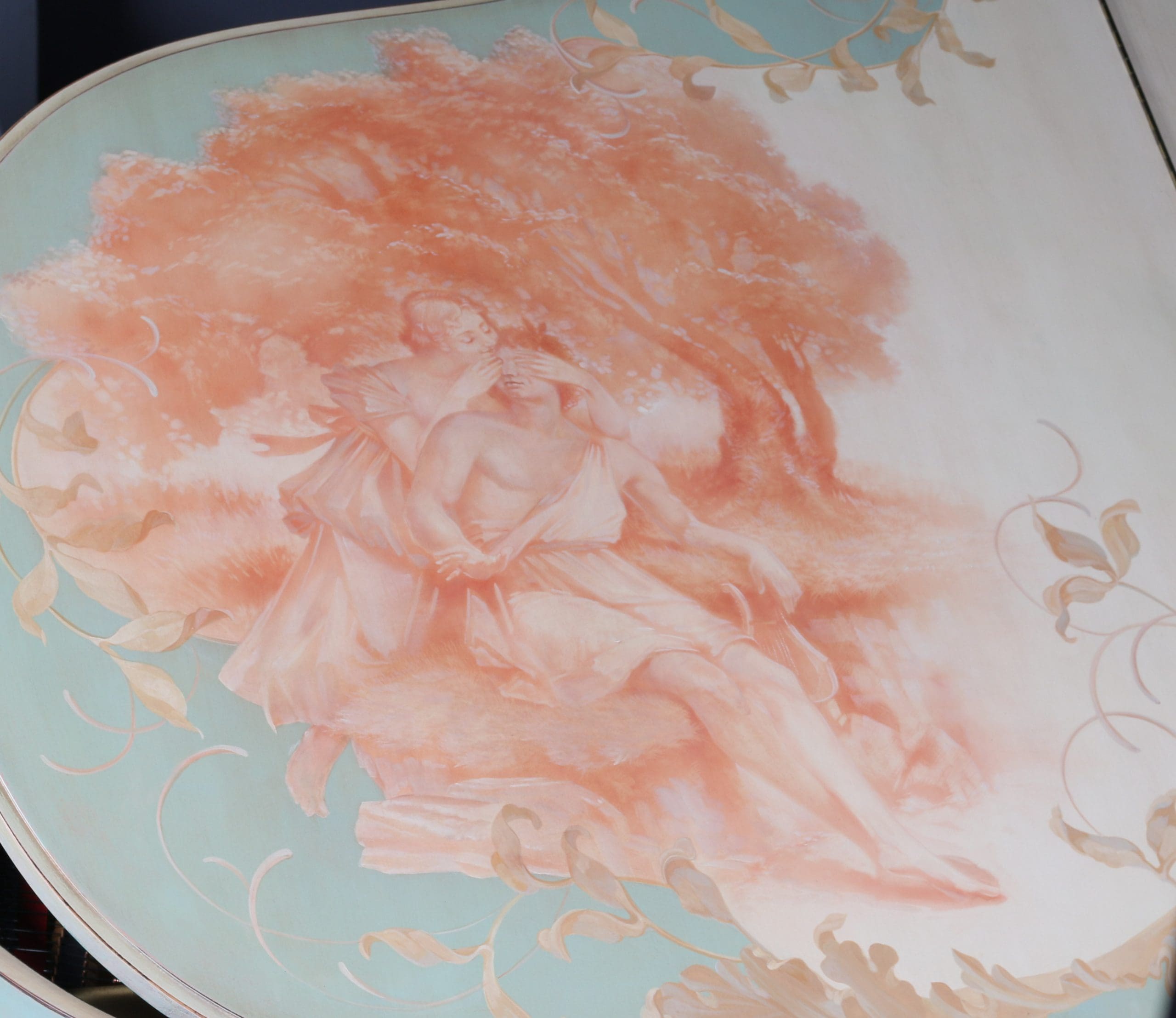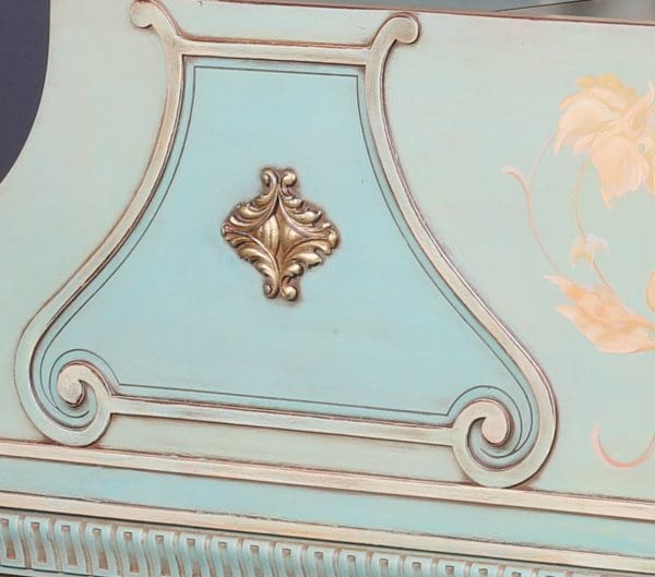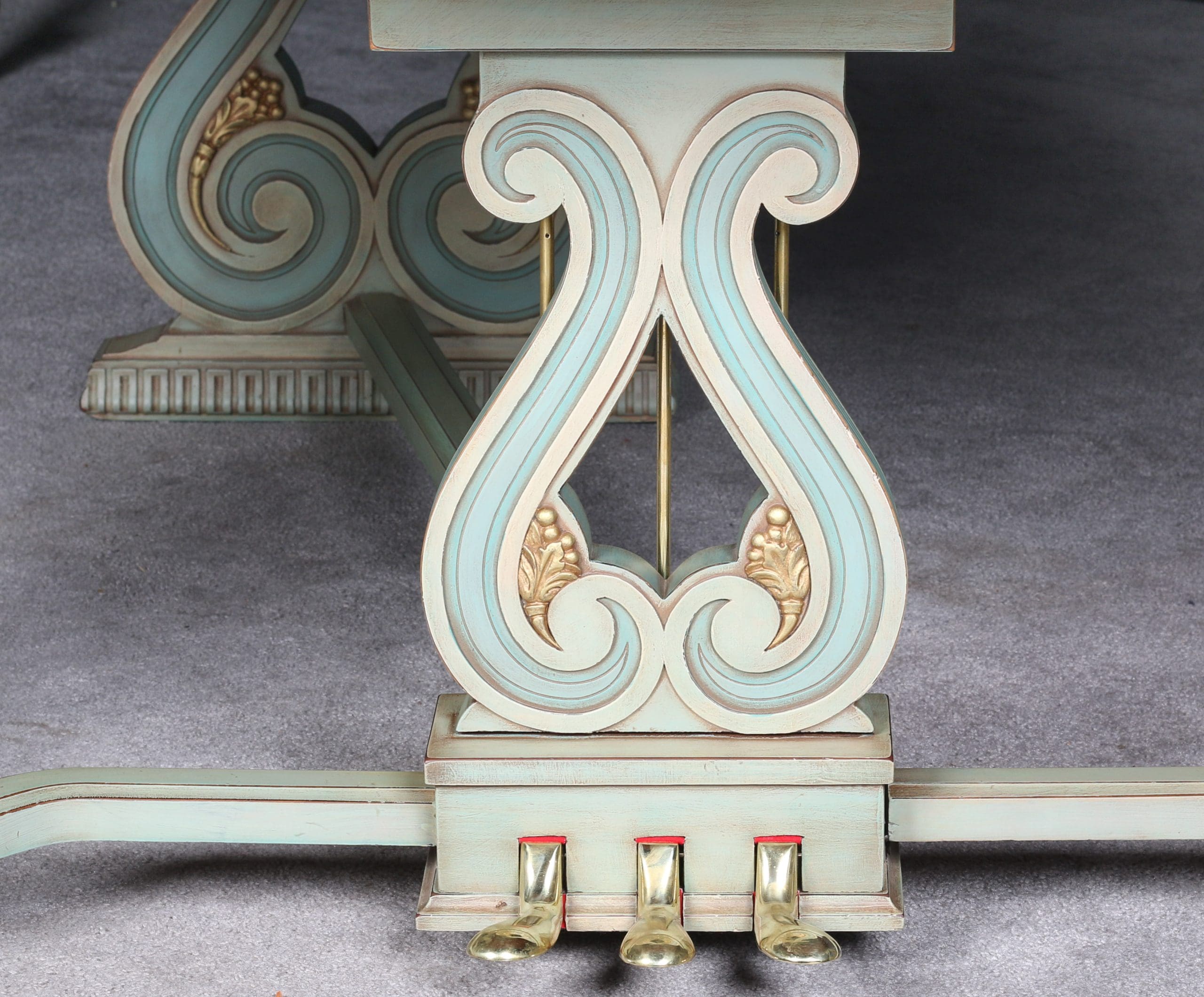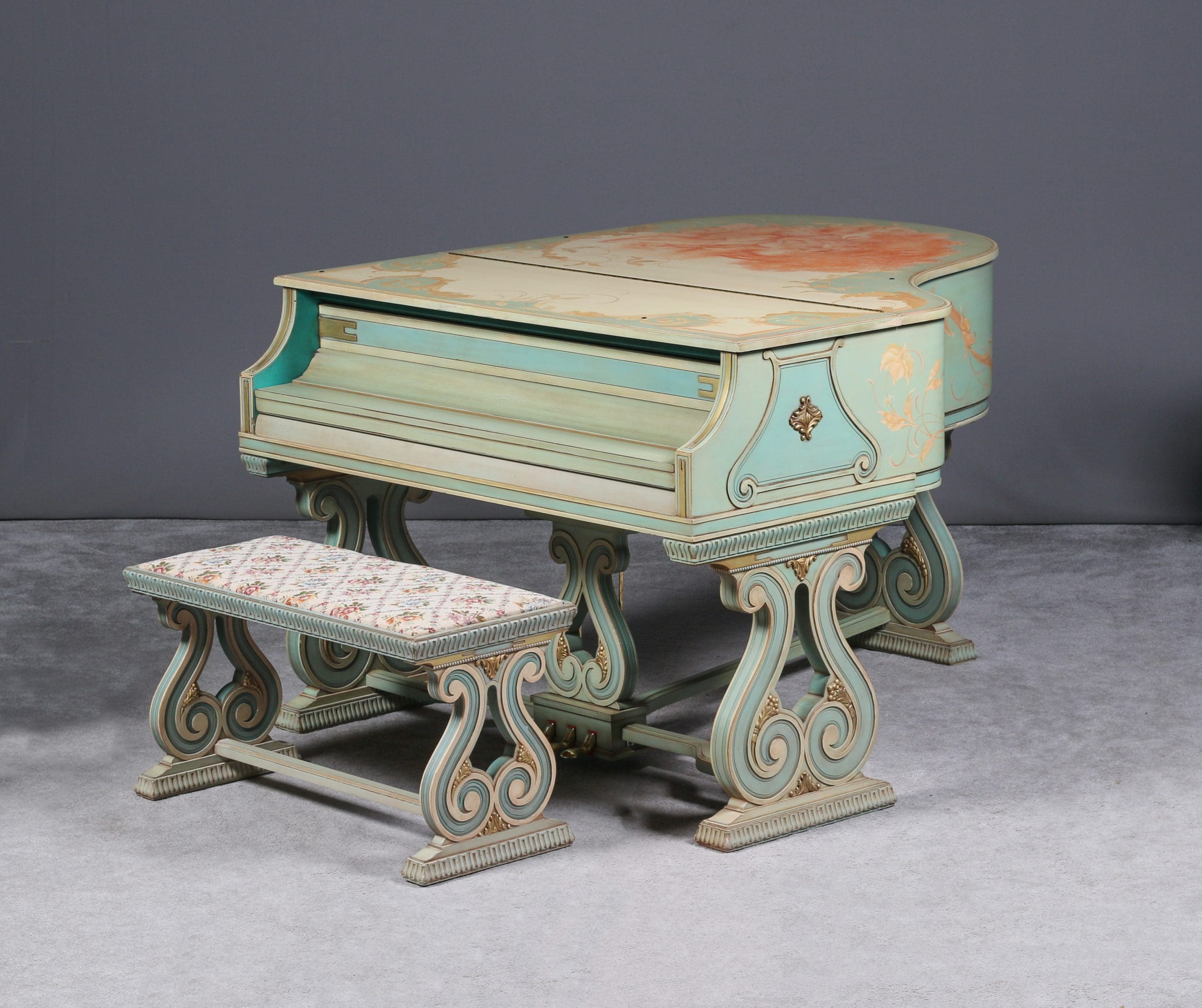 This beautiful Marshall & Wendell grand was built in 1927, a period of great opulence in America. The piano is hand-painted in the Neoclassical style and is adorned with detailed with exquisite scenery. The instrument is finished with a hand-painted Celadon and pink color tone, pulled together with antique gold accents.