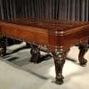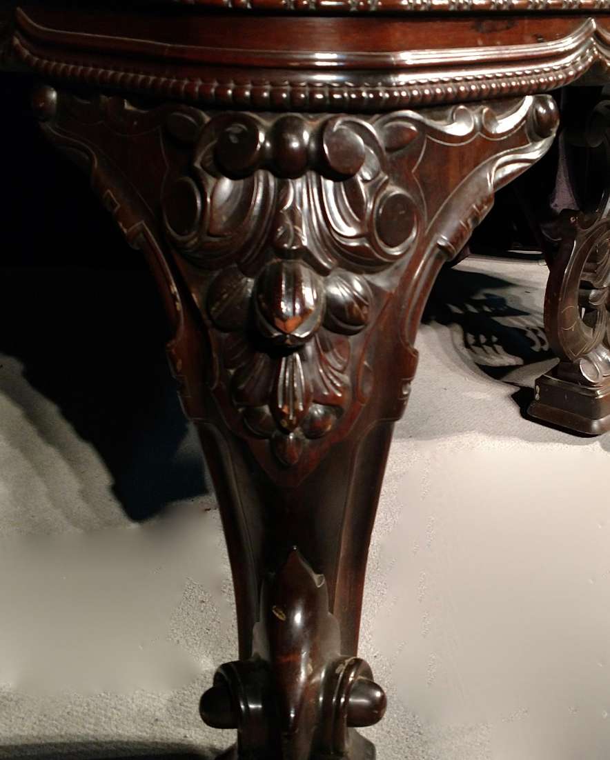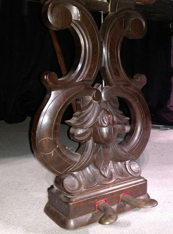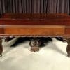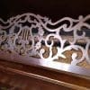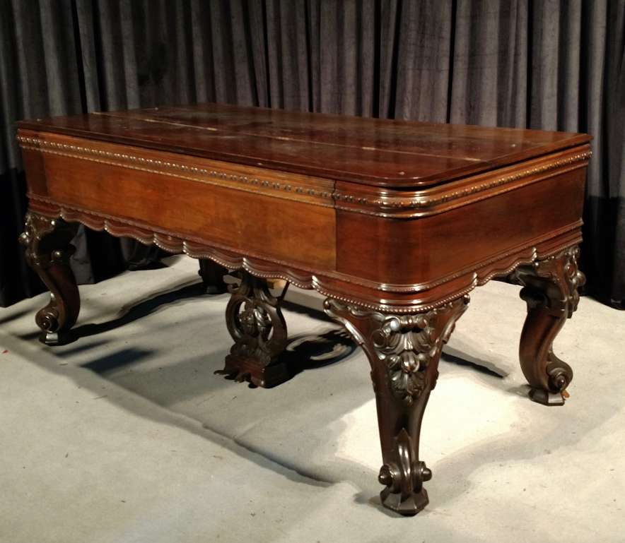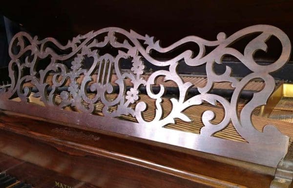This is a beautiful late model “Orchestral” model square grand piano by the Mathushek Piano Company. The “Orchestral” was the largest and most expensive model square grand piano offered by the firm. Mathushek was known for getting the largest tone out of the smallest space, so these large Orchestral square pianos sound truly amazing. Note the heavily carved scalloping around the edges of the case, as well as an ornate grilled music rack. It is rare that one has the opportunity to play an Orchestral square piano, and many are surprised at how pleasing an instrument it can be to listen to. This piano is being restored to like new condition, inside and out.