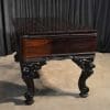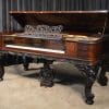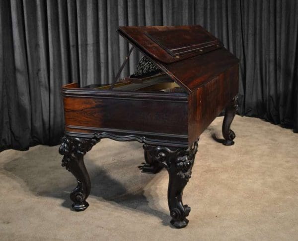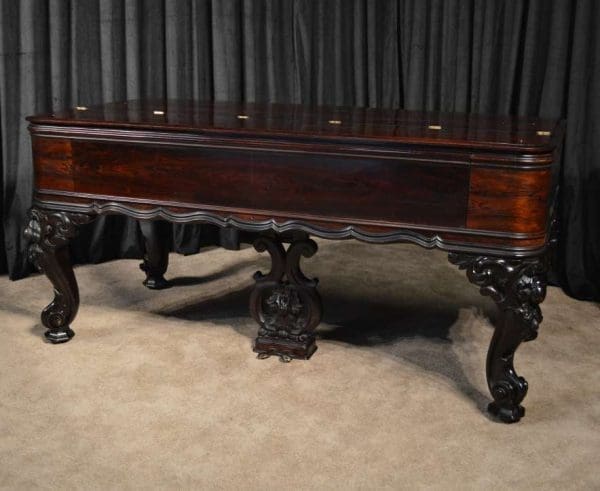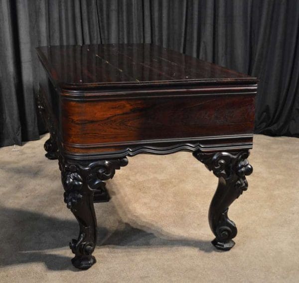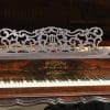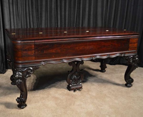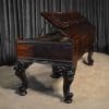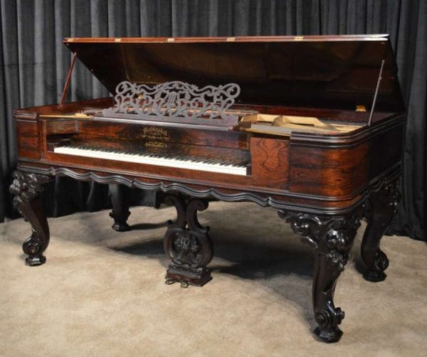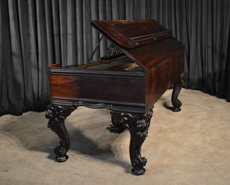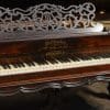 This piano has been very well preserved, and the beautiful color of the rosewood case can be seen at the front view of the instrument. Note the heavily carved scalloping around the edges of the case, as well as an ornate grilled music rack. It is rare that one has the opportunity to play an Orchestral square piano, and many are surprised at how pleasing an instrument it can be to listen to.