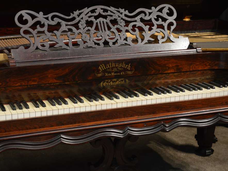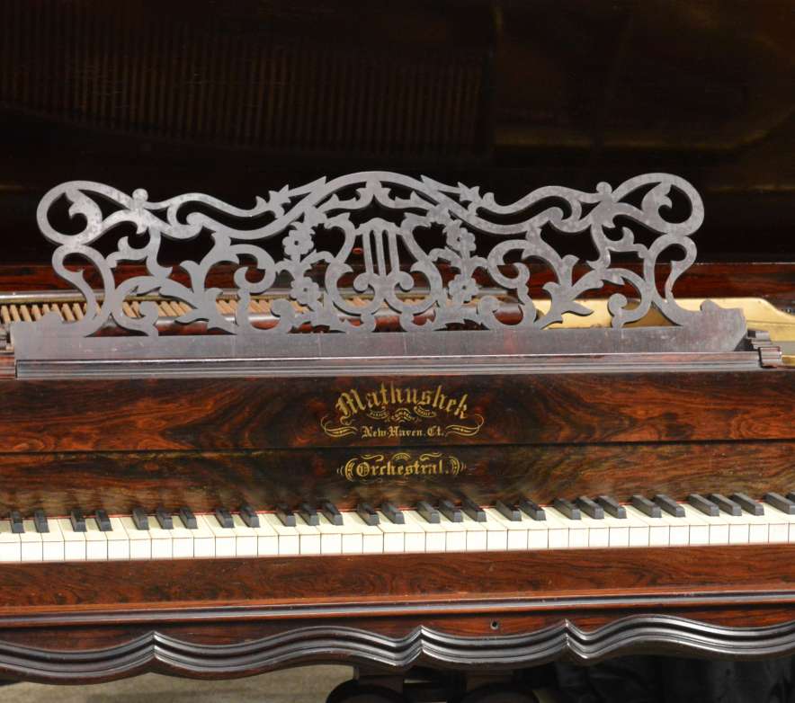 This beautiful instrument is known as the “Orchestral” model is known as the “Orchestral” Square Grand Piano by the Mathushek Piano Company of New Haven, CT. Mathushek was known for getting the largest tone out of the smallest space, so these large Orchestral square pianos sound truly amazing.