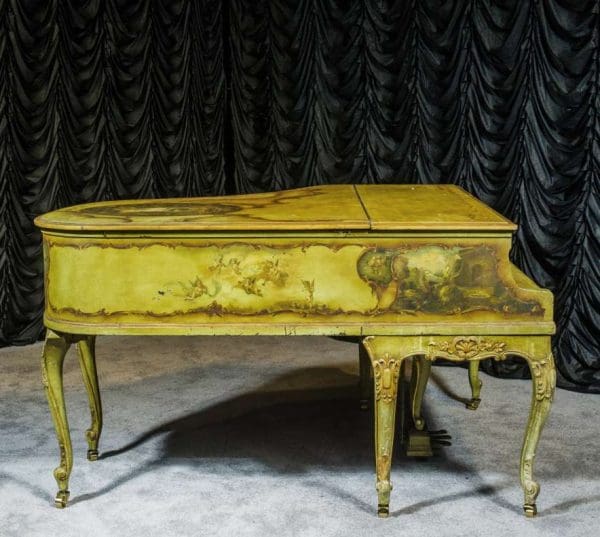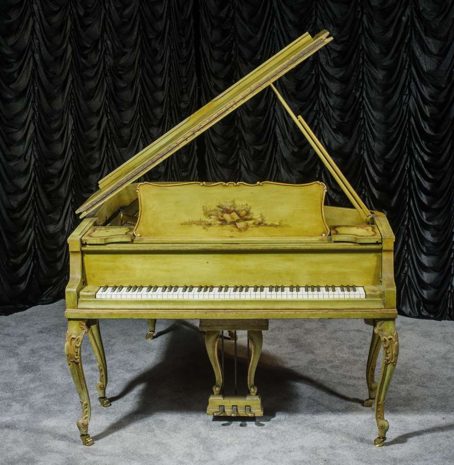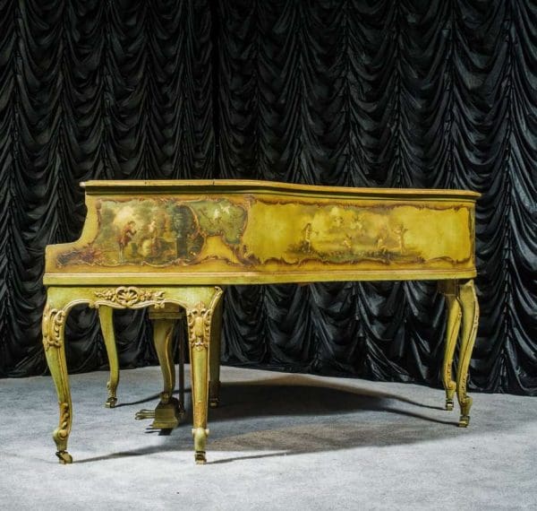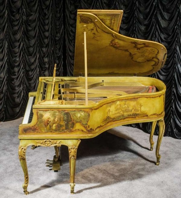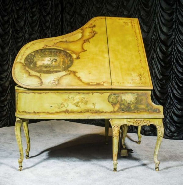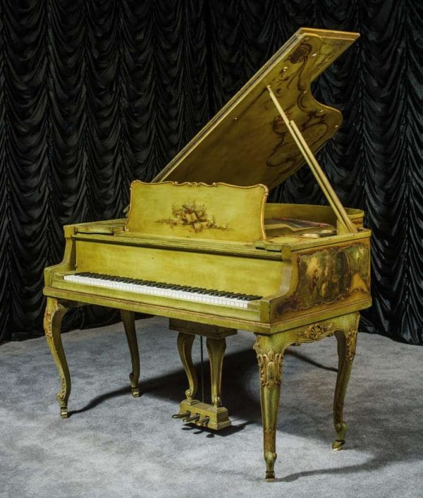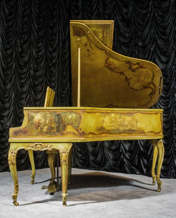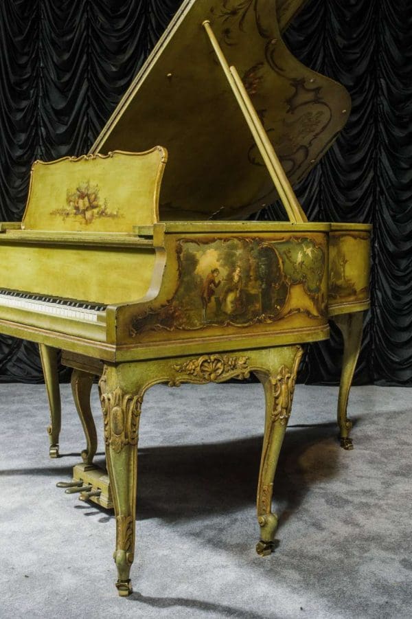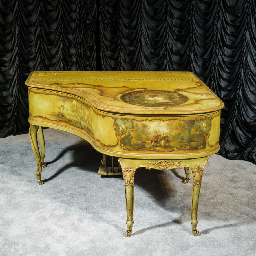 This beautiful Knabe grand was built in 1922 and is one of the most intricately decorated pianos we have in our collection. The piano is hand-painted in the Neoclassical style and is adorned with angels, cherubs and lovers. The painted scenery is framed in beautifully gilded trim. The highly carved Louis XV style cabinet is exquisitely executed in superb detail with a lovely antique and aged patina. The lavish painted scenery and incredibly carved detail come together to give the instrument has an overall formal and elegant appearance. The instrument is signed by artist Harmen C. Koops (Born 1898 in Holland – Died 1957 in Los Angeles).