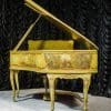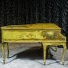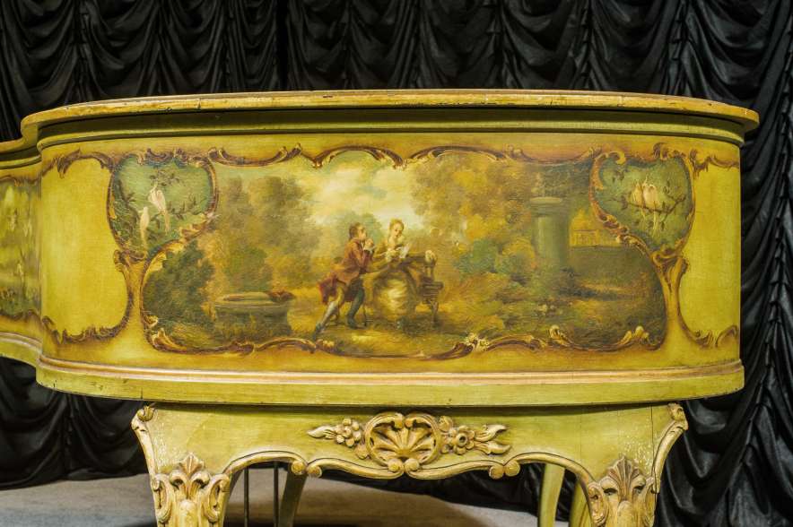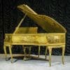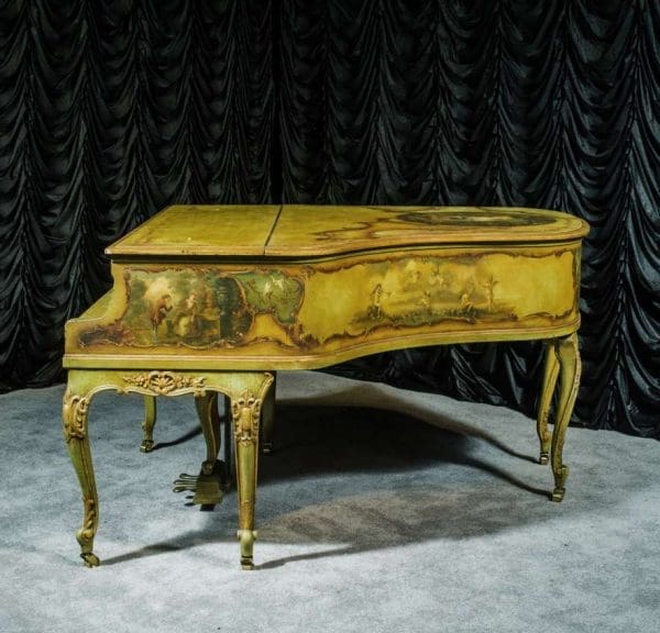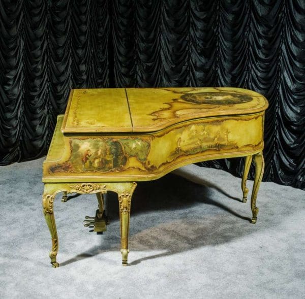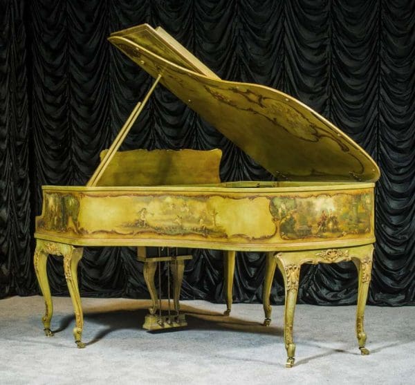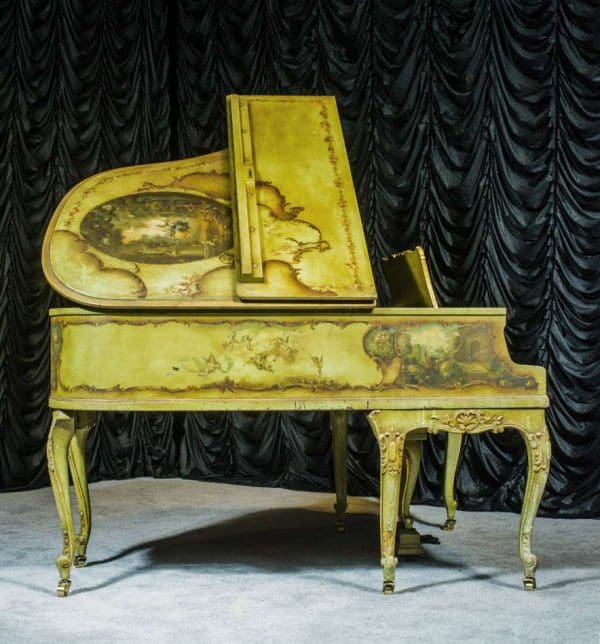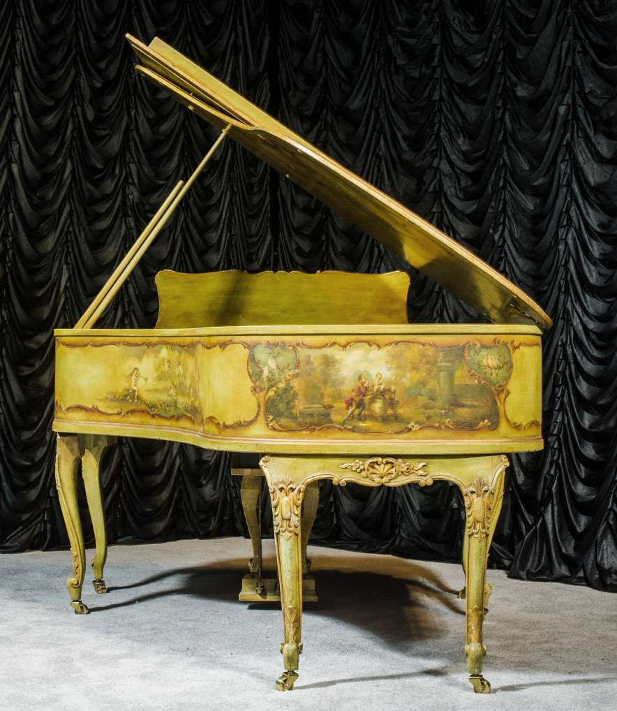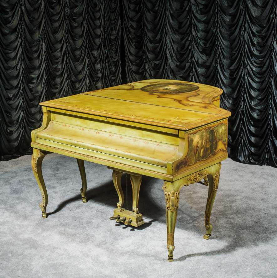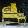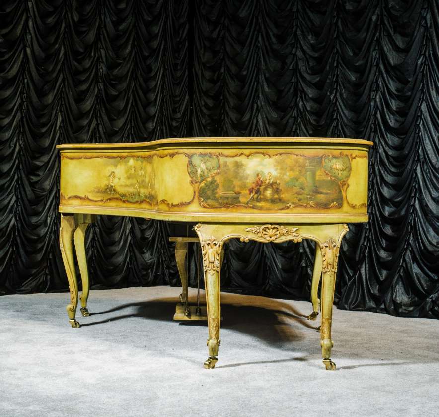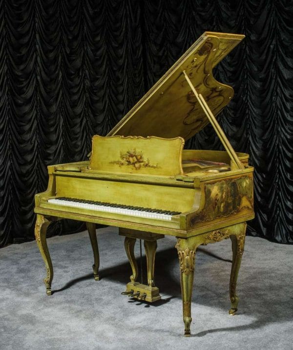 This beautiful Knabe grand was built in 1922 and is one of the most intricately decorated pianos we have in our collection. The piano is hand-painted in the Neoclassical style and is adorned with angels, cherubs and lovers. The painted scenery is framed in beautifully gilded trim. The highly carved Louis XV style cabinet is exquisitely executed in superb detail with a lovely antique and aged patina. The lavish painted scenery and incredibly carved detail come together to give the instrument has an overall formal and elegant appearance. The instrument is signed by artist Harmen C. Koops (Born 1898 in Holland – Died 1957 in Los Angeles).