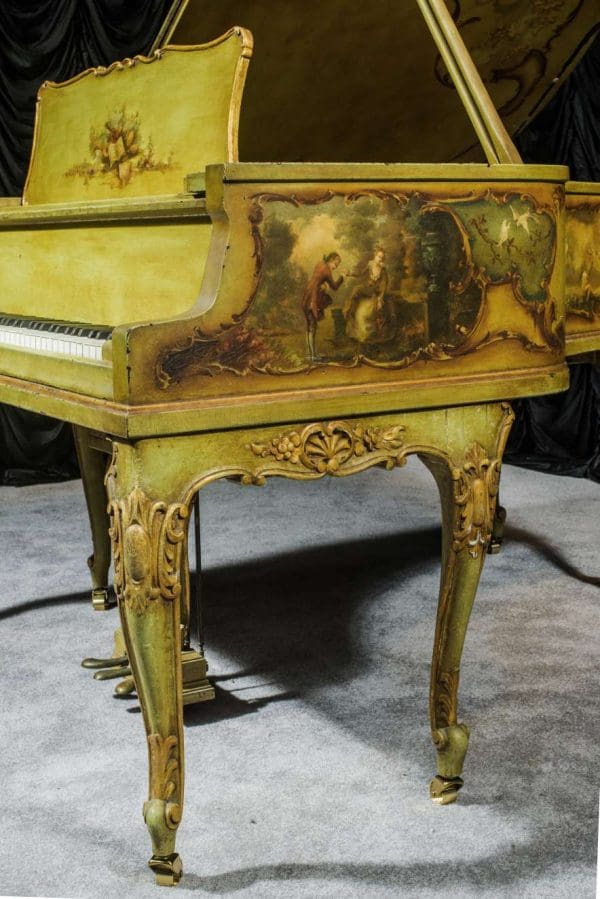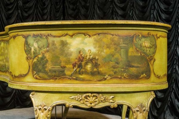 Not unlike 18th Century France, Turn-Of-The-Century America was a period of lavish lifestyles, excessive luxury and great prosperity. Several piano manufacturers specialized in creating custom, one-of-a-kind pianos on special order for wealthier clients in order to match their homes décor often in historical or period furniture styles. In the early 20th Century, it was not uncommon for a wealthy client to visit the prominent Knabe Piano Factory, choose the instrument they preferred among all others, then have the factory commission a specialized cabinet maker and artist to design and build a custom cabinet around the instrument they chose. This piano would have been picked out among many for its fine tone quality, and then a small fortune spent to have the cabinet custom made to suit the clients décor!