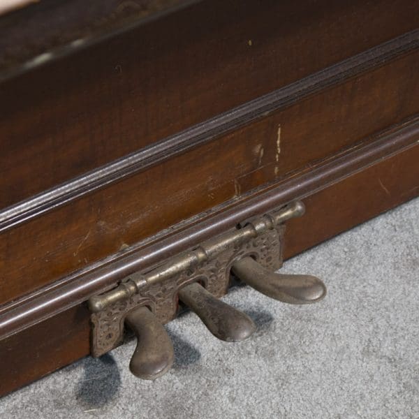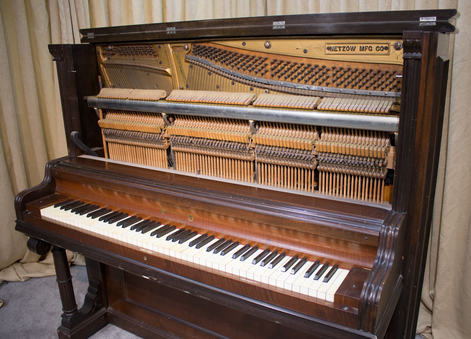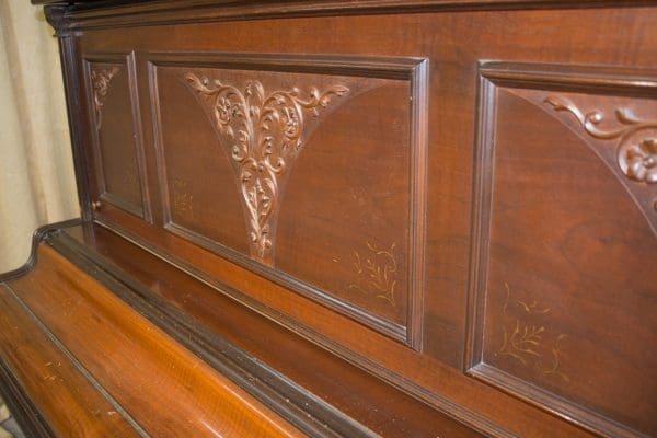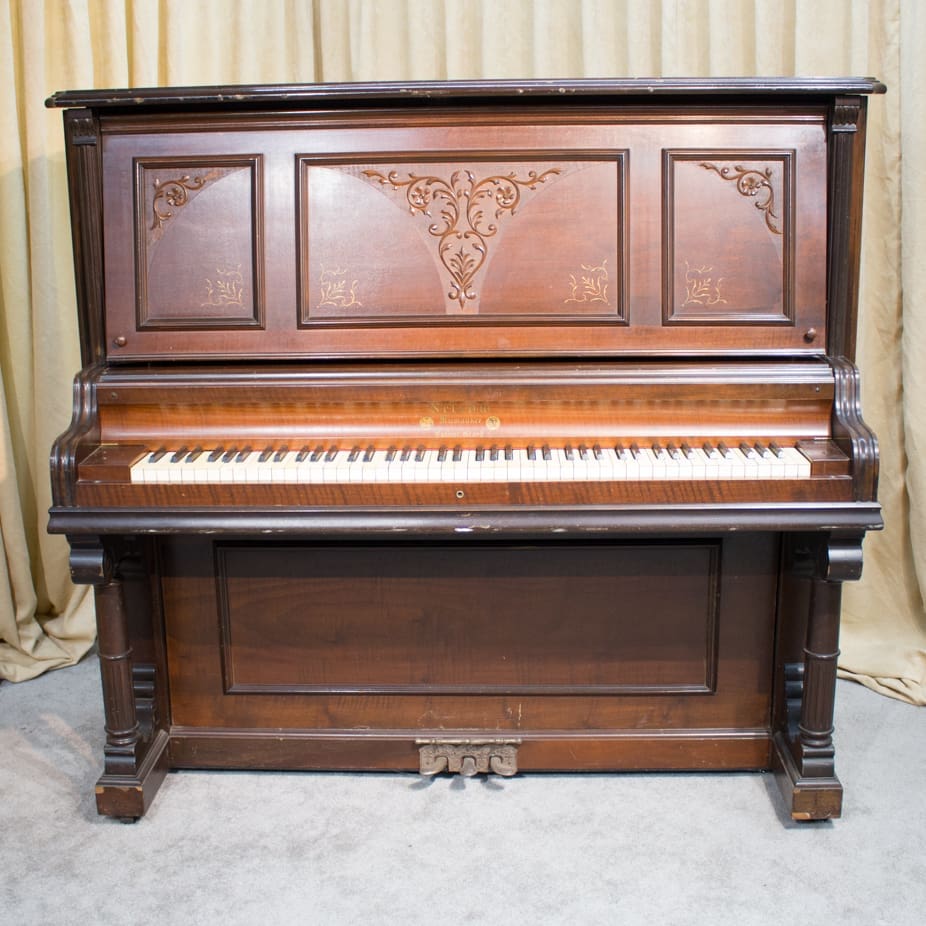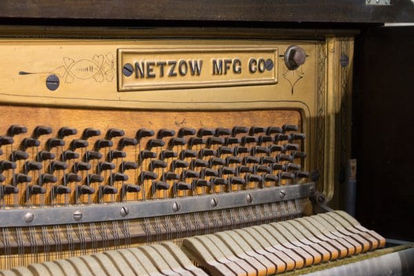 The Netzow Manufacturing Company was one of Milwaukee’s most successful piano manufacturers. This instrument is a beautiful example of Netzow’s extraordinary craftsmanship from the early 20thCentury. The piano is made of richly figured walnut wood and is of the Edwardian style. The Edwardian period (named for the reign of King Edward VII from about 1900 – 1910) was a transitional period that went from the elaborately carved Victorian style to the more stream-lined “modern” styles of the 20thCentury. This piano has a simple, elegant look with subtle carved details without being “too much”.