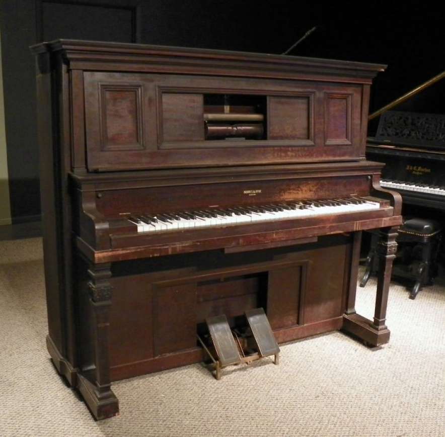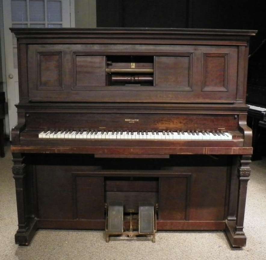 The Norris & Hyde Piano Company was established in 1873 in Neponset, Massachusetts, and they were known for building very good quality pianos and player pianos. This player piano is one of their higher-grade models, as it is a larger, more elaborate model than most. Note the attractive inset panels and carved moldings. This piano is made of beautiful mahogany wood, and will be stunning after restoration. It can be electrified if desired, which will not interfere with the original foot-pumping mechanisms. An original matching bench is included.