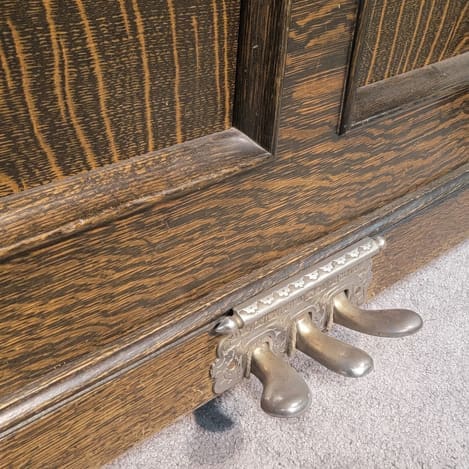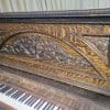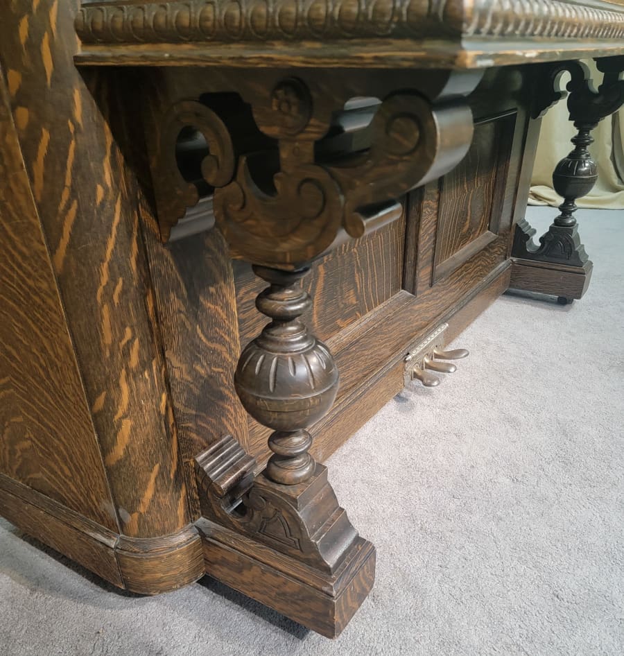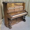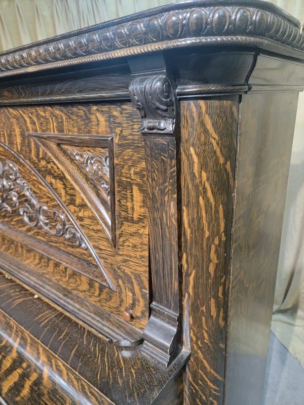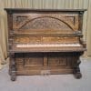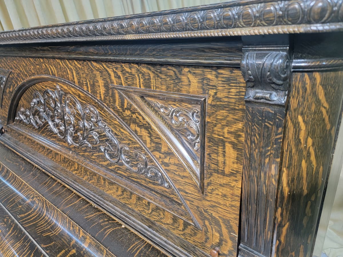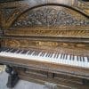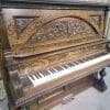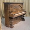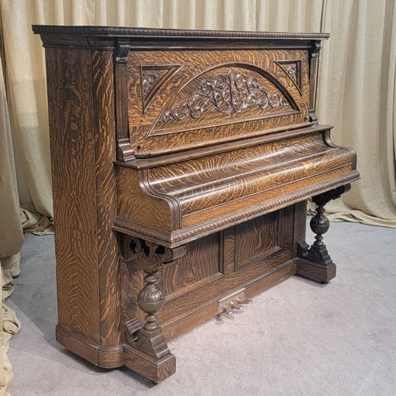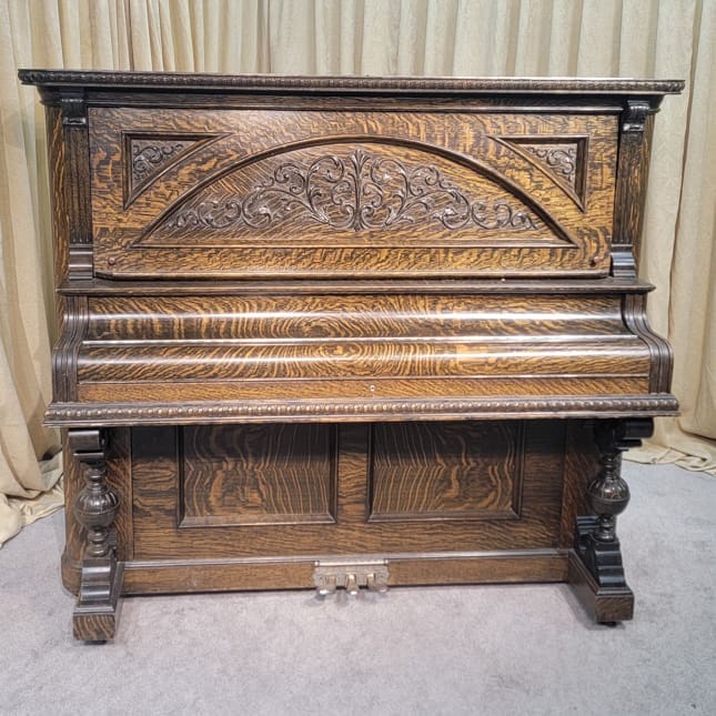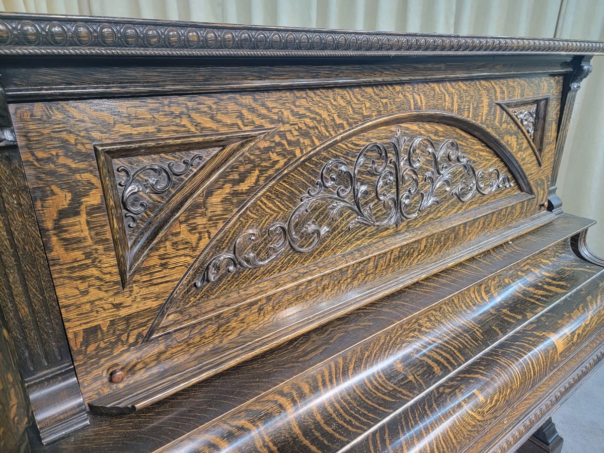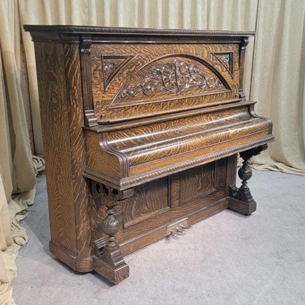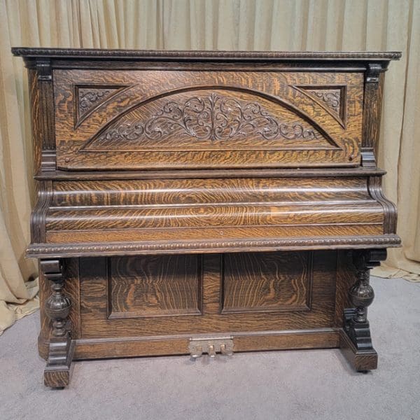 This piano is made of beautiful quarter sawn oak wood and is of the carved Victorian style. Note the elegant carvings on the front panel on beautifully turned legs and trusses. This instrument is a full size upright piano with very long strings and broad soundboard area, giving a full, deep tone comparable to most baby grand pianos.