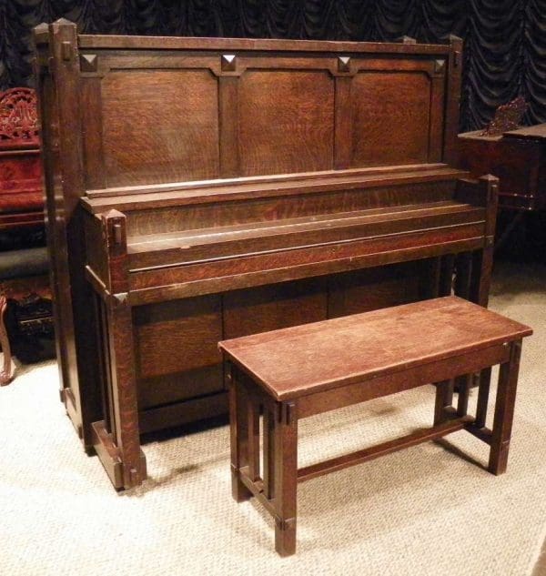 Note: As founder of The Antique Piano Shop, I have personally collected Mission / Arts & Crafts style pianos for over 25 years. I have a great passion for anything Mission / Arts & Crafts, including Craftsman homes, furniture, and accessories. If you are a true Arts & Crafts enthusiast, you will appreciate how impossible it is to find true Arts & Crafts / Mission style pianos in today’s market. Nearly three decades of collecting and preserving these “impossible to find” instruments has allowed me the opportunity to present the largest collection of true Mission / Arts & Crafts style instruments anywhere in the world.