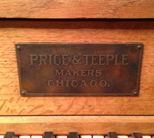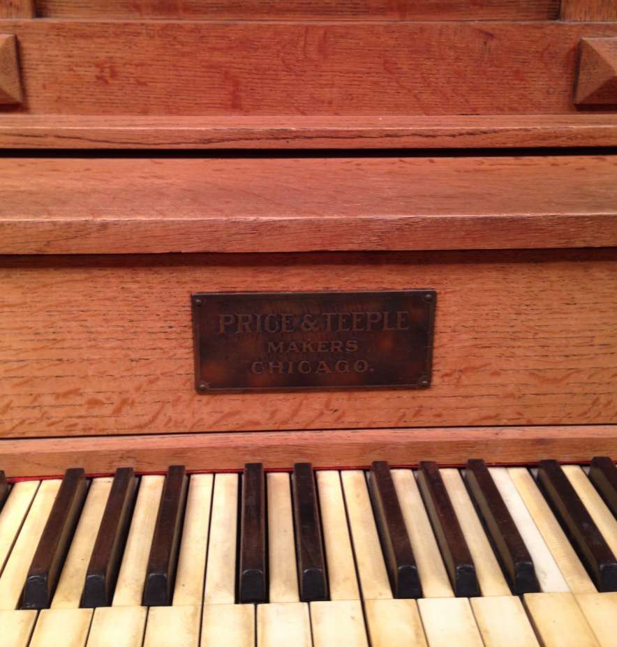 This piano was built by The Price & Teeple Piano Company in 1910 and is one of the most detailed Mission style upright pianos we have in our collection. Even now, prior to restoration, the instrument has a large, full sound; the tone quality will be of superior quality once the instrument is internally restored.