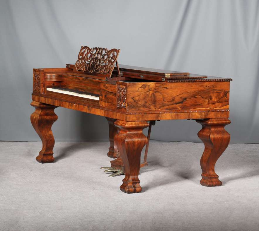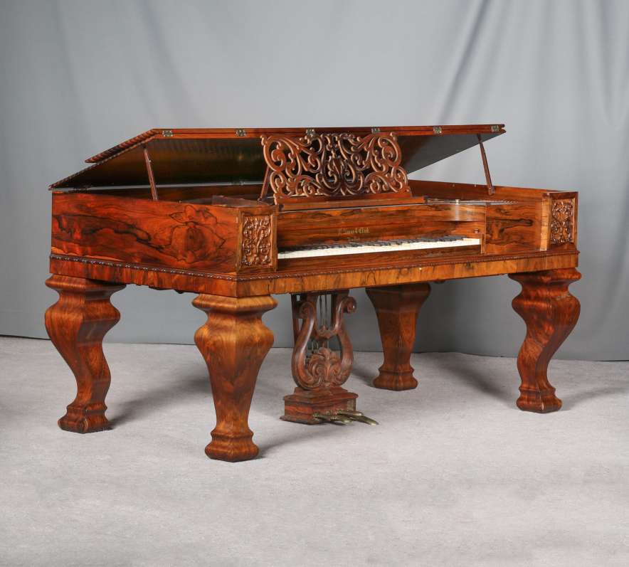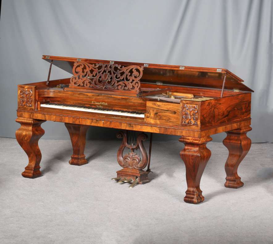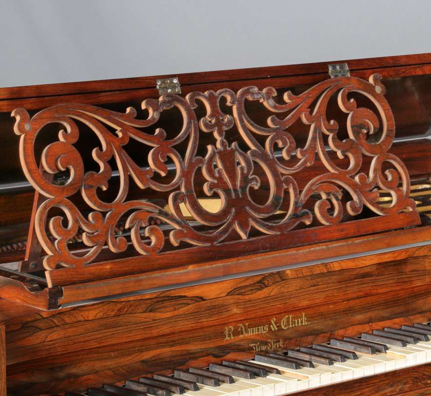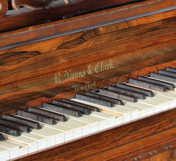 The firm of Robert Nunns and John Clark was one of the most celebrated American piano makers of the 19th Century. Nunns & Clark built a full line of elaborate, high-quality square grand pianos in New York for decades and they are considered some of the finer square grand pianos every built by today’s collectors.