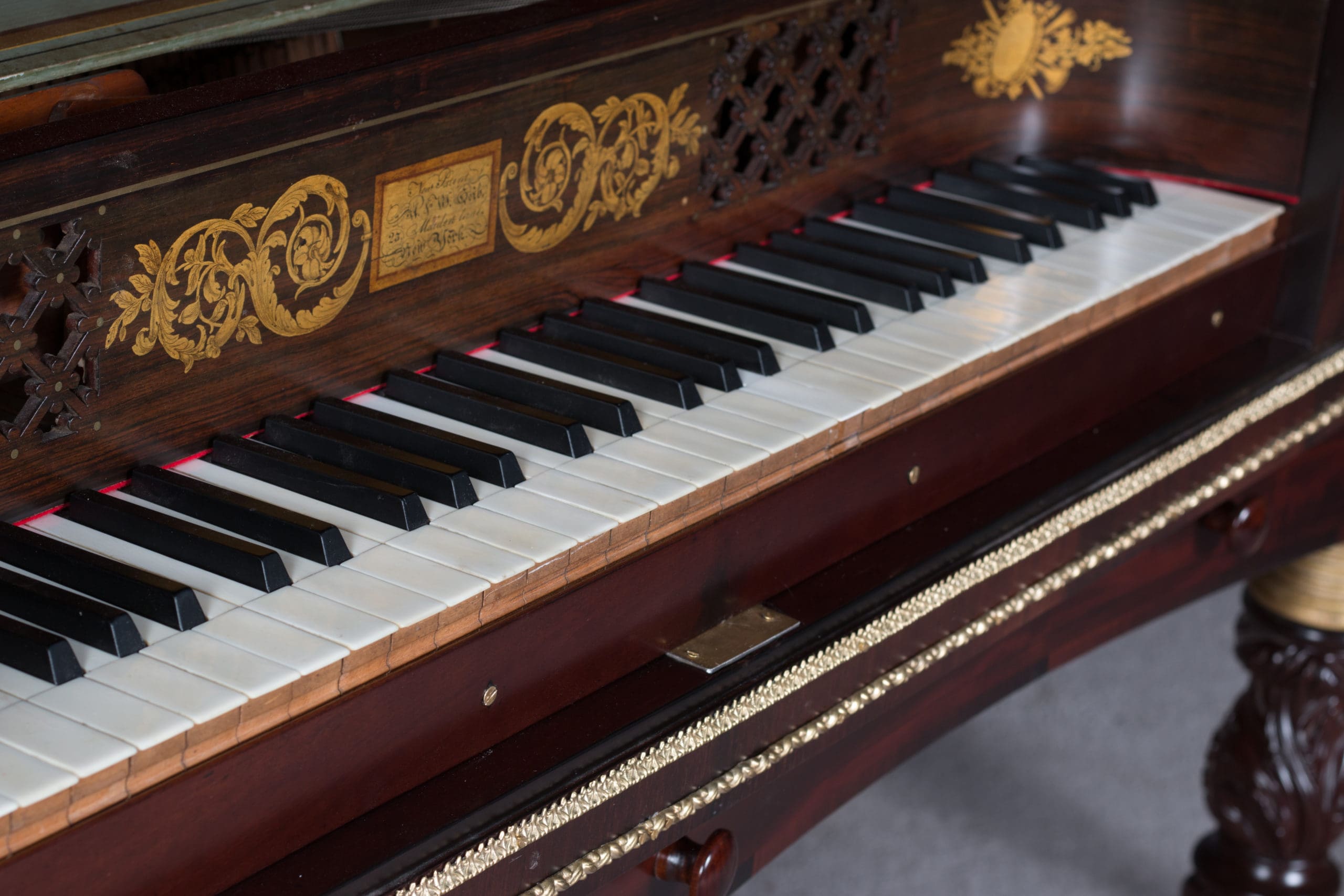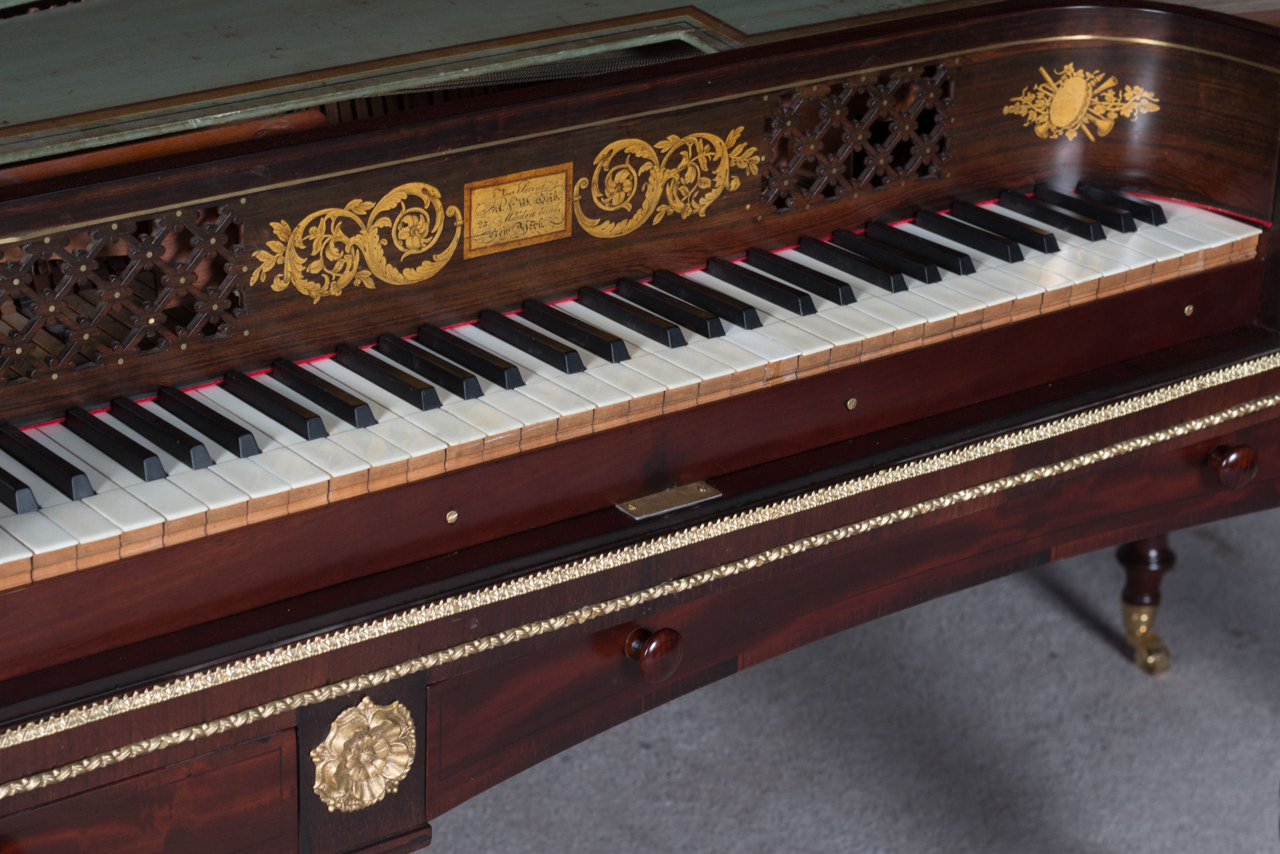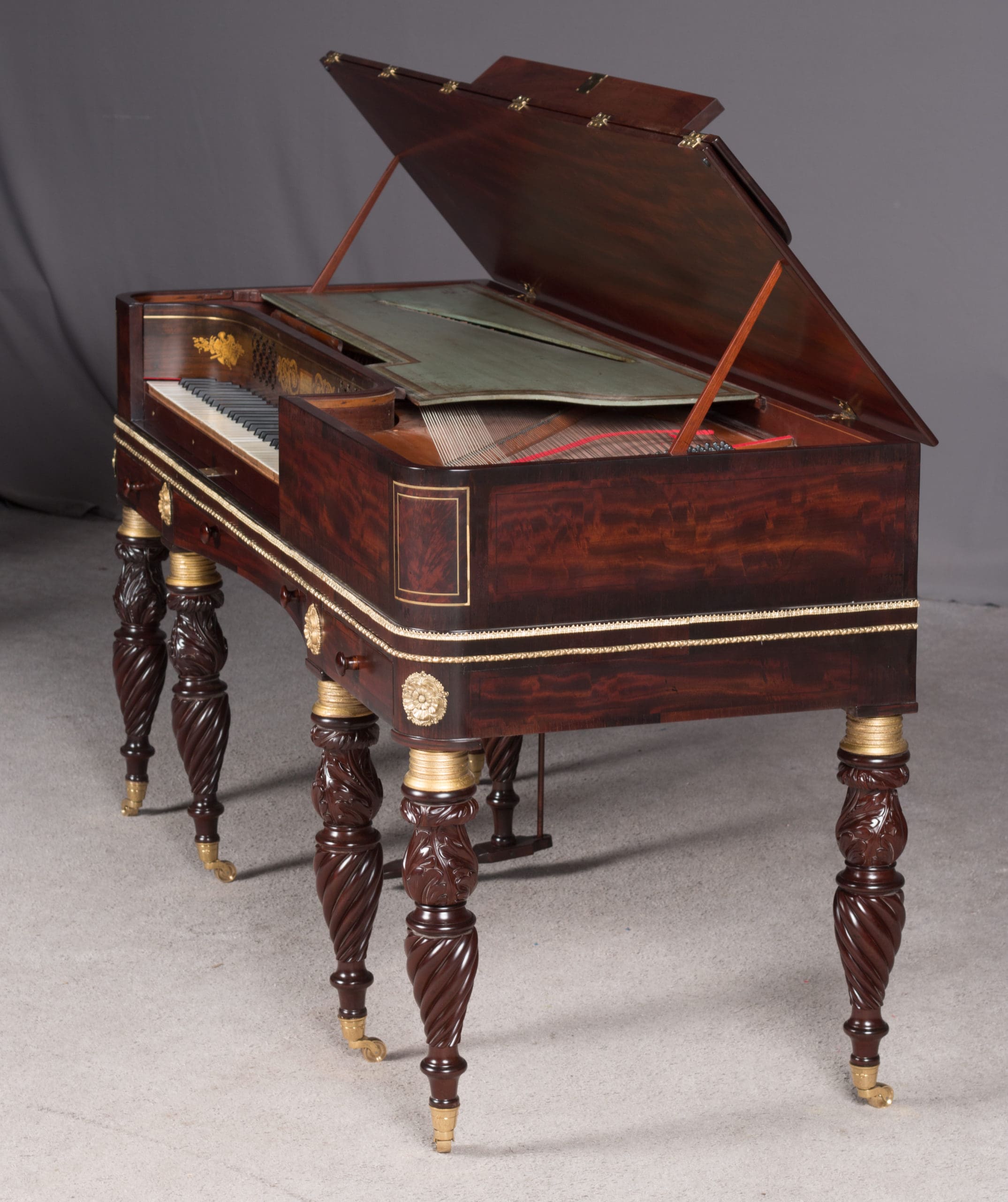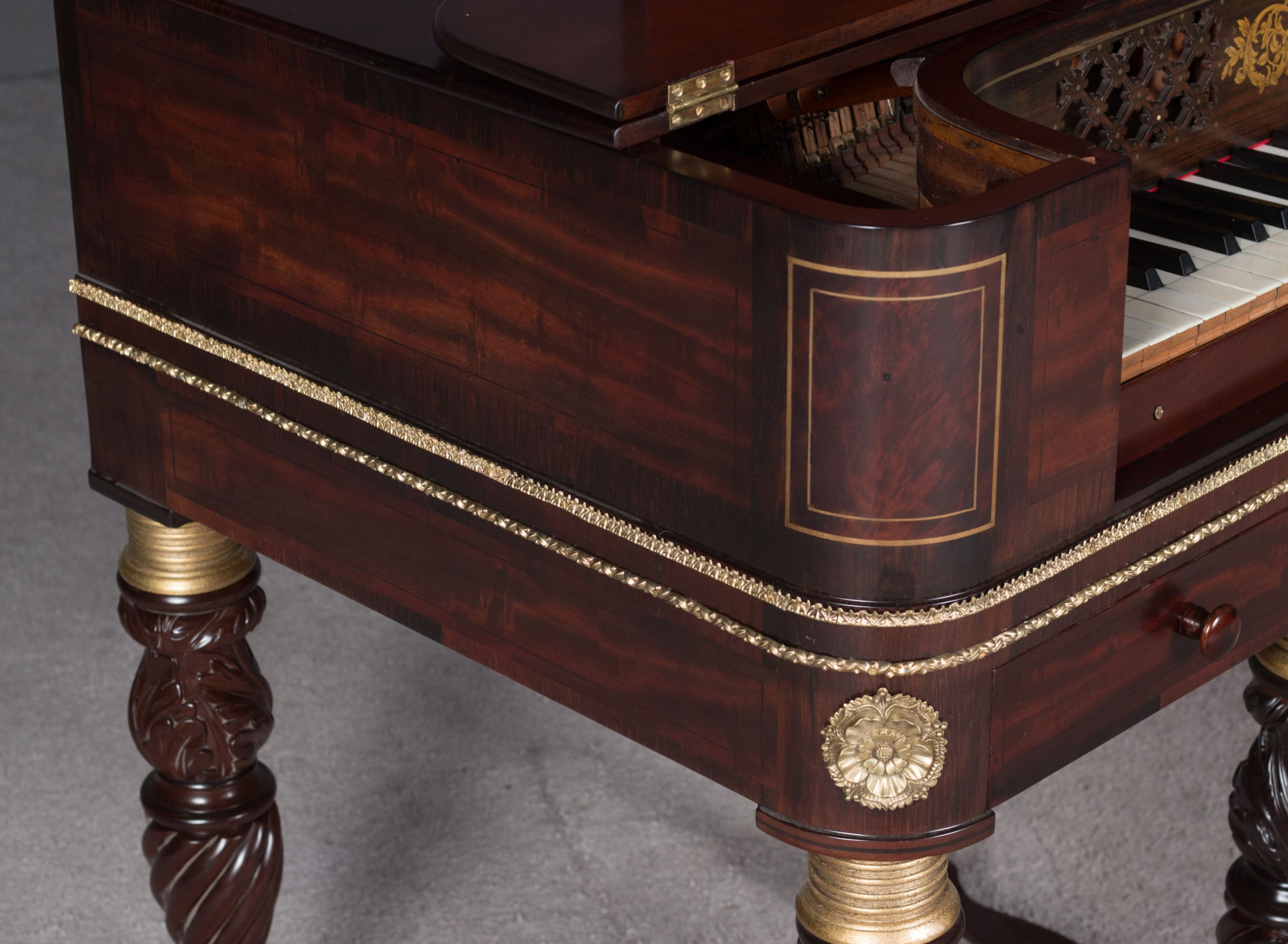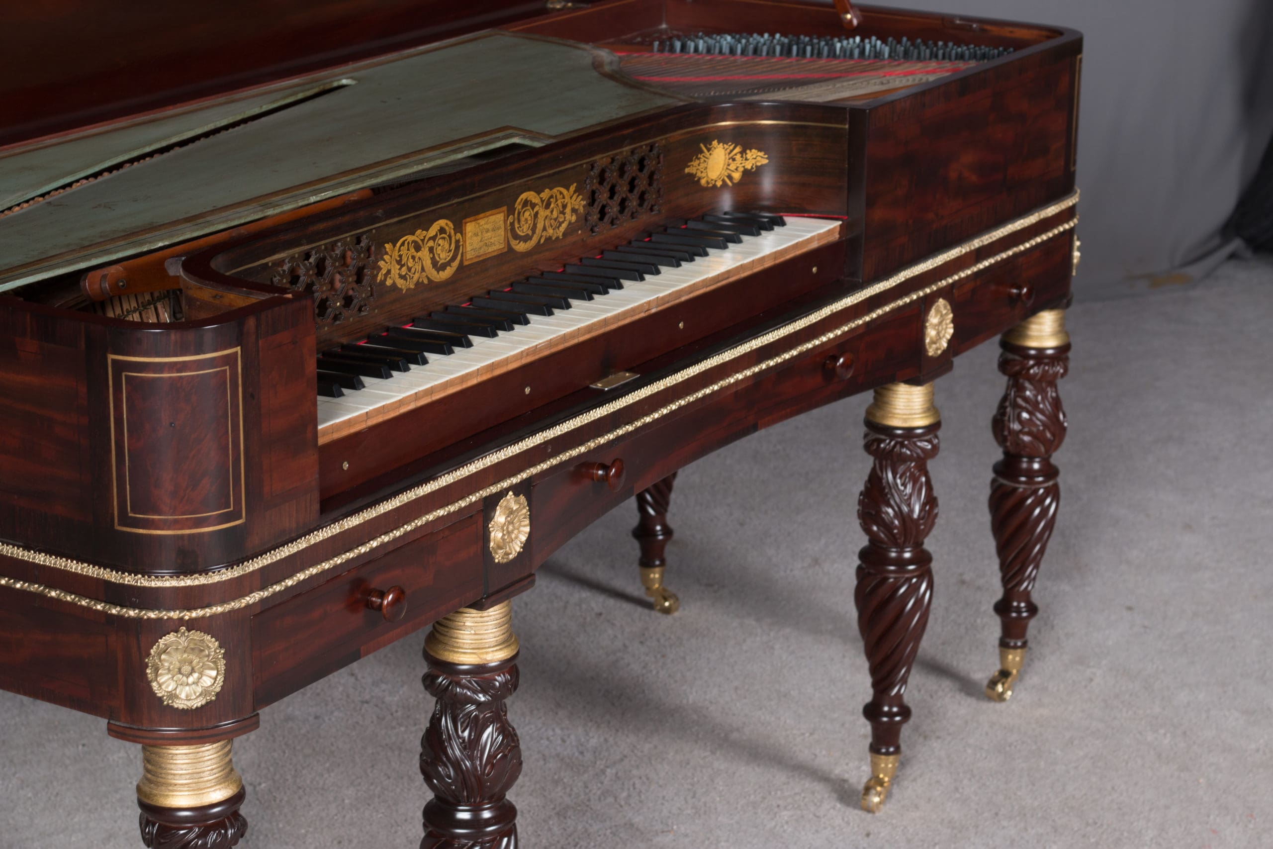 The instrument is made of exotic grained flame mahogany wood with beautifully inlaid marquetry and ormolu accents. It still retains its original ivory and ebony keyboard which is in perfect condition after 185 years!