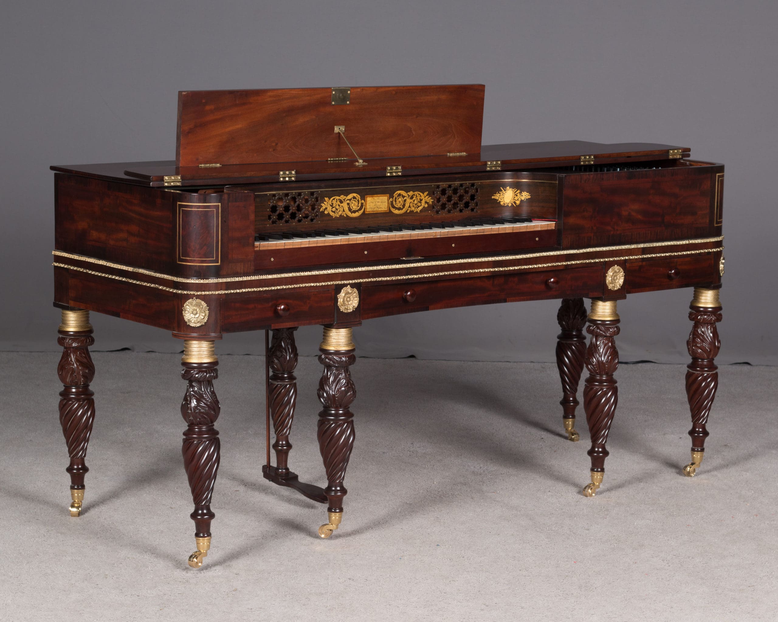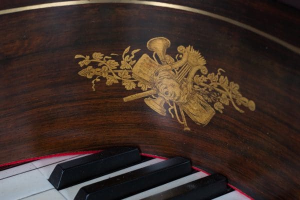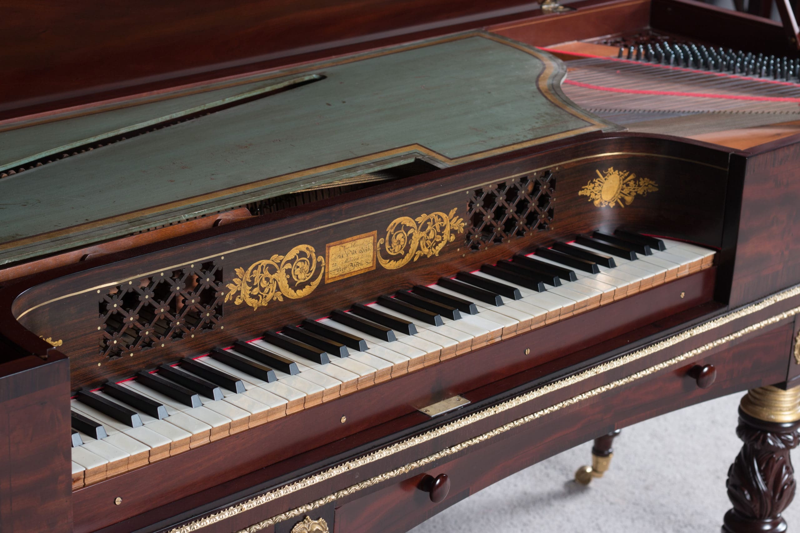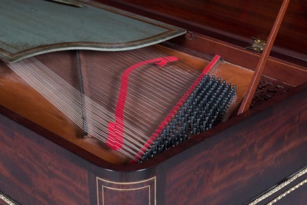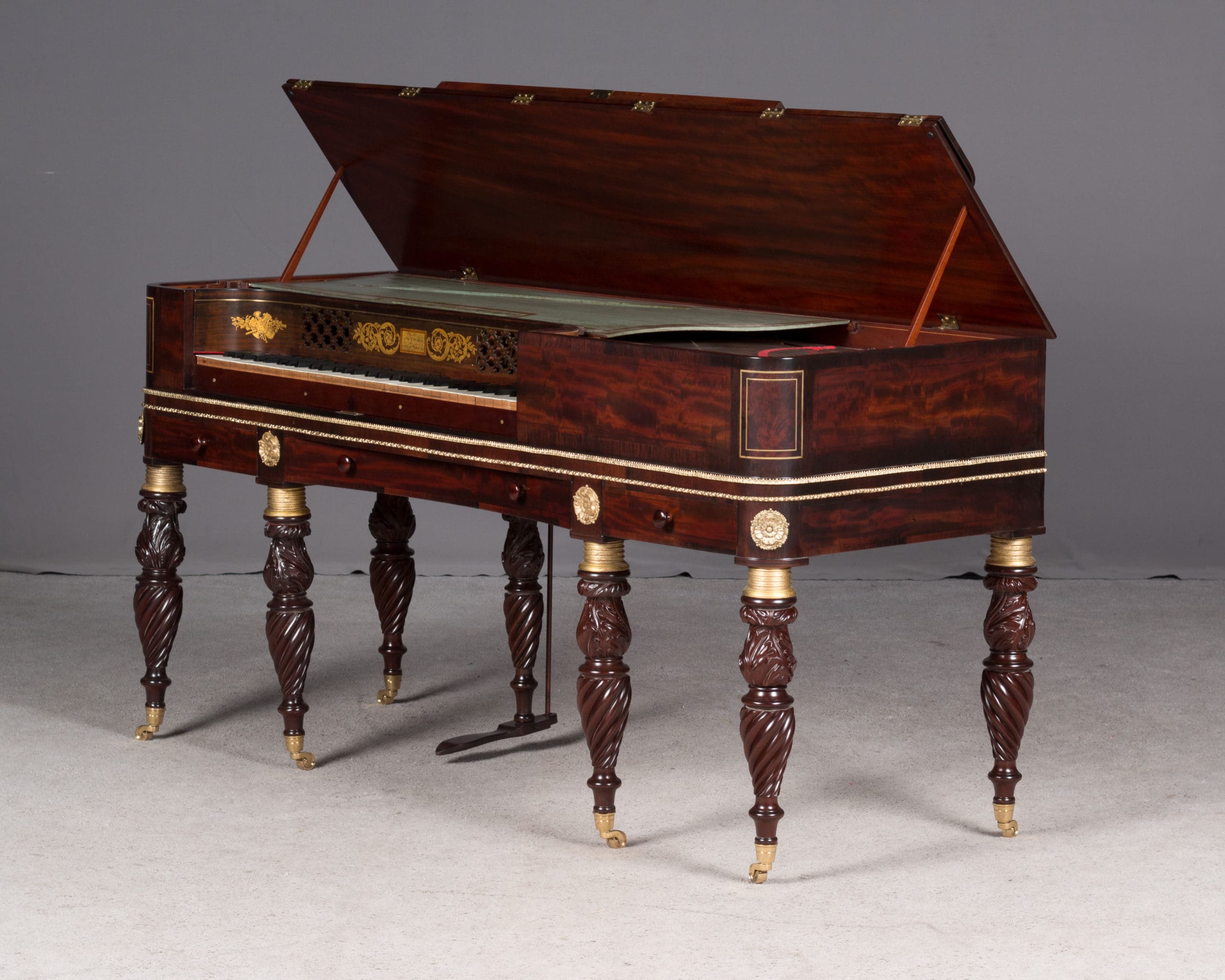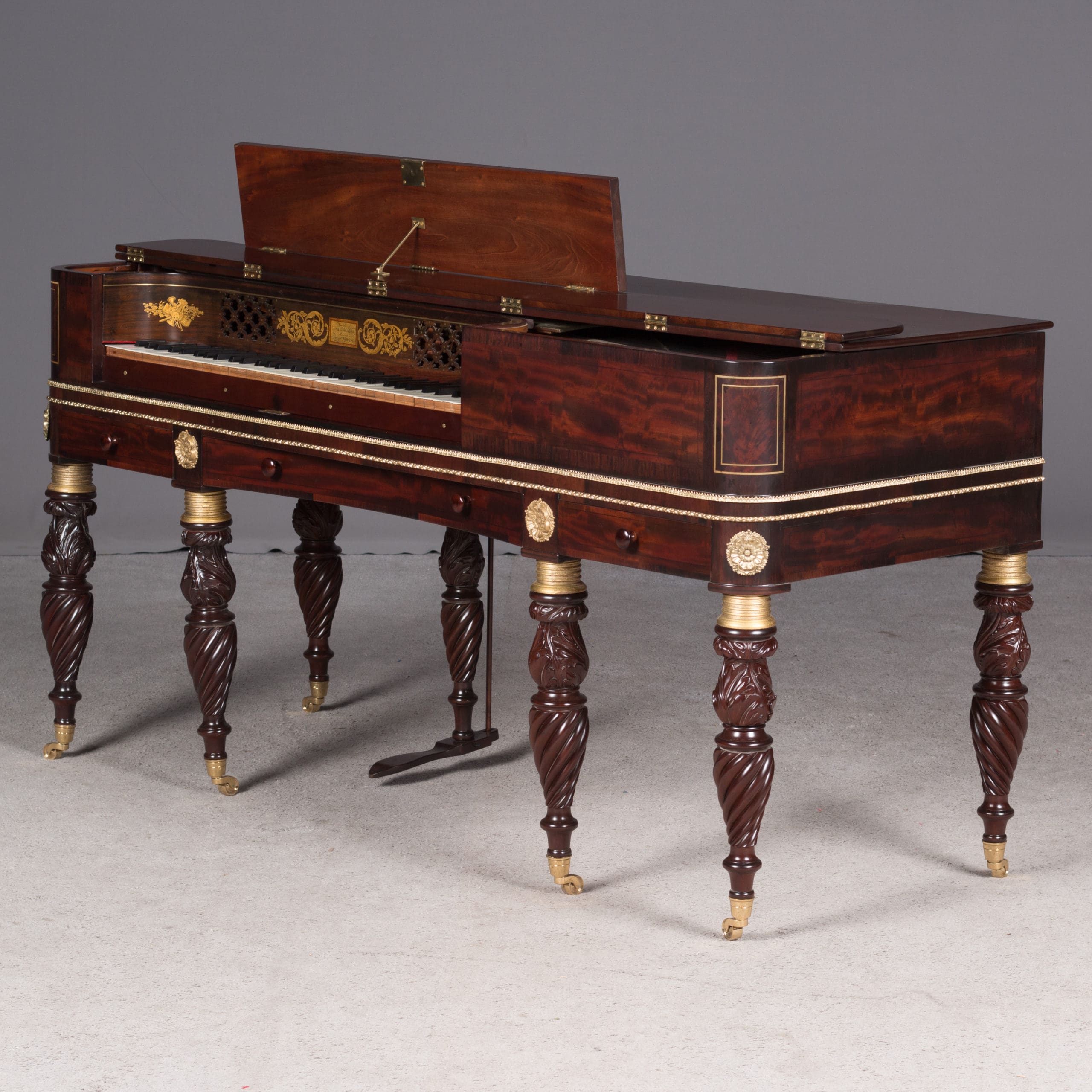 The instrument is made of exotic grained flame mahogany wood with beautifully inlaid marquetry and ormolu accents. It still retains its original ivory and ebony keyboard which is in perfect condition after 185 years!