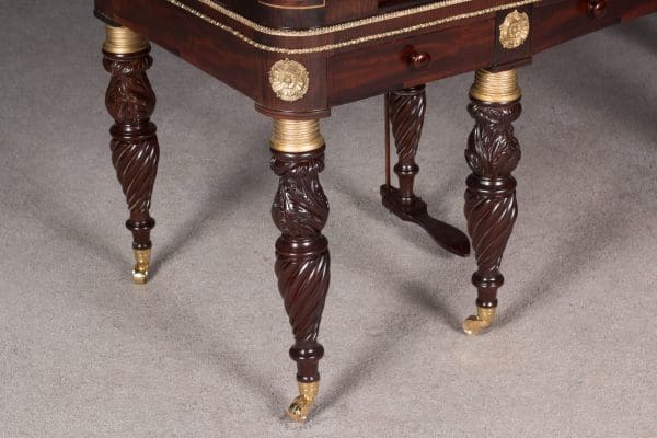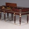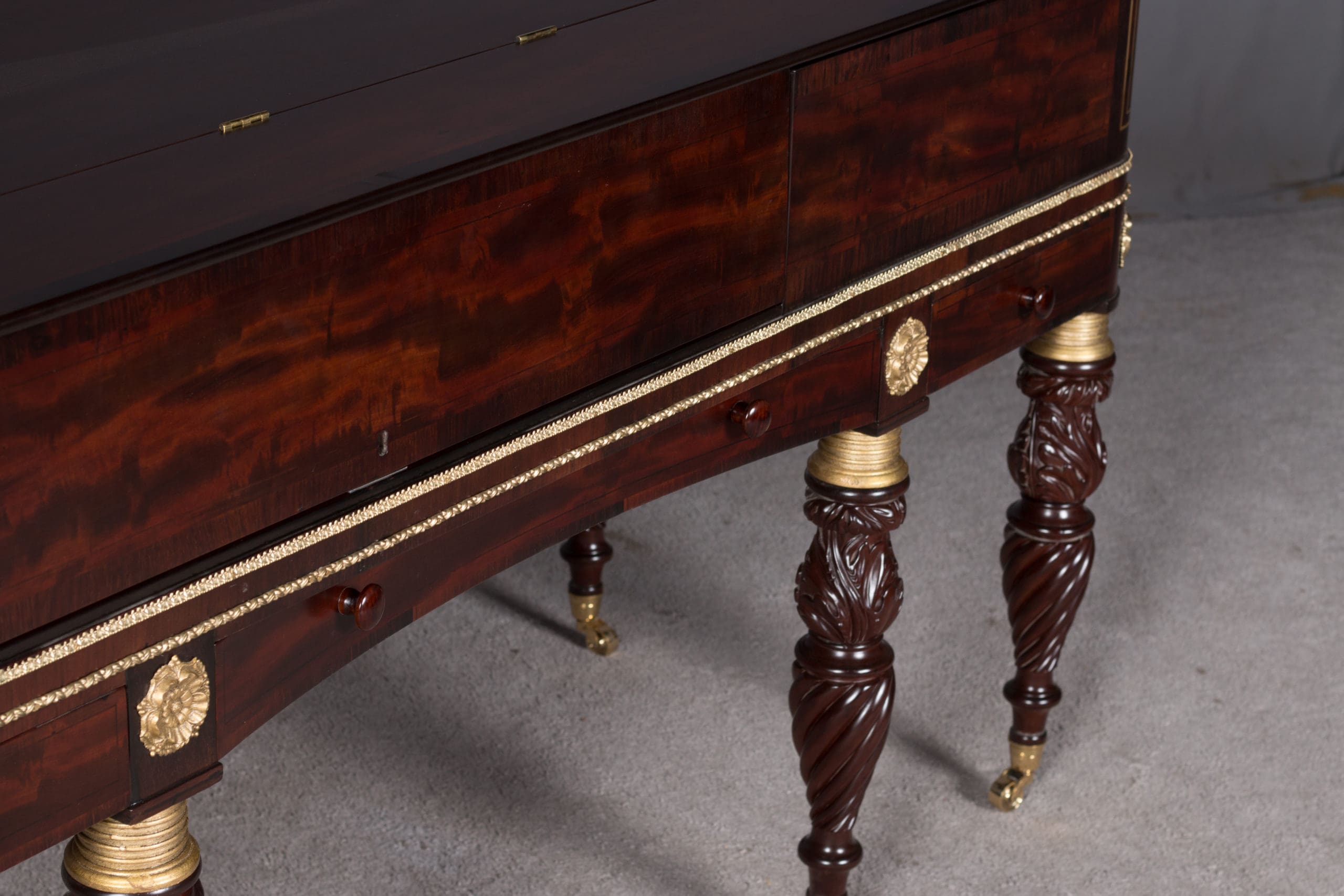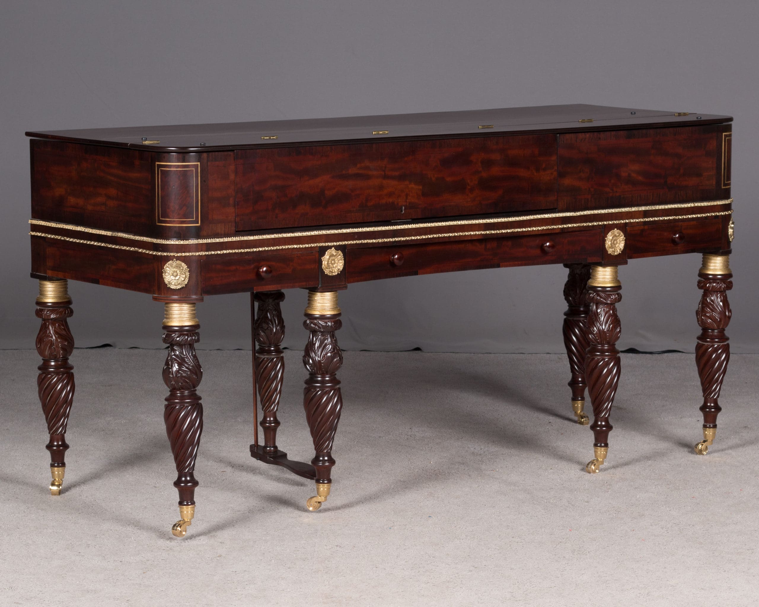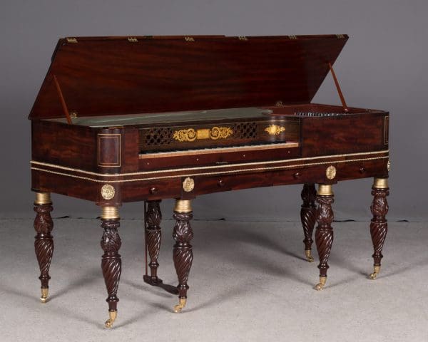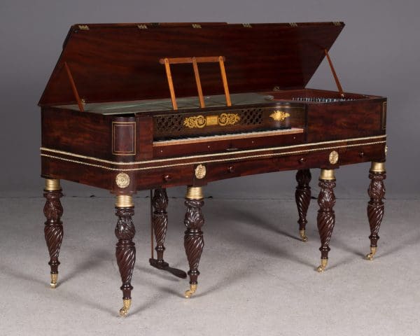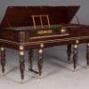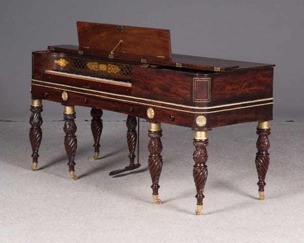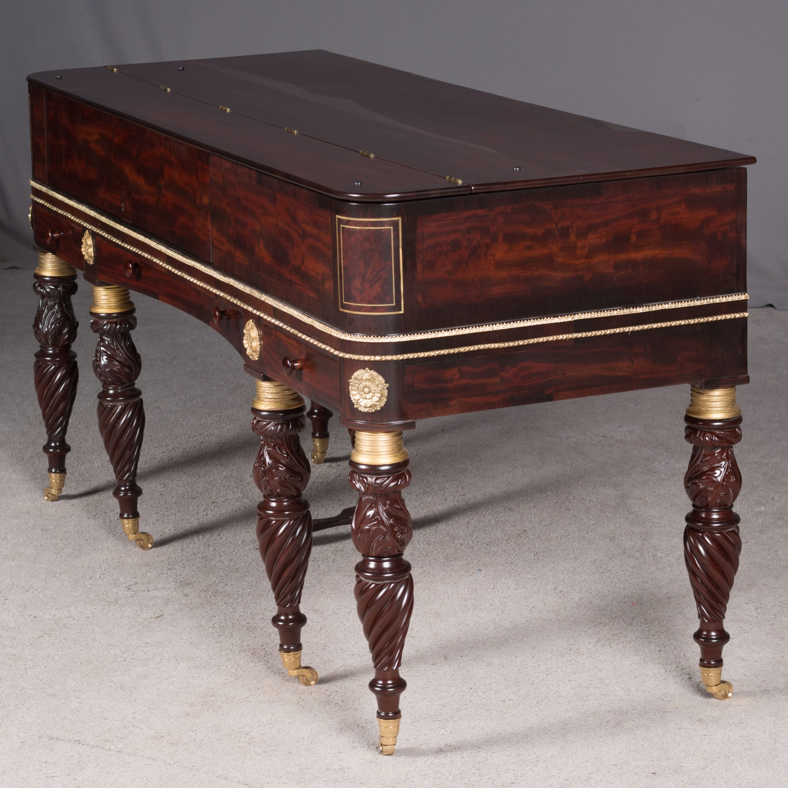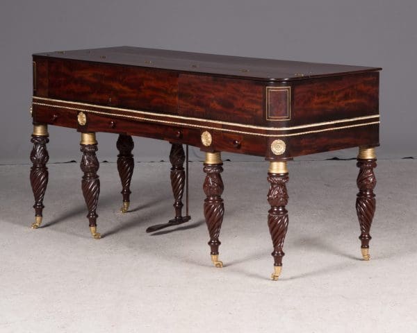 The instrument is made of exotic grained flame mahogany wood with beautifully inlaid marquetry and ormolu accents. It still retains its original ivory and ebony keyboard which is in perfect condition after 185 years!
